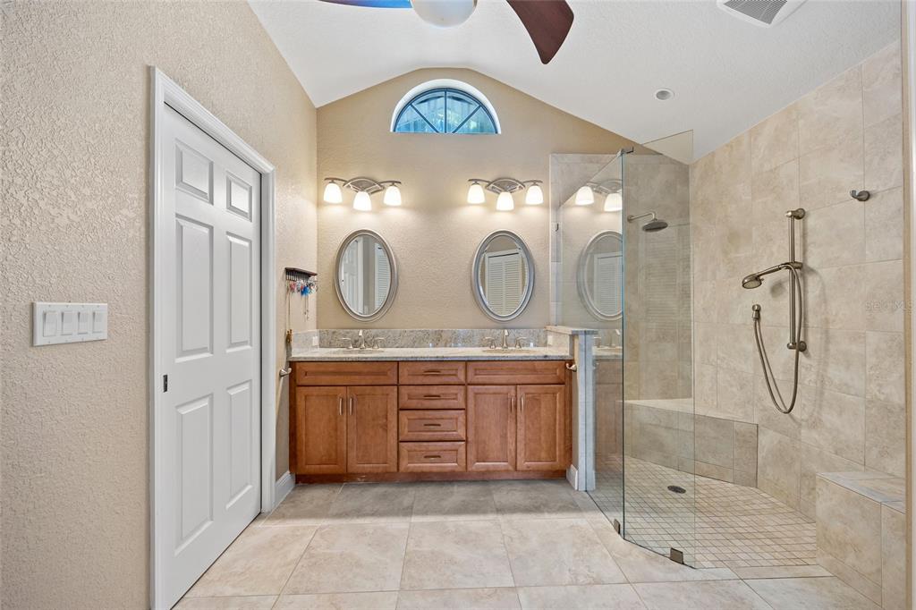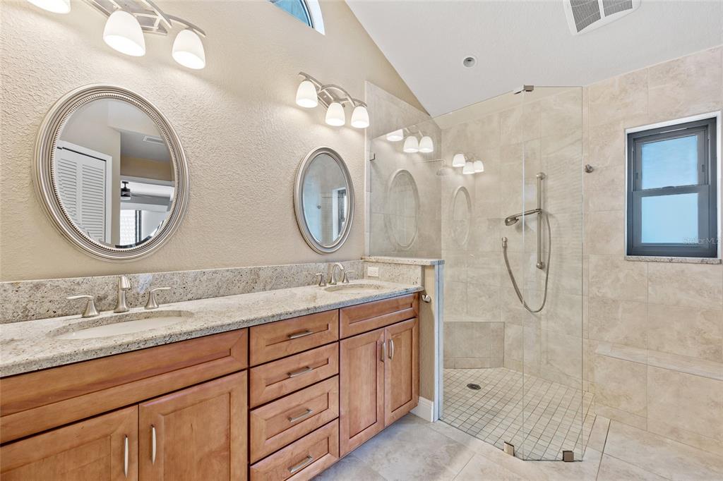 Split Bedroom Walk-In Closet(s)Ceiling Fan(s) High Ceilings Stone Counters Thermostat Open Floorplan Window Treatments Solid Surface Counters Primary Bedroom Main FloorCathedral Ceiling(s)Exterior Features: