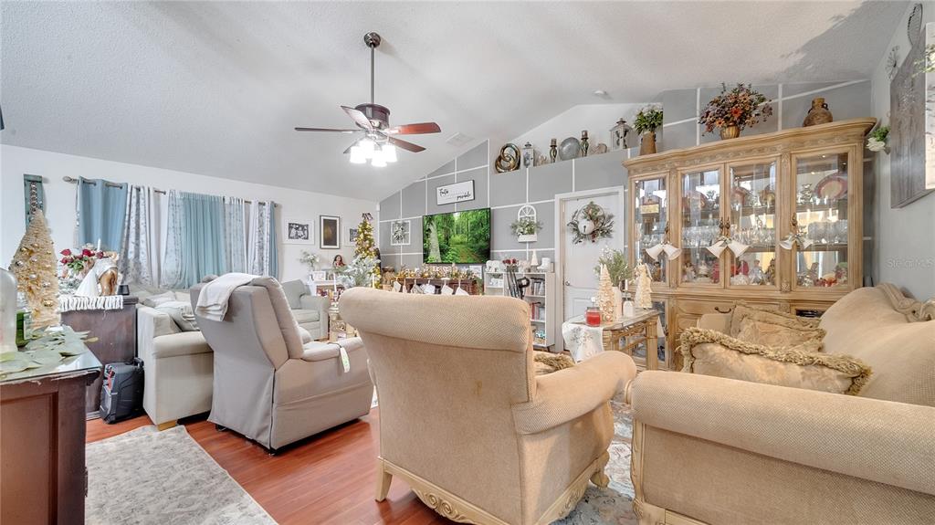 Vaulted Ceiling(s)Ceiling Fan(s) High Ceilings Thermostat Solid Wood CabinetsCrown MoldingExterior Features:
