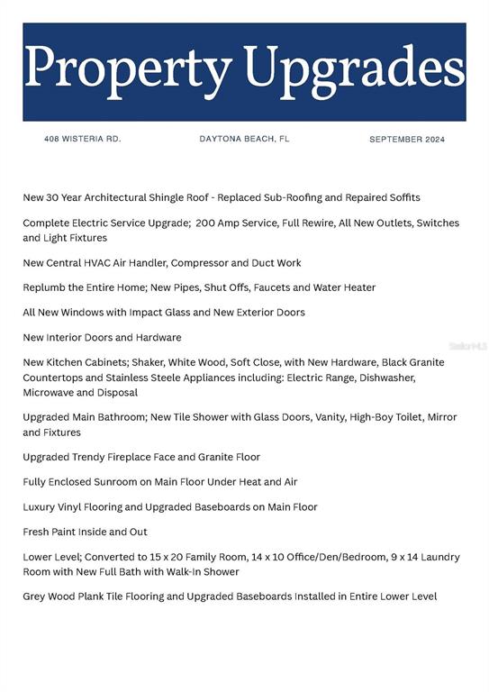 Turnkey beach house - waiting for you! this beautifully renovated 2-story concrete block home is just a block away from the beach. the home has been completely updated from the rooftop down, featuring all new modern upgrades including but not limited to new electric service and fixtures, new plumbing and fixtures, new hvac system, plus new hurricane-rated impact windows and doors were added for that extra peace of mind. as you step through the front door into the upper level you will find a bright and airy open concept living, dining, kitchen space, all beautifully updated and highlighted by a stunning fireplace. there is also a separate sunroom under heat and air that is filled with natural light —ideal for year-round enjoyment. additionally, two spacious bedrooms and a beautiful main bath complete this level. downstairs, you’ll find a large family room, and a versatile room that can serve as an office, bedroom, or den, along with a huge laundry room with a full bath. the lower level even has its own entrance, making it perfect for a home-based business or guest suite. situated high on a dune, this home offers great views from the front porch of the charming ocean dunes neighborhood. the large backyard has unlimited potential for you to add your touches and complete your beachside oasis. located just steps from the sandy shores, you'll also be near the riverfront esplanade, downtown, the boardwalk and most of the other daytona beach attractions. whether you're seeking a primary residence or a vacation retreat, this home has it all. don't miss the chance to make this your beachside haven—schedule your visit today! there are no warranties expressed or implied. all measurements are approximate. square footage received from tax rolls. all information recorded in the mls intended to be accurate but cannot be guaranteed. buyers should check city zoning for rental restrictions.408 WISTERIA, DAYTONA BEACH, FL 32118