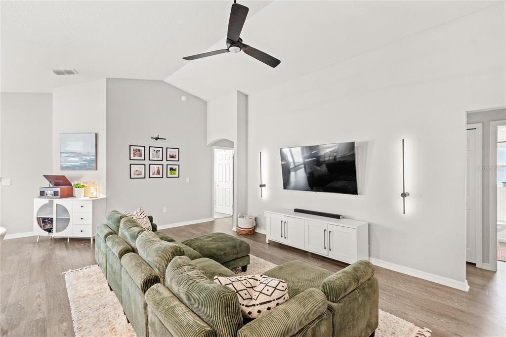 Split Bedroom Walk-In Closet(s) Vaulted Ceiling(s)Ceiling Fan(s) Eating Space In Kitchen High Ceilings Living Room/Dining Room Combo Thermostat Open Floorplan Solid Surface Counters Kitchen/Family Room ComboExterior Features: