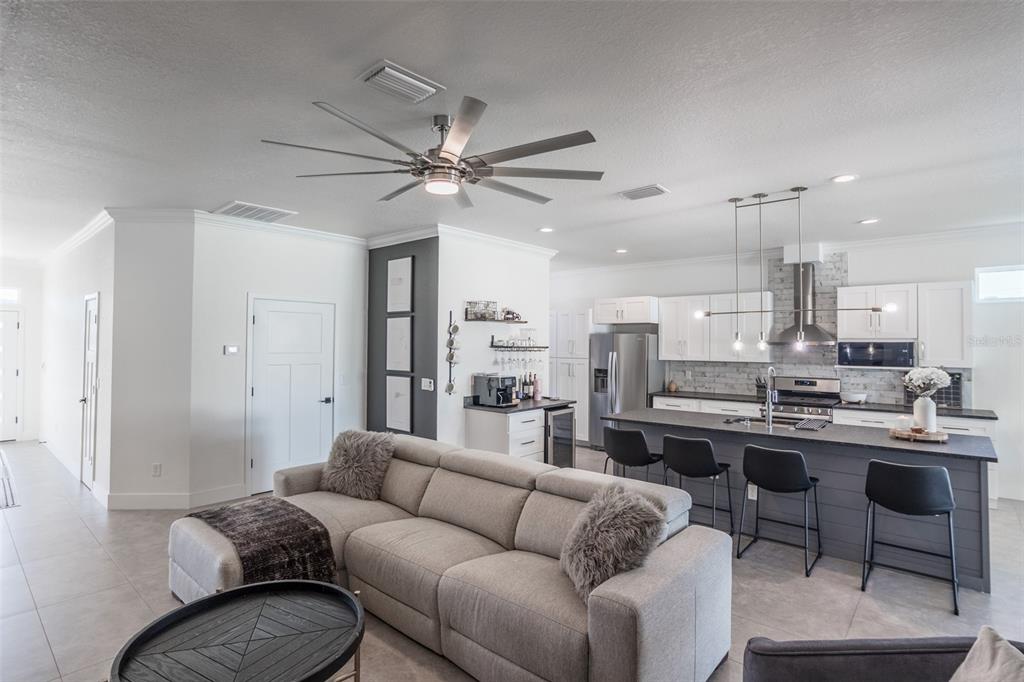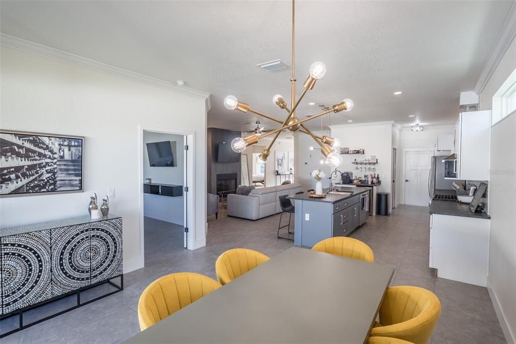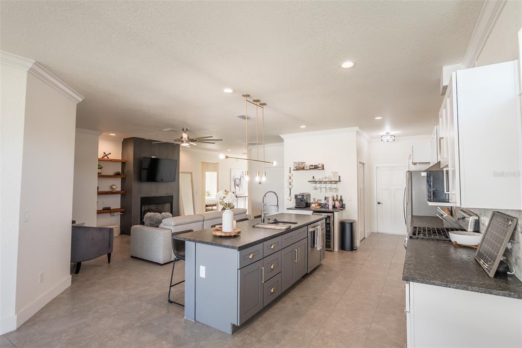 Built-in Features Walk-In Closet(s)Ceiling Fan(s) Eating Space In Kitchen High Ceilings Stone Counters Open Floorplan Solid Surface CountersCrown Molding Primary Bedroom Main Floor Kitchen/Family Room ComboCathedral Ceiling(s) Dry BarExterior Features: