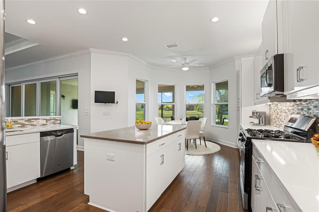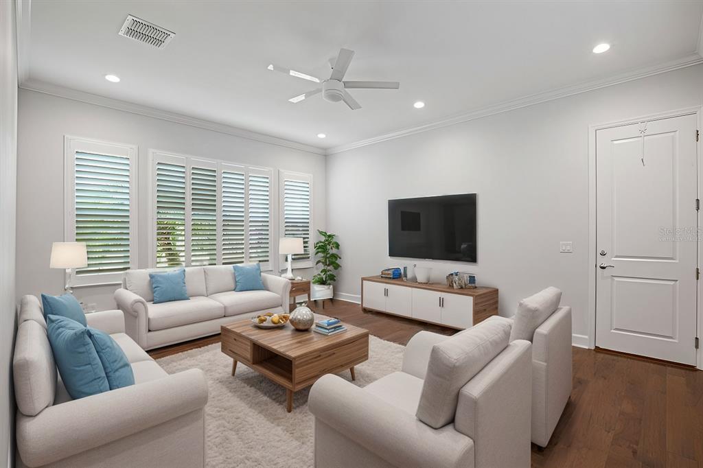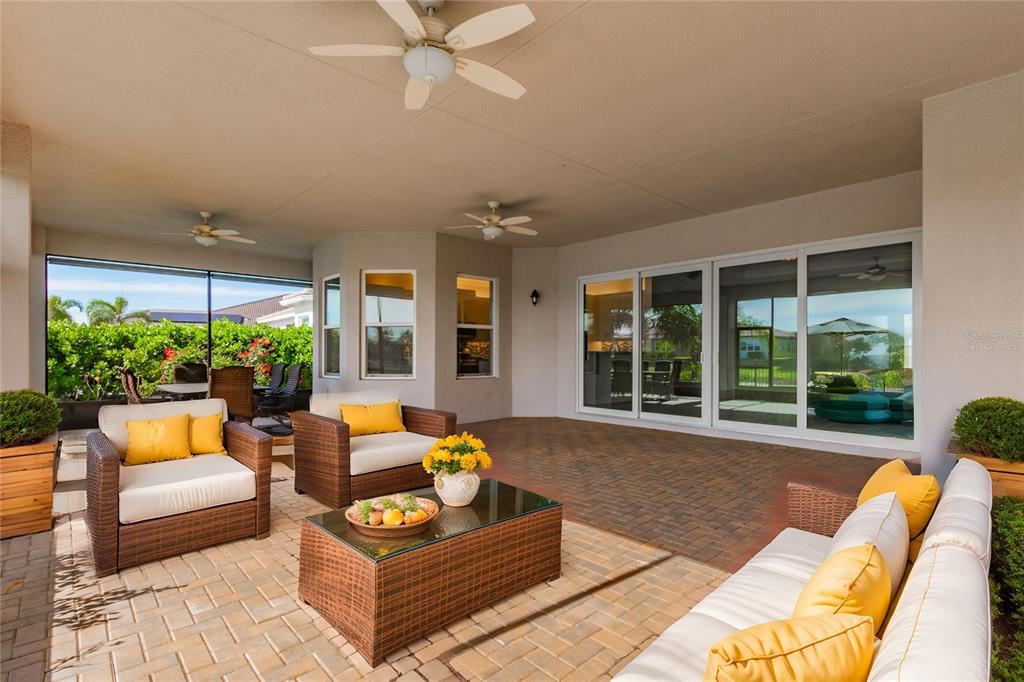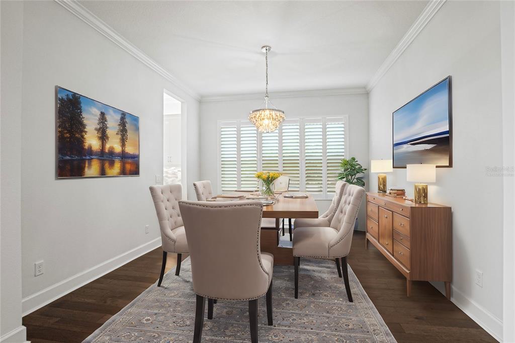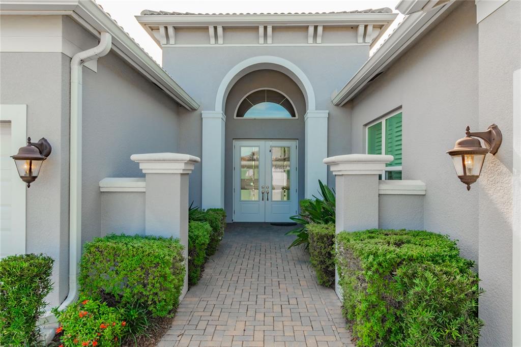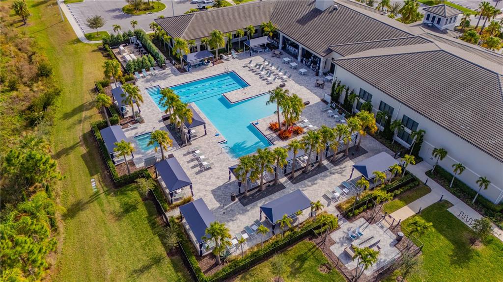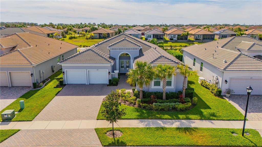 One or more photo(s) has been virtually staged. this luxurious carlyle model home, located in the prestigious valencia del sol 55+ resort-style community, is the epitome of comfort and sophistication. spanning 3,072 square feet, this home features 3 spacious bedrooms, a generous club room, 3.5 bathrooms, and a 3-car garage. its prime location within walking distance of the community's 25,000 sq. ft. clubhouse and amenities further enhances its appeal. upon entering through decorative double impact glass doors, you’re greeted by stunning 16-ft coffered ceilings, a designer chandelier, crown molding, and engineered hardwood flooring throughout the main living areas. the open-concept design connects the great room to the gourmet kitchen, casual dining, and formal dining areas, creating a spacious and inviting atmosphere. the great room is complemented by a double-coffered ceiling and large 8-ft impact glass sliders that open to the extended, covered screened lanai with serene water views, ceiling fans, and lighting, offering an ideal space for relaxation or entertaining. this lanai is unique, as it’s built into the roofline for maximum useable indoor/outdoor living space and includes an outlet for a future spa. the modern kitchen is a chef’s dream, boasting a large center island, quartz countertops with an 18-inch serving bar, 42-inch high gloss cabinets, a designer backsplash, stainless steel appliances, and more. the formal dining room, situated adjacent to the kitchen, is perfect for hosting special occasions and features a luxurious crystal chandelier. the primary suite is a private retreat, featuring a coffered ceiling, two walk-in closets, a sitting bay, and an exterior door leading to a private water view. the ensuite bathroom offers separate vanities, quartz countertops, a walk-in shower with a built-in seat and frameless glass, and a roman tub with a panel surround. the home is designed with privacy in mind, with the second and third bedrooms each having their own bathrooms. the spacious club room provides additional living space and direct access to the third-car garage. the well-appointed laundry room includes ample storage, a utility sink, and a folding counter with cabinets. notable features include solar panels (keeping the average monthly power bill at about $25), impact glass windows and doors, a fenced backyard, tankless gas water heater, central vacuum system, custom window treatments, and an epoxy garage floor. valencia del sol offers unparalleled resort-style 55 plus living, with a saltwater pool, fitness center, tennis courts, pickleball, bocce ball, dog park, arts and crafts, live shows, a bistro and much more. don't forget to tour the community clubhouse to fully appreciate the amenities this incredible lifestyle offers.4919 PAMPLONA, WIMAUMA, FL 33598