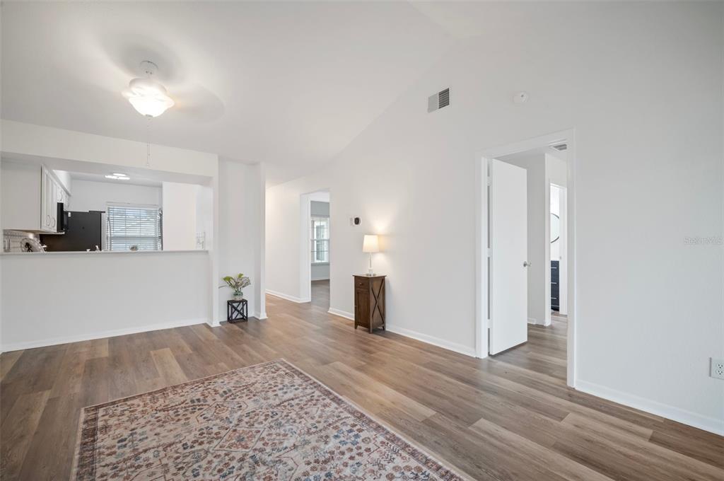 Vaulted Ceiling(s)Ceiling Fan(s) High Ceilings Living Room/Dining Room Combo Stone Counters Solid Surface Counters Solid Wood CabinetsCathedral Ceiling(s)Exterior Features: