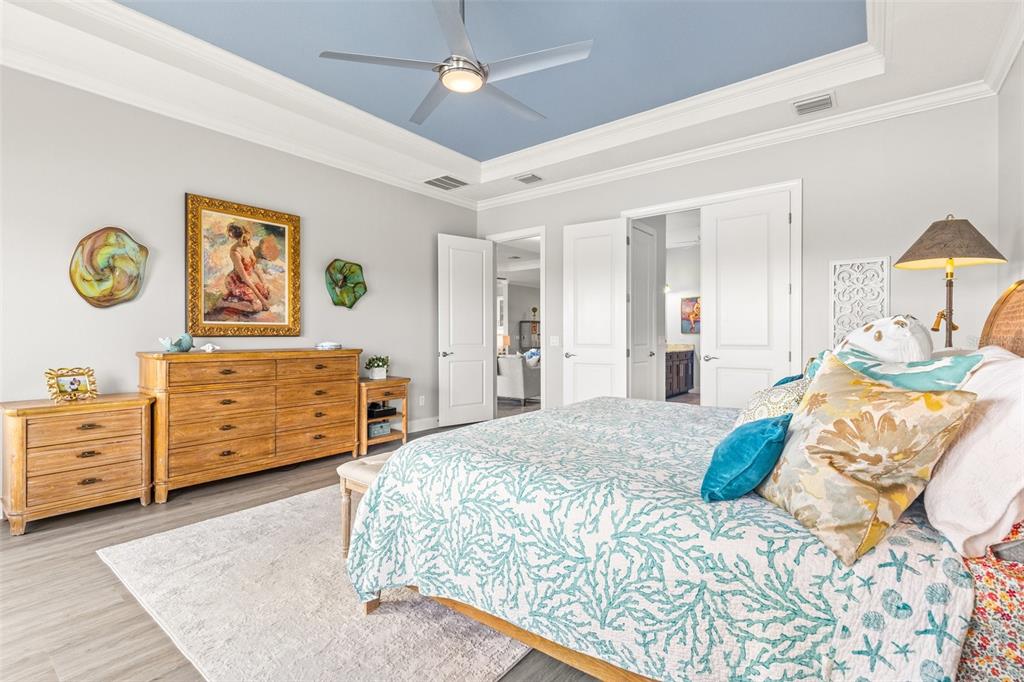 Split Bedroom Walk-In Closet(s)Ceiling Fan(s) High Ceilings Open Floorplan Solid Surface Counters Solid Wood CabinetsCrown Molding Primary Bedroom Main Floor Tray Ceiling(s)Exterior Features: