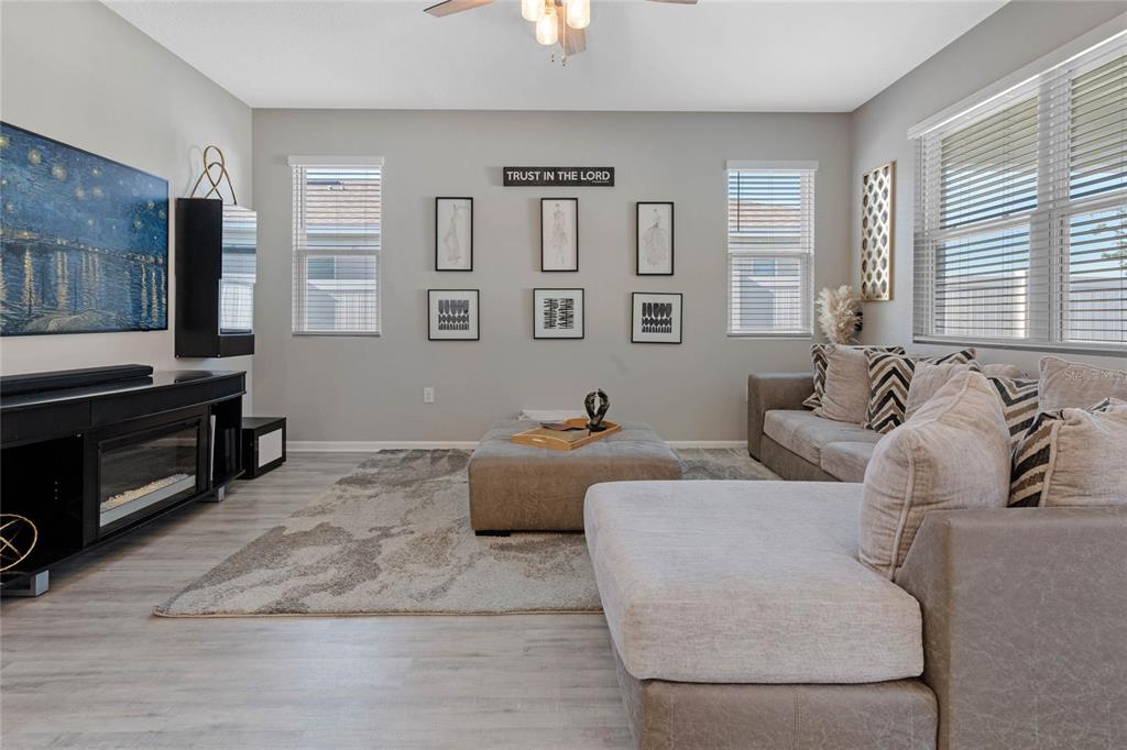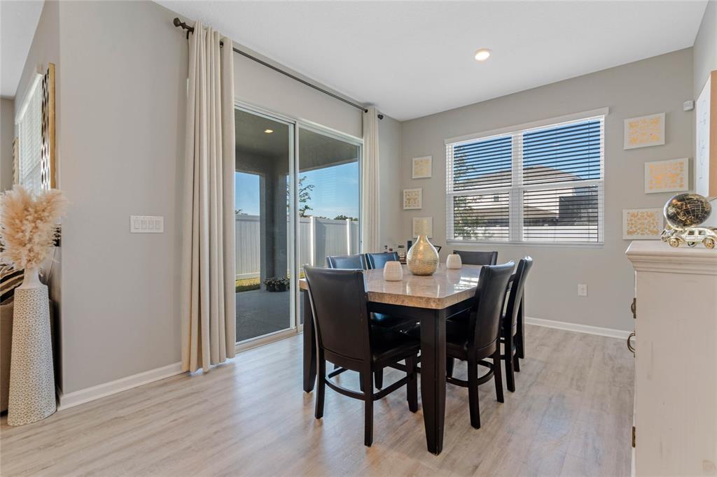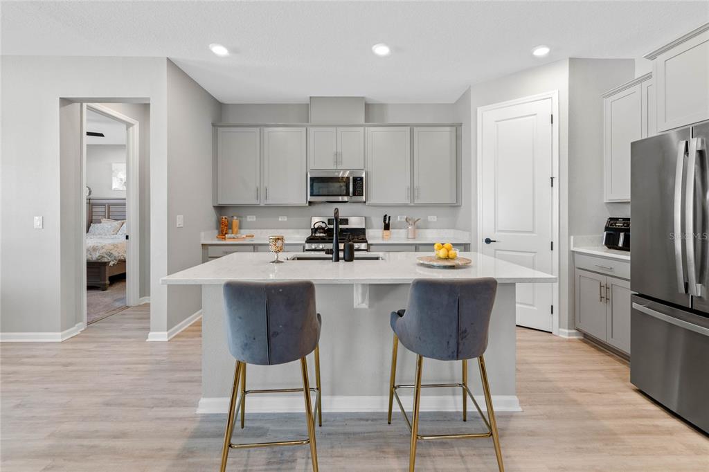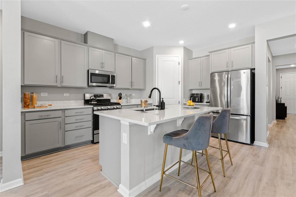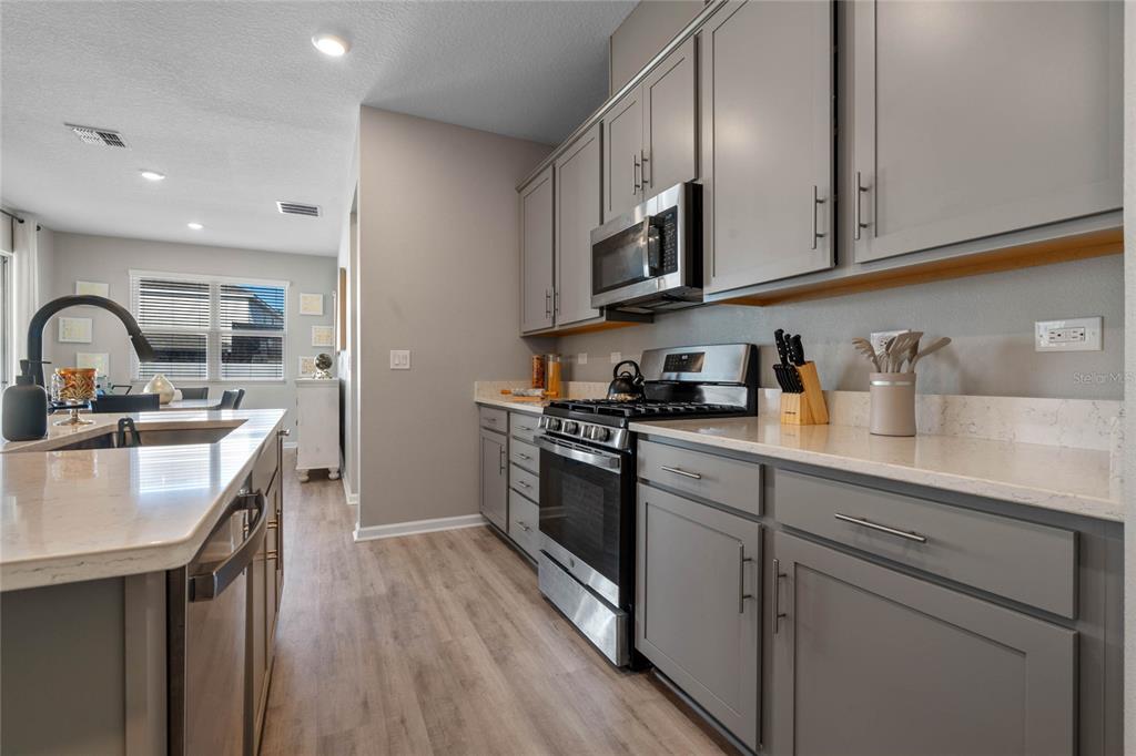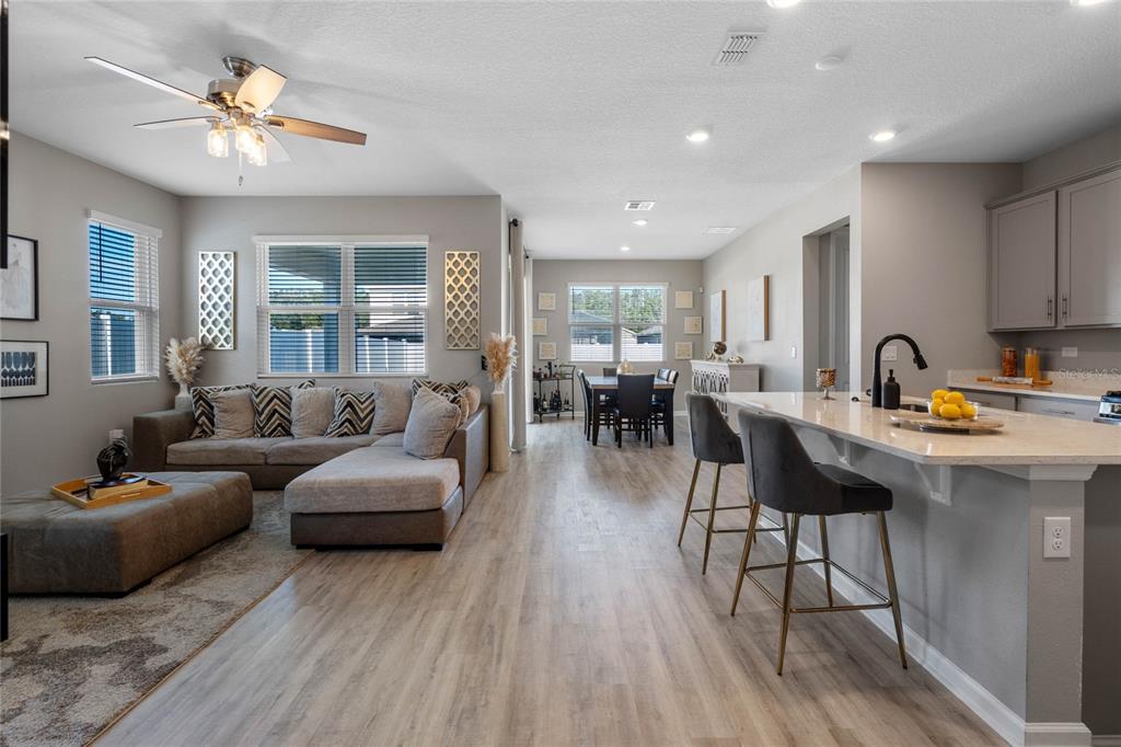 Welcome to your dream home! this like-new, beautifully designed 3-bedroom, 2-bath home seamlessly blends modern style with functionality. the main living areas feature luxury vinyl plank flooring, creating a warm and inviting atmosphere. the kitchen is a chef's delight, boasting ample cabinet space, quartz countertops, stainless steel appliances, and the convenience of natural gas for cooking. open-concept living connects the kitchen to the family and dining areas, perfect for entertaining. the primary suite is a serene retreat with a chic mirrored barn door leading to a luxurious ensuite featuring dual vanities, a spacious shower, and a newly custom-designed closet. a built-in homework/office nook off the laundry room adds practical charm. enjoy the partially fenced backyard with privacy and potential for fully fenced yard. sip your morning coffee on the cozy covered porch. ideally located just 2 minutes from shopping, dining, and grocery stores and only 7 minutes to the turnpike. this home offers convenience without the hustle and bustle. the community playground across the street is an added bonus for families. barely lived in and move-in ready—this home is waiting for you to make it yours!5047 MDW SONG, OKAHUMPKA, FL 34762
