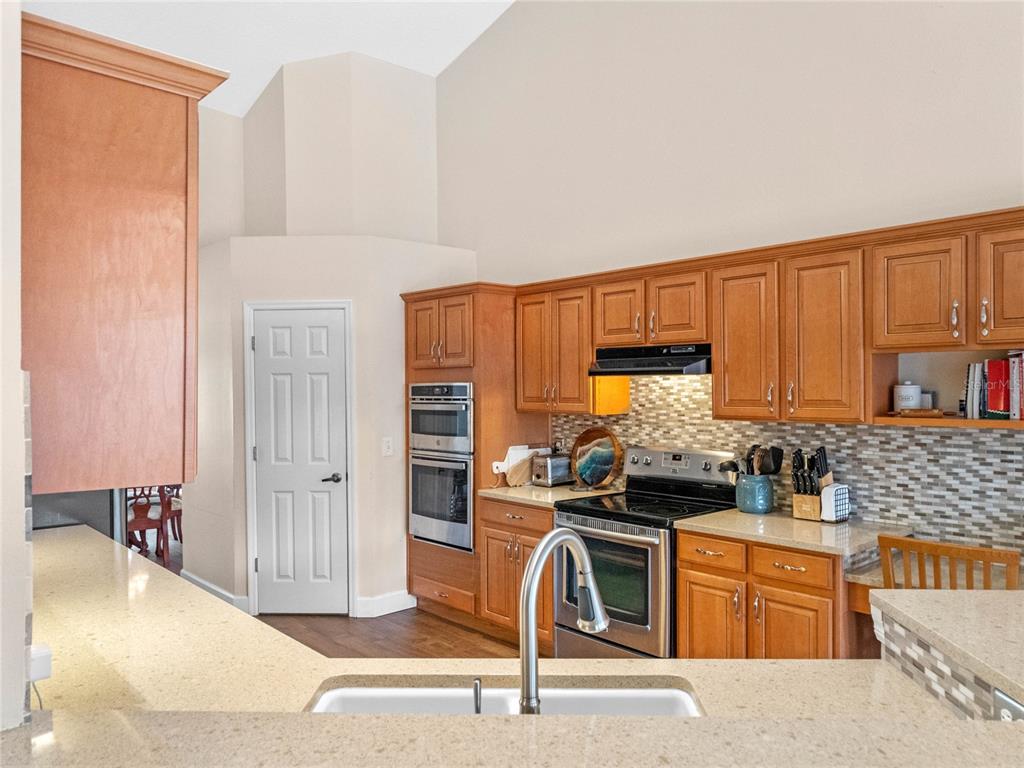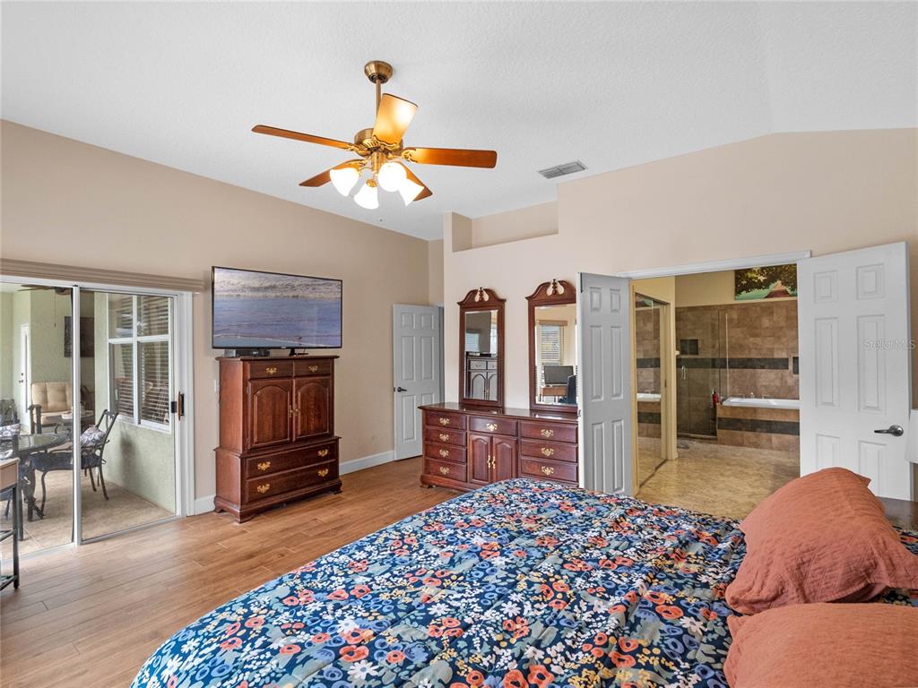 Split Bedroom Walk-In Closet(s) Vaulted Ceiling(s)Ceiling Fan(s) Eating Space In Kitchen High Ceilings Stone Counters Thermostat Open Floorplan Solid Surface Counters Solid Wood CabinetsCrown Molding Primary Bedroom Main FloorExterior Features: