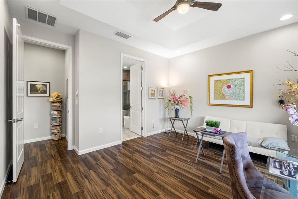 Split Bedroom Walk-In Closet(s)Ceiling Fan(s) High Ceilings Living Room/Dining Room Combo Thermostat Open Floorplan Window Treatments Solid Surface Counters Solid Wood Cabinets Tray Ceiling(s)Exterior Features: