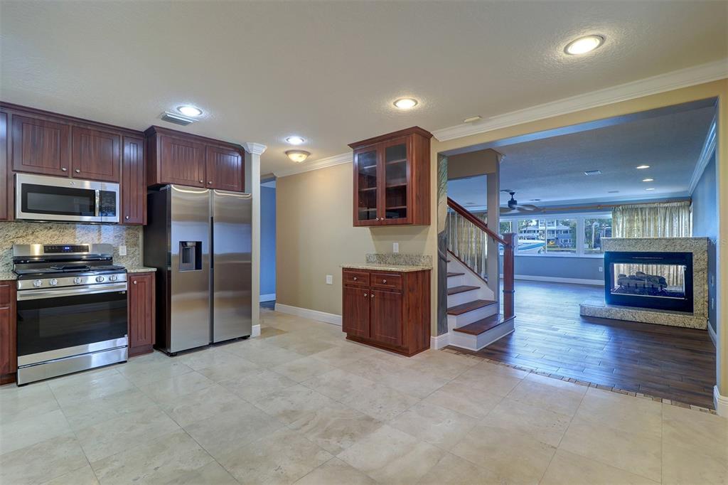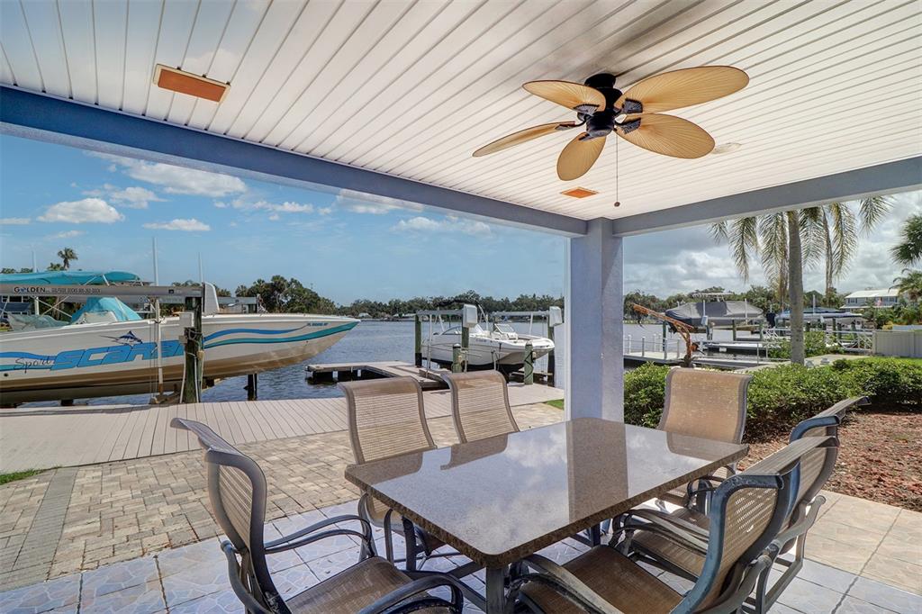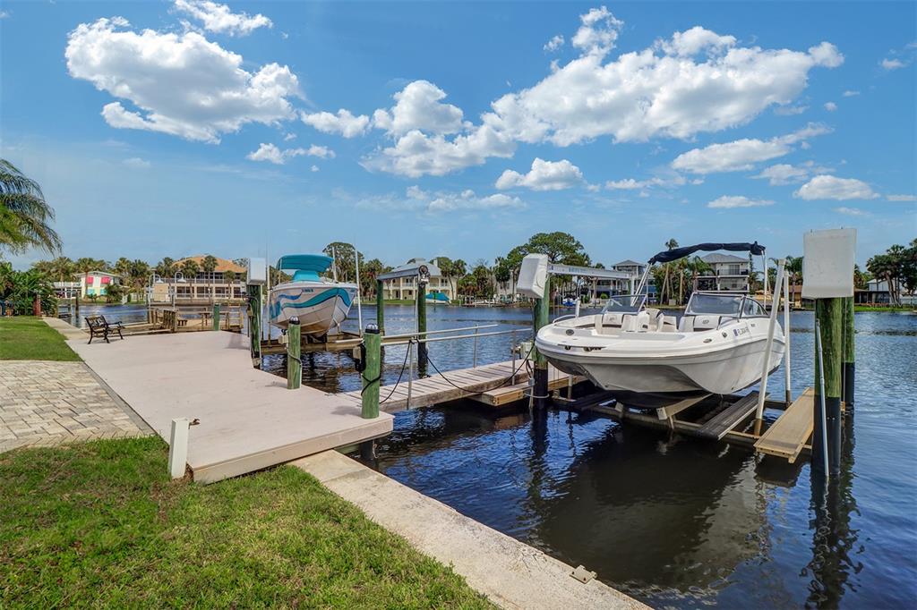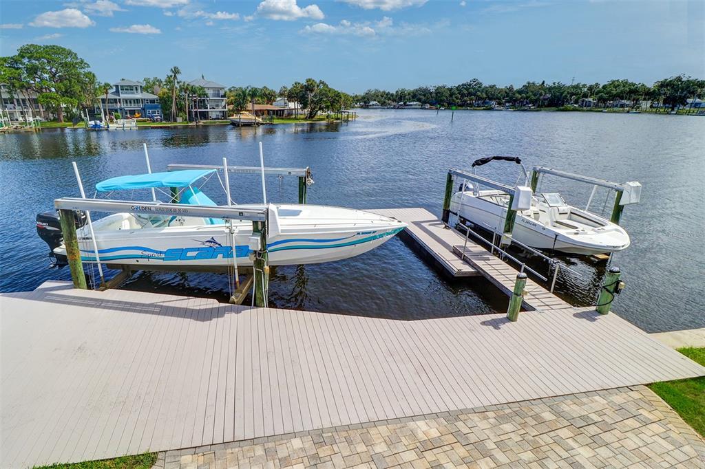 Discover this stunningly renovated cotee riverfront residence with 65 feet of composite board dock, a floating dock, two boat lifts, (24,000/8,000 pds) and a paver lounge area, this home offers unparalleled access to the ever-active cotee river. a spacious 20x30 oversized garage with extra storage accommodates all your toys, complemented by an additional paved parking area and a 10x9 finished storage space with stylish c-tile flooring. the garage houses a full bath/laundry room, complete with c-tile flooring, granite counters, and a walk-in shower. modern oversized 15x13 updated gourmet kitchen boasts 36-inch cabinets, soft-close drawers, granite countertops, and new appliances, including a coveted gas range. c-tile and wood-grain composite flooring extend throughout, blending durability with elegance. enjoy the breathtaking panoramic views of the cotee river from the expansive 33x25 great room, featuring a gas fireplace. the adjoining 16x15 dining area opens onto a 16x15 covered lanai, perfect for seamless indoor-outdoor living and entertaining by the river. two spacious bedrooms on the main level provide comfort and convenience. upstairs, the luxurious 15x32 ensuite offers a gas fireplace, an adjacent 15x15 private sitting area, and exclusive access to an 18x12 observation platform for stunning river vistas. the ensuite bathroom showcases a wraparound walk-in shower and dual c-tile sinks. a durable metal roof ensures peace of mind. equipped with two ac units for optimal climate control. with three bedrooms, three baths, and 2,800 sq. ft. of refined living space, this home redefines modern riverfront living. and best of all, enjoy the golf cart friendly always active downtown new port richey with many upscale restaurants and unending riverfront activities for the whole family.5449 MANATEE PT, NEW PORT RICHEY, FL 34652