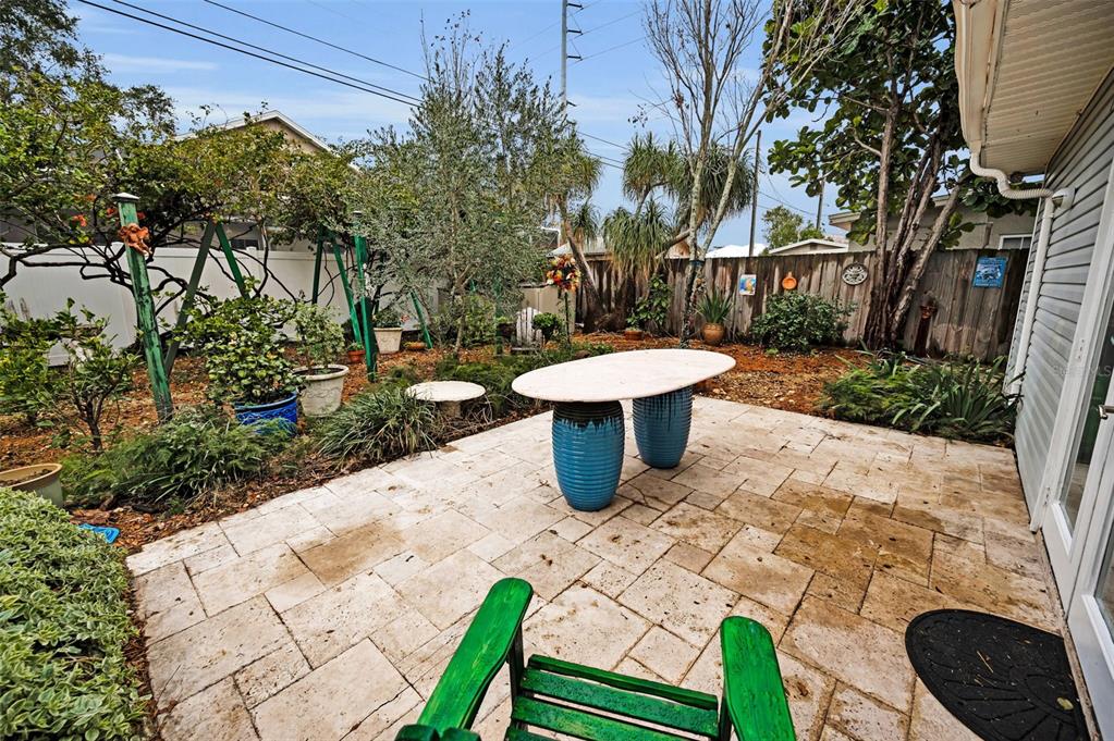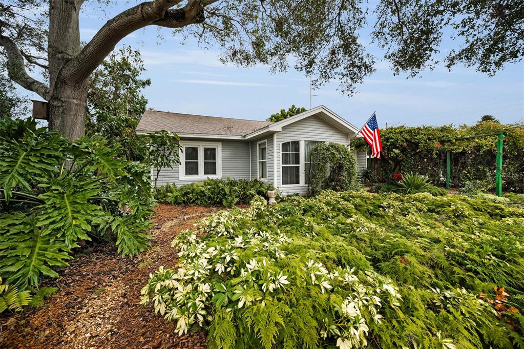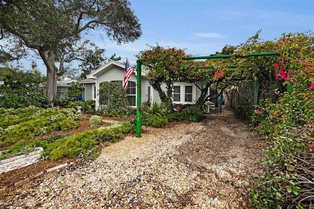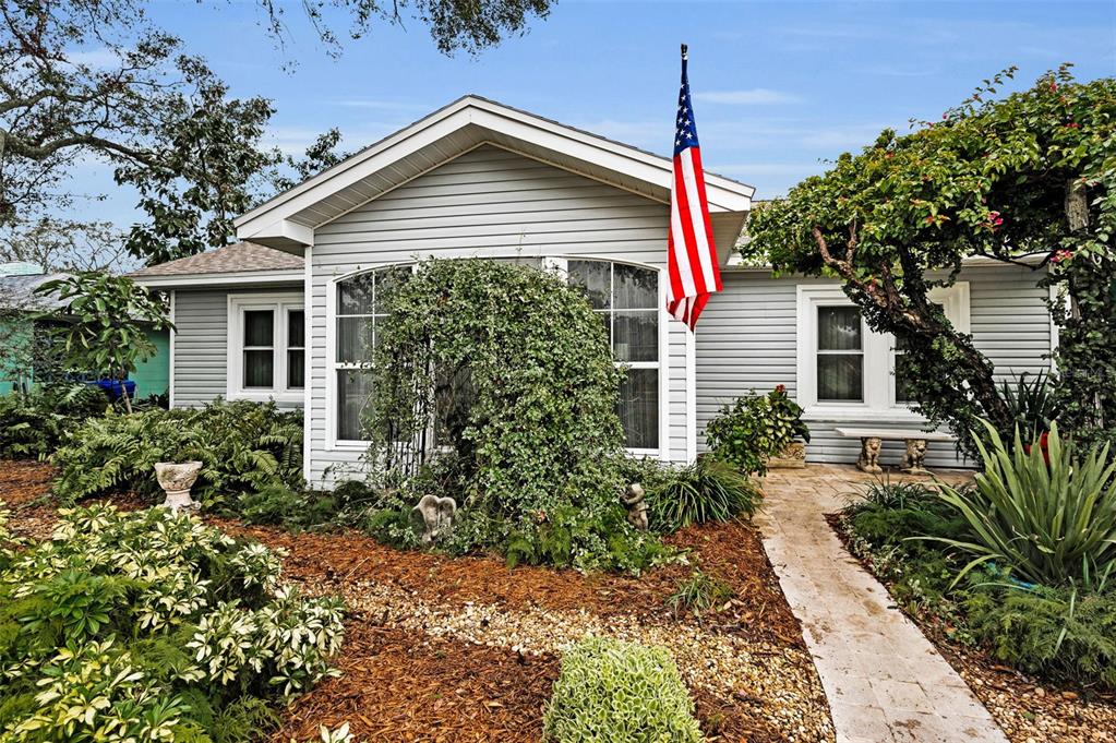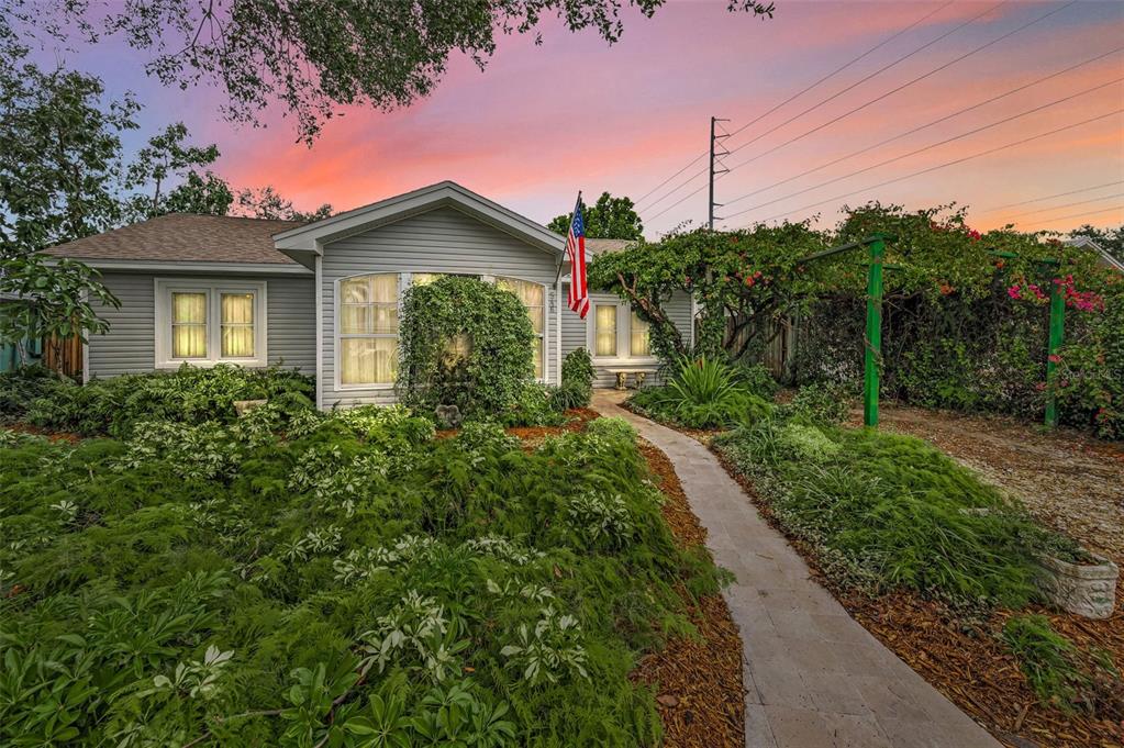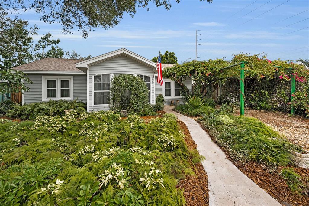 This charming mid-century home offers a blend of classic florida architecture and mediterranean-inspired landscaping. nestled on a picturesque brick-lined street, the property is part of a neighborhood experiencing signifcant revitalization, with new homes that complement the established character. the property boasts rich, mature vegetation, including a bougainvillea arbor that provides shade and vibrant color. the garden features a variety of flowers and fruit tress, such as avocado, orange and lemon trees, evoking the ambience of a mediterranean retreat. a serpentine-shaped travertine walkway and patio lead to the entrance, enhancing the italian villa feel. upon entering through a leaded glass door, you're welcomed into a sunlight-filled sunroom. the home features brazilian walnut porcelain plank tiles, complimented by high baseboards.the centrally located kitchen ensures easy traffic flow, with a split bedroom floorplan offering privacy. the primary bedroom with en-suite bath and soaring cathedral ceilings is infused with natural light. the dining and great rooms adjacent to the kitchen provide views of the patio and expansive garden. extra bonuses, all 3 bedrooms have hurricane impact rated windows and a whole house water softening system with reverse osmosis in the kitchen. the home's prime location offers convenient access to to several local attractions; intracoastal waterway: ideal for water enthusiasts. pinellas bike trail: a popular trail for biking and walking. dunedin library and senior center: community resources within walking distance. edgewater linear park: a scenic waterfront park nearby. downtown dunedin: a vibrant area with shops, restuarants, and cultural events. additionally, families will appreciate the proximty to local schools. this property offers a unique opportunity to own a piece of florida's mid-century charm, enhanced by thoughtful updates and a location that both provides tranqulity and convenience. don't miss the chance to experience this mediterranean-inspired paradise in the heart of dunedin.546 ORANGEWOOD, DUNEDIN, FL 34698