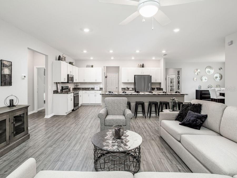 Under construction. new construction home with 2320 square feet on one-story including 4 bedrooms, 2 baths, and an open living area. enjoy an open kitchen with silestone countertops, samsung stainless steel appliances, a walk-in pantry, and a spacious counter height island, fully open to the dining café and gathering room. the living area, laundry room, and baths include luxury wood vinyl plank flooring, with stain-resistant carpet in the bedrooms. your owner's suite is complete with a walk-in wardrobe and a private en-suite bath with dual vanities, a tiled shower, and a closeted toilet. plus, enjoy a covered lanai, 2-car garage, custom-fit window blinds, architectural shingles, energy-efficient insulation and windows, and a full builder warranty. "please note, virtual tour/photos showcases the home layout; colors and design options in actual home for sale may differ. furnishings and décor do not convey.549 SILVER CRSE, OCALA, FL 34472