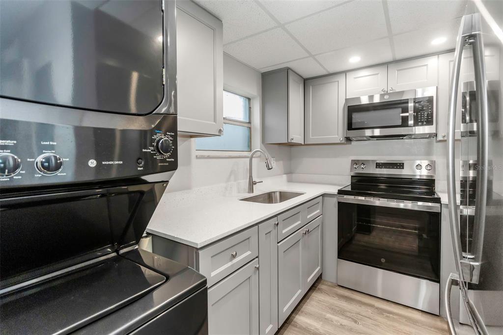 This stunning 2-bedroom, 1.5-bathroom condo has been completely remodeled and is move in ready! featuring a modern shaker-style kitchen with elegant quartz countertops and sleek stainless-steel appliances, this condo blends style and functionality perfectly. enjoy the fresh look of interior paint, luxury vinyl plank flooring, and plush carpet in the bedrooms. new interior stackable washer/dryer. no flood insurance required, and the property remained unaffected by recent hurricanes. located within walking distance to all that downtown new port richey has to offer-restaurants, bars, shops, parks, boat ramp, and entertainment.5645 TOWNHOUSE #5645, NEW PORT RICHEY, FL 34652