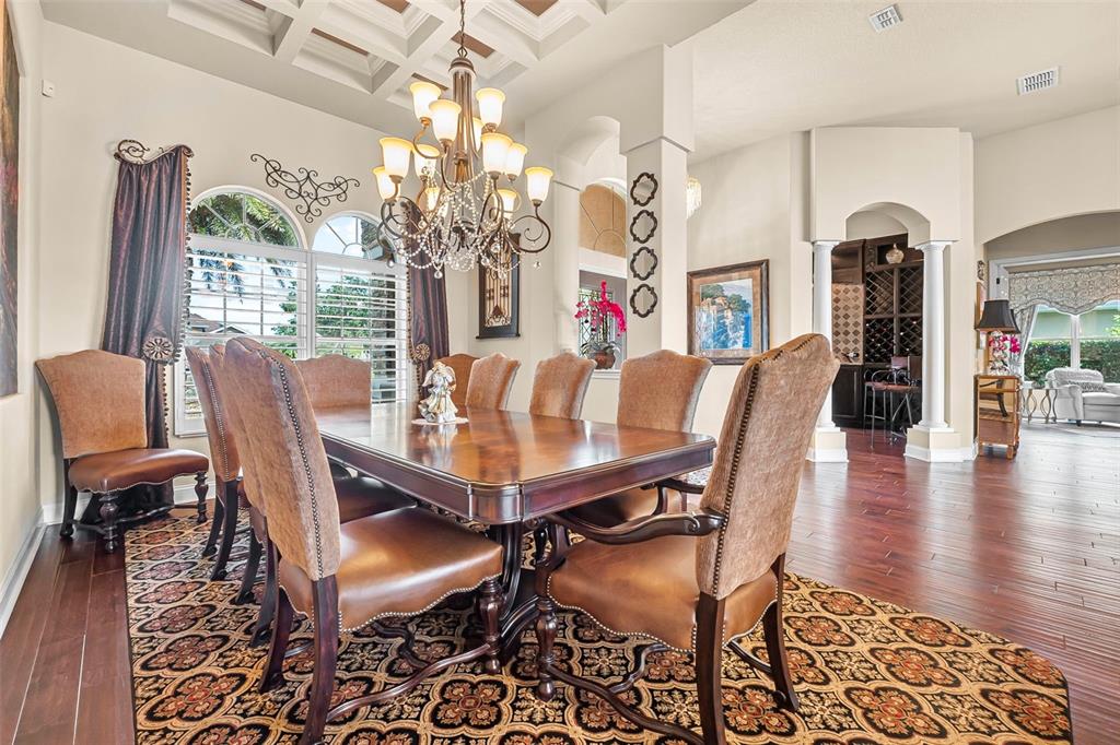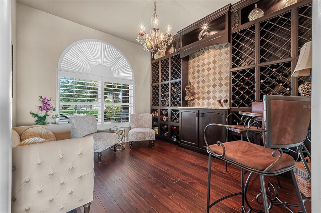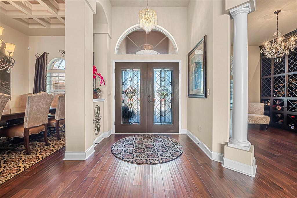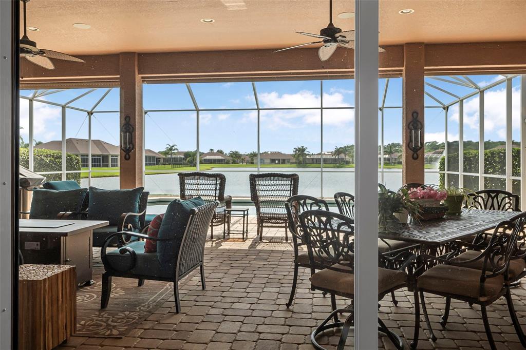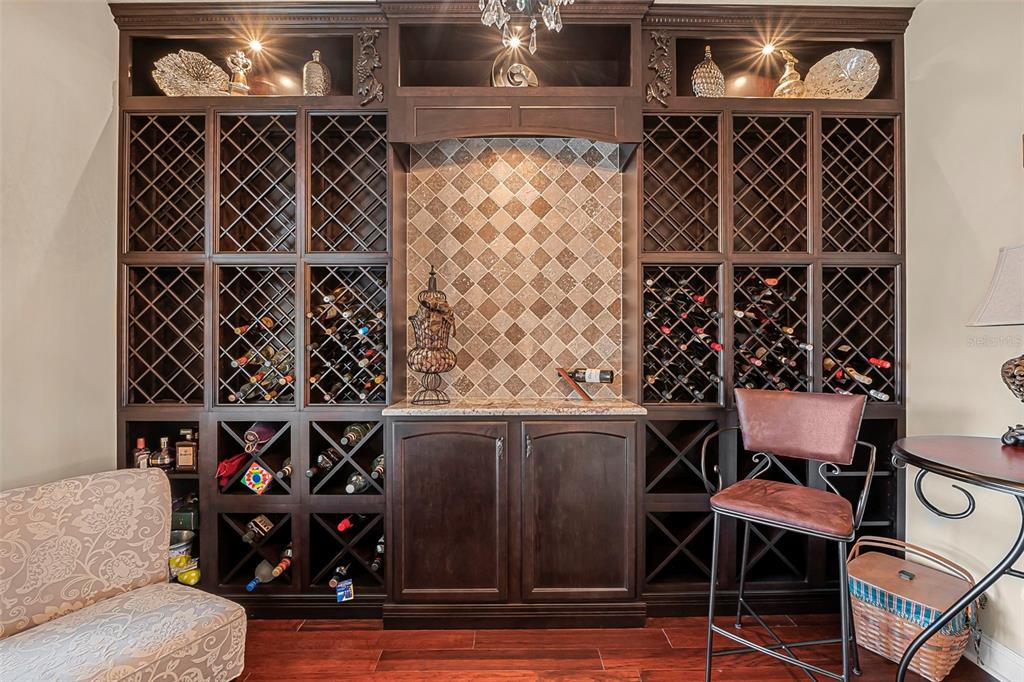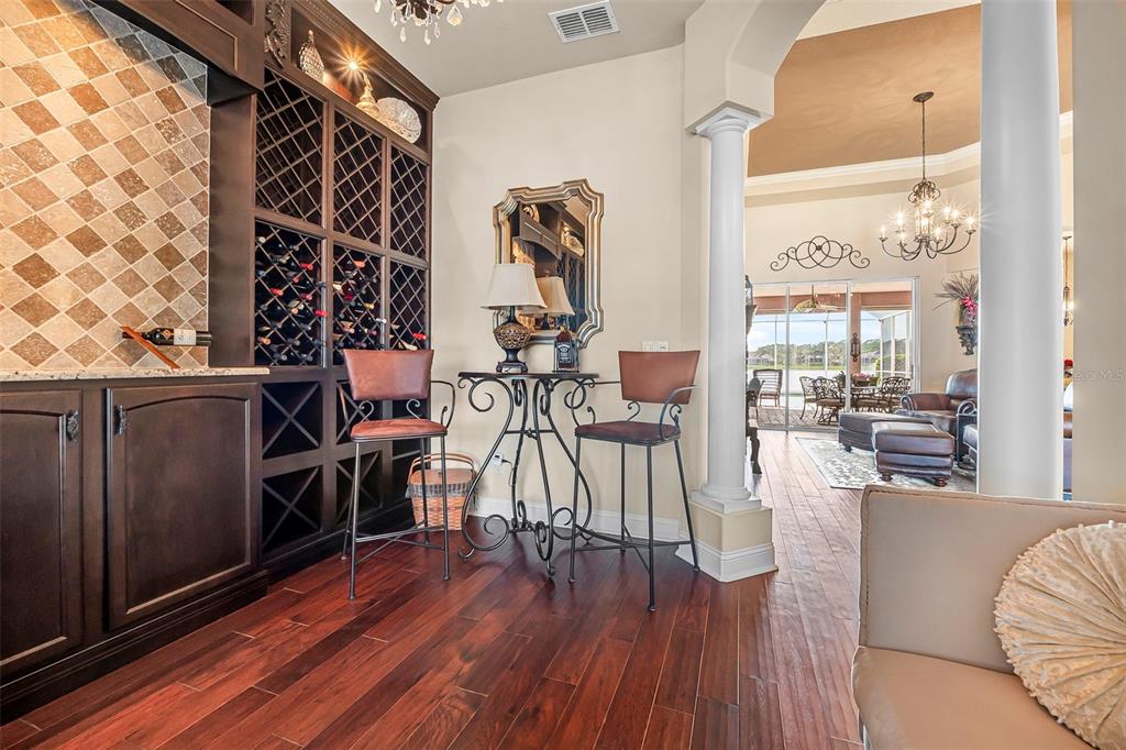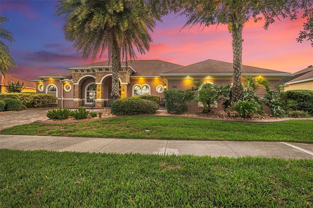 Welcome to 568 luna bella lane, a luxurious lakefront estate nestled in the renowned promenade parke part of venetian bay in new smyrna beach. this beautifully appointed custom home offers over 3,200 square feet of air-conditioned living space, combining elegance, comfort, and functionality in one of the most sought-after communities in volusia county. from the moment you arrive, you'll be captivated by the home’s commanding presence, enhanced by lush landscaping and double leaded glass entry doors. step inside to discover soaring ceilings and refined architectural details such as coffered ceilings, crown molding, and rounded archways. the spacious split floor plan includes three generously sized bedrooms, three full bathrooms, and a half pool bath, providing the perfect blend of privacy and openness for both everyday living and entertaining. the heart of the home is the gourmet kitchen, thoughtfully designed with a large granite island, custom cabinetry, walk-in pantry, built-in seating with storage, and a separate coffee bar area. it opens seamlessly to the great room and dining area, allowing you to stay engaged with guests while preparing meals. just off the main living space is a custom-designed wine room that holds up to 200 bottles of wine, offering an ideal climate-controlled space for collectors and enthusiasts. this room can also be easily converted into an office or den to suit your needs. the primary suites offers luxurious retreats, each with walk-in closets and spa-inspired bathrooms. whether hosting overnight guests or enjoying multigenerational living, this home accommodates it all in style. every room is crafted with attention to detail, from designer finishes to the custom mural in the formal dining area. tep outside to your private outdoor oasis, designed with entertainment in mind. the covered lanai features a full summer kitchen, wet bar, and a cozy gas fire pit. the screened saltwater pool with solar heating overlooks a tranquil fountained lake, creating a serene backdrop for alfresco dining, weekend gatherings, or peaceful sunset views. the west-facing side of the home also includes electric hurricane shutters for added peace of mind. additional features include a two-car garage, fully furnished interiors with curated antiques and custom upholstery, and meticulous landscaping framed by concrete borders. located within venetian bay, residents enjoy access to top-tier amenities including an 18-hole championship golf course, fitness center, walking and biking trails, and dining options—all just minutes from new smyrna beach’s charming downtown and coastal attractions.568 LUNA BELLA, NEW SMYRNA BEACH, FL 32168