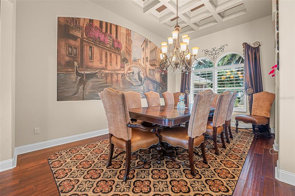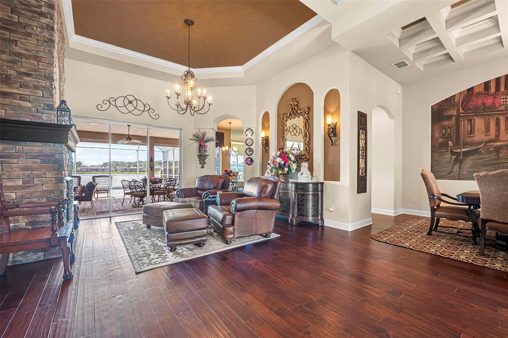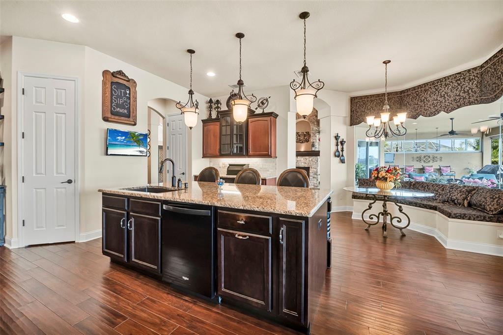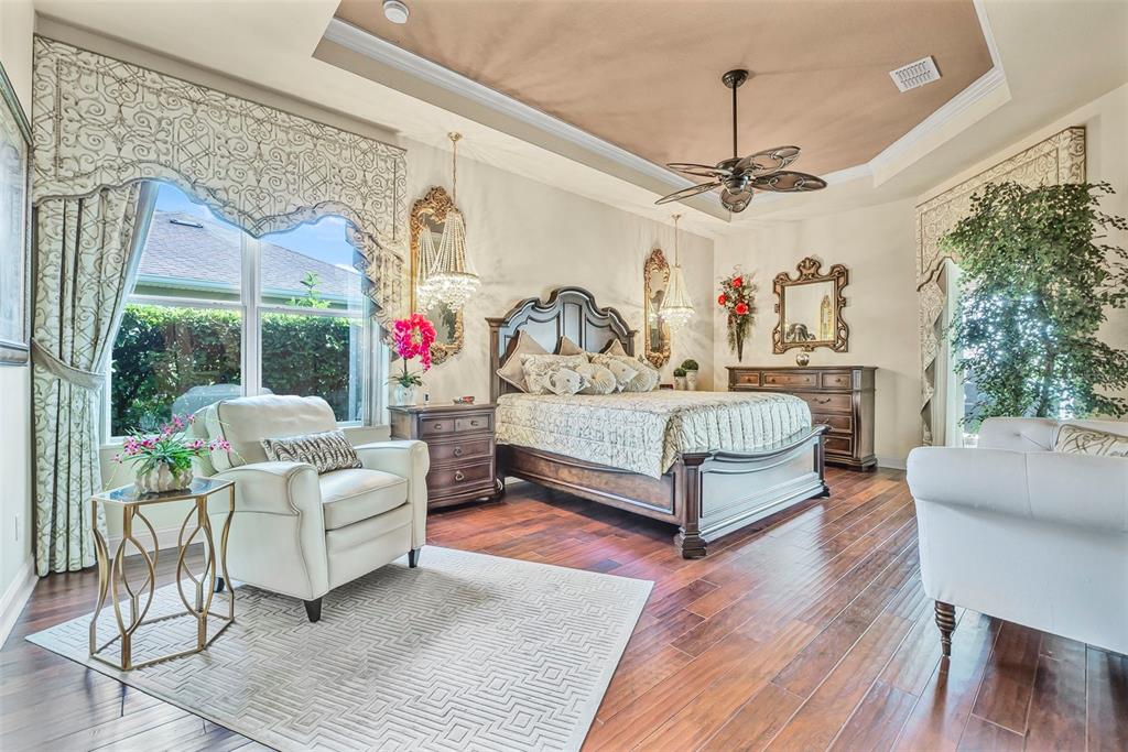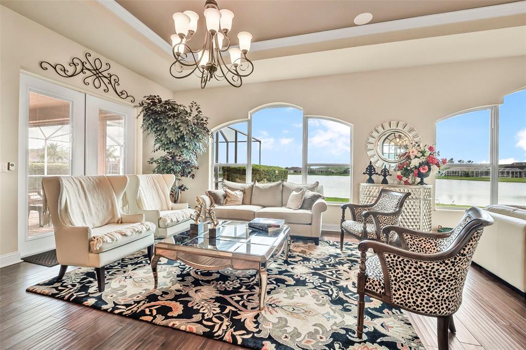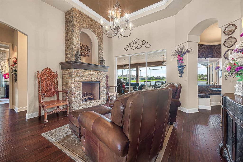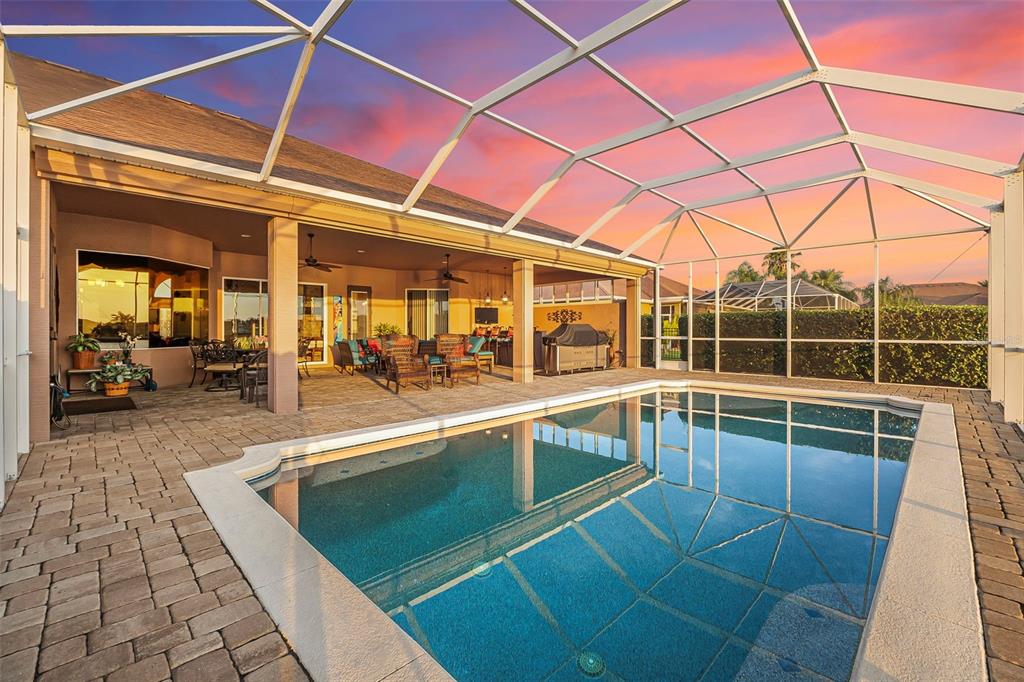 Welcome to 568 luna bella lane, a luxurious lakefront estate nestled in the renowned promenade parke part of venetian bay in new smyrna beach. this beautifully appointed custom home offers over 3,200 square feet of air-conditioned living space, combining elegance, comfort, and functionality in one of the most sought-after communities in volusia county. from the moment you arrive, you'll be captivated by the home’s commanding presence, enhanced by lush landscaping and double leaded glass entry doors. step inside to discover soaring ceilings and refined architectural details such as coffered ceilings, crown molding, and rounded archways. the spacious split floor plan includes three generously sized bedrooms, three full bathrooms, and a half pool bath, providing the perfect blend of privacy and openness for both everyday living and entertaining. the heart of the home is the gourmet kitchen, thoughtfully designed with a large granite island, custom cabinetry, walk-in pantry, built-in seating with storage, and a separate coffee bar area. it opens seamlessly to the great room and dining area, allowing you to stay engaged with guests while preparing meals. just off the main living space is a custom-designed wine room that holds up to 200 bottles of wine, offering an ideal climate-controlled space for collectors and enthusiasts. this room can also be easily converted into an office or den to suit your needs. the primary suites offers luxurious retreats, each with walk-in closets and spa-inspired bathrooms. whether hosting overnight guests or enjoying multigenerational living, this home accommodates it all in style. every room is crafted with attention to detail, from designer finishes to the custom mural in the formal dining area. tep outside to your private outdoor oasis, designed with entertainment in mind. the covered lanai features a full summer kitchen, wet bar, and a cozy gas fire pit. the screened saltwater pool with solar heating overlooks a tranquil fountained lake, creating a serene backdrop for alfresco dining, weekend gatherings, or peaceful sunset views. the west-facing side of the home also includes electric hurricane shutters for added peace of mind. additional features include a two-car garage, fully furnished interiors with curated antiques and custom upholstery, and meticulous landscaping framed by concrete borders. located within venetian bay, residents enjoy access to top-tier amenities including an 18-hole championship golf course, fitness center, walking and biking trails, and dining options—all just minutes from new smyrna beach’s charming downtown and coastal attractions.568 LUNA BELLA, NEW SMYRNA BEACH, FL 32168