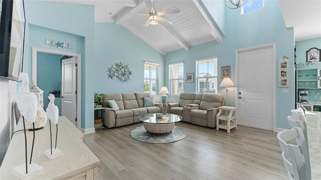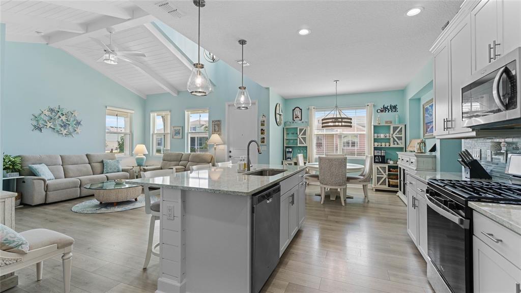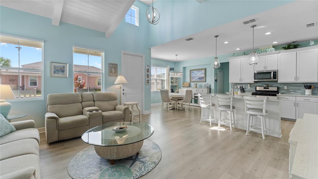 Price reduction! this is your chance to own the popular and now sold out dreamsicle cottage in latitude margaritaville – a 55+ coastal paradise! this upgraded dreamsicle cottage, located near the gated entrance, is unlike anything else on the market, offering luxury and convenience. inside, no detail has been overlooked. the open-concept design features vaulted ceilings with beams and shiplap, creating a breezy, coastal feel throughout the home. the designer wood-look laminate flooring flows seamlessly from room to room, adding to the elegance. the gourmet kitchen is a chef’s dream, with 42” cabinets, a large island with seating, beautiful quartz countertops, a matching glass backsplash, and stainless steel appliances, including a gas stove. the thoughtful soft-close drawers and pullouts make meal prep both efficient and easy. the master suite is a true retreat, featuring a custom shiplap headboard and a barn door that leads to the spa-like master bath. here, you’ll find a frameless glass shower, granite countertops, and exquisite tile work, creating a peaceful, luxurious space to unwind. the second bedroom is just as inviting, offering a murphy bed and an upgraded bathroom with modern finishes. the dedicated laundry room adds to the home’s convenience with ample cabinetry and a washer/dryer included. upgraded designer, remote controlled, ceiling fans can be found in the bedrooms, office, and great room, while the garage features two overhead storage racks. if you need extra space, the versatile den/office provides the perfect spot for working from home or pursuing your hobbies. the inviting patio outside is ideal for enjoying your morning coffee or evening cocktails, completing this beautiful home. resident's enjoy: the paradise pool with beach entry and the adjacent sandbar tiki bar/restaurant,fins up! fitness center, mango theater, and the latitude town center for live events, private oceanfront beach club with shuttle access, tennis, pickleball, bocce courts, and a field for fins ball, outdoor pools, cabanas, and the changes in attitude poolside bar, on-site barkaritaville pet spa, picnic areas, bbq grills, and a 200,000-square-foot retail center with a grocery store. whether you're relaxing at the private beach club or attending a concert at the lively town square bandshell, you'll love this welcoming golf cart friendly community’s blend of relaxation and excitement. your island paradise awaits!make this stunning dreamsicle cottage your next home and embrace life on island time! all this minutes away from daytona beach international airport, world-famous beaches, and the new one daytona dining and shopping destination. furniture is negotiable. contact your agent today for details about the assumable mortgage and schedule your private tour.583 GOOD LIFE, DAYTONA BEACH, FL 32124
