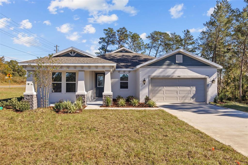 One or more photo(s) has been virtually staged. new construction – the riley plan spire home builder completion april 2025 the riley delivers everything you want: space, luxury, affordability, and exceptional craftsmanship. this thoughtfully designed 4-bedroom, 3-bathroom home includes a two-car garage with additional bump-out storage, perfect for practical and enjoyable family living. from the moment you step onto the charming covered front porch, you’ll be impressed by the perfect blend of style and functionality. the sunny, open floor plan is ideal for entertaining, featuring a gourmet kitchen with modern appliances, a prep island with counter seating, and a seamless flow into the great room. sliding glass doors lead to a rear lanai, extending your living space into the outdoors. dining options include a casual dining nook and a versatile space that can be used for formal dining or as a game area. the bedrooms are strategically positioned for privacy and convenience. a guest bedroom near a full bathroom is located at the front, while jack-and-jill bedrooms are tucked toward the back of the home. the luxurious owner’s suite, set apart for privacy, is a true retreat. it features a spacious four-season walk-in closet, dual vanities, a private lavatory, and a large shower area. the design includes smartly located pantry and laundry rooms for added efficiency and convenience. this home is currently under construction, with a completion date subject to change. colors and finishes may differ from the sample photos. don’t miss the opportunity to own a home that perfectly balances comfort, elegance, and practicality!5830 SW 121, OCALA, FL 34481