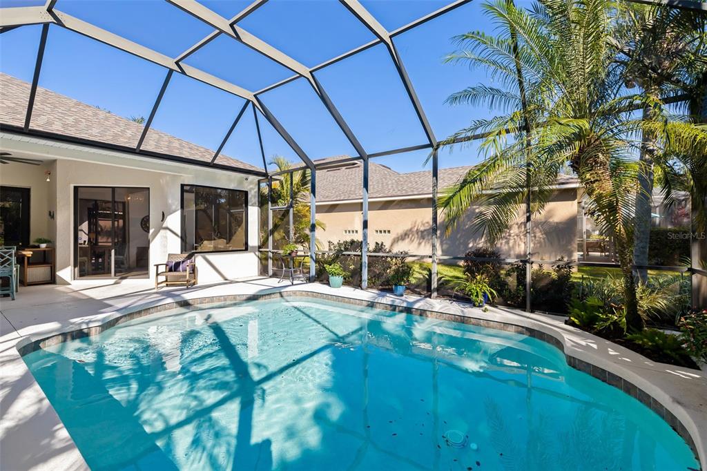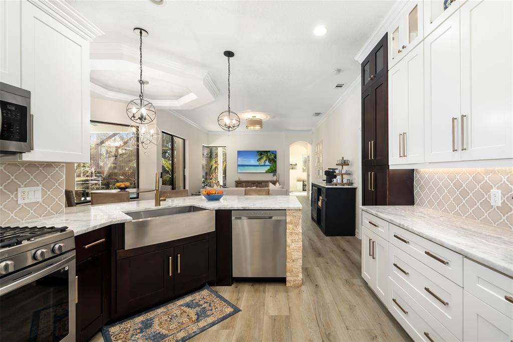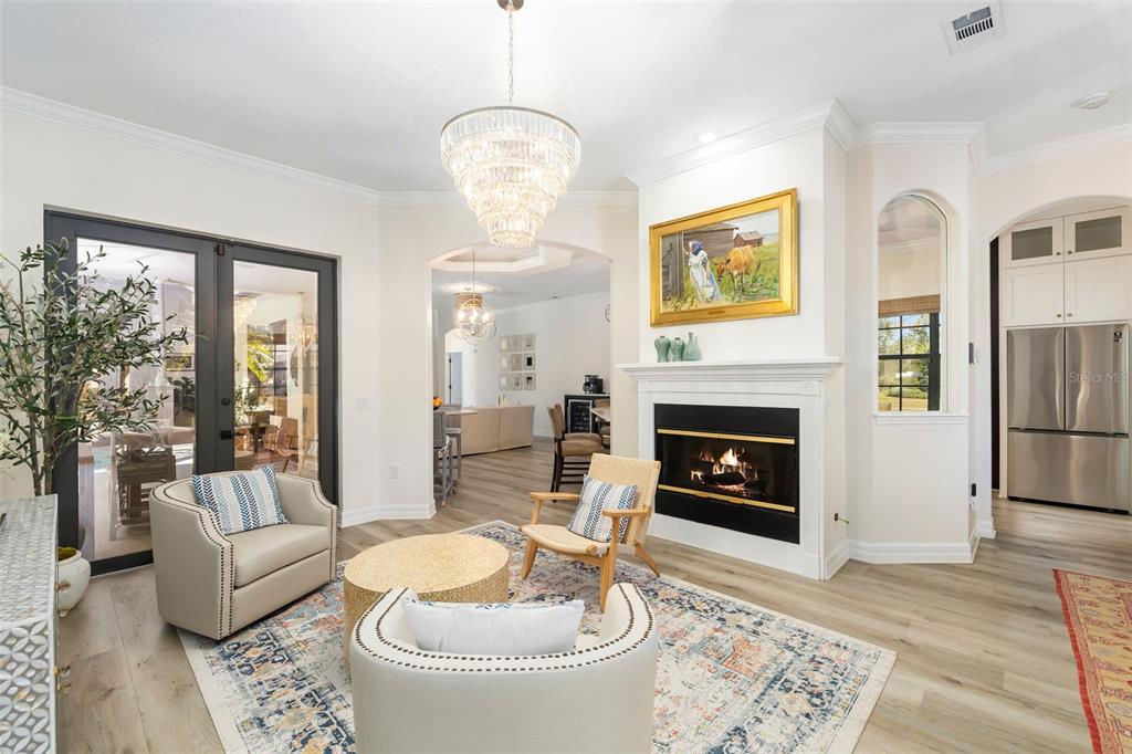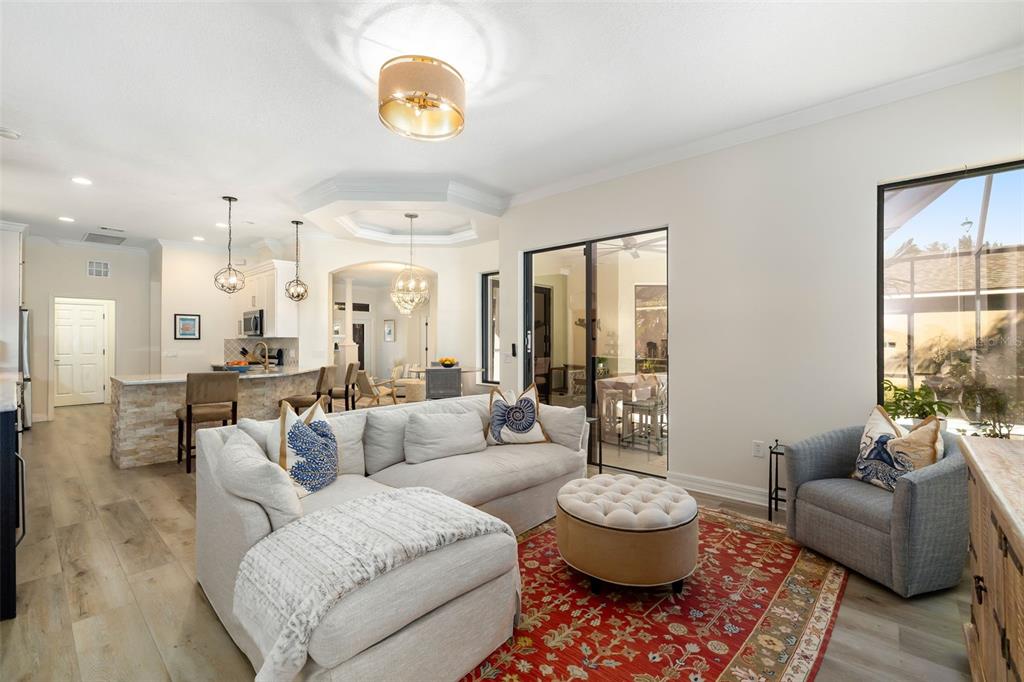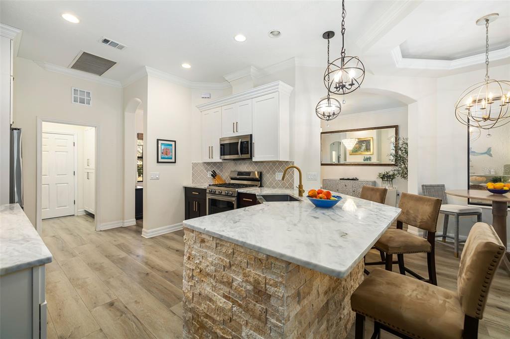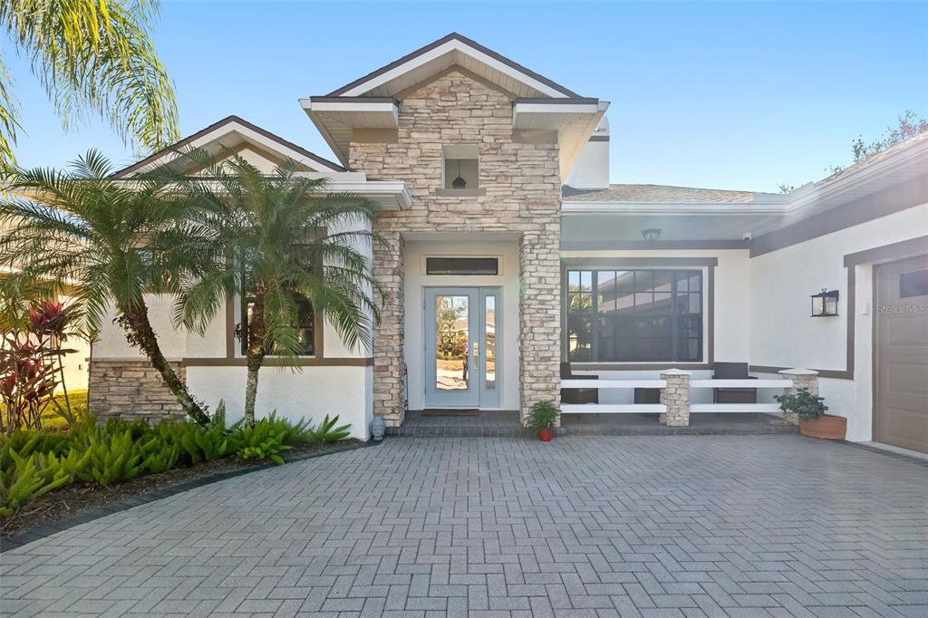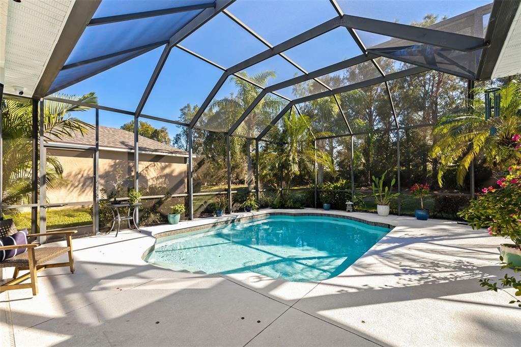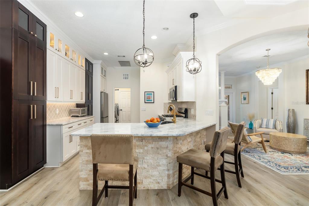 This impeccably maintained greenbrook home features a side-entry oversized garage, a paver driveway, a charming front porch, and a stacked stone façade. the property also boasts a 2-year-old roof with full-house gutters and a new 6-camera adt security system with alert 360. the peaceful rear lanai is home to a heated saltwater pool with a new filter, a freestanding therapy spa, and a southern rear exposure. inside, you'll find luxury vinyl plank flooring throughout the living areas, custom light fixtures, an electric wall fireplace in the living room, 5 ¼” baseboards, and an abundance of crown molding and architectural details. the kitchen is a chef’s dream with white and cherry cabinetry, granite countertops, 42” upper cabinets with additional stacked glass-front lit cabinets reaching the ceiling, pull-out drawers in the base cabinets, a stainless steel gas stove and appliances, a farmhouse sink, and a built-in wine and coffee bar. the home also includes a whole-house water filter and softener. all four bedrooms feature built-in closet systems, along with a spacious home office. double-pane bronze windows add energy efficiency, while the garage offers extra storage above the car space and built-ins. the garage door opener comes with a transferable 3-year warranty. the laundry room is fully equipped with ample cabinets and storage space. the exterior showcases genuine curb appeal with upgraded landscaping and lighting. greenbrook is a fantastic community within walking distance to a-rated mcneal and nolan elementary & middle schools. the greenbrook adventure park offers ball fields, inline skating, dog parks, walking trails, playgrounds, pickleball/tennis courts, and a pavilion. the neighborhood has incredibly low hoa fees—less than $10 per month—and is conveniently located within lakewood ranch, close to lakewood ranch main street, waterside, restaurants, shopping, and just a short drive to sarasota’s crystal-clear beaches, including siesta key, bradenton, and anna maria island. some furniture may be available for purchase via a separate bill of sale.6305 ROYAL TERN, LAKEWOOD RANCH, FL 34202