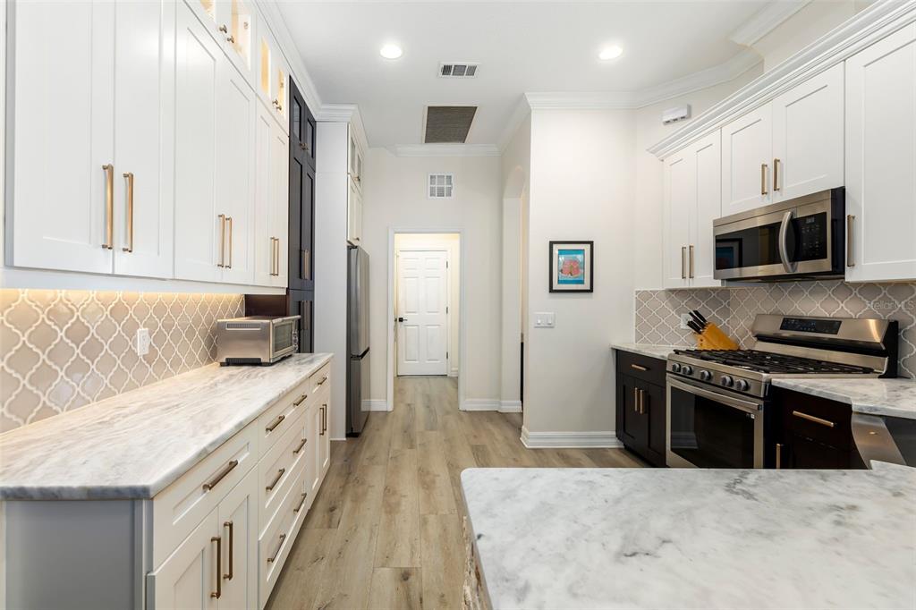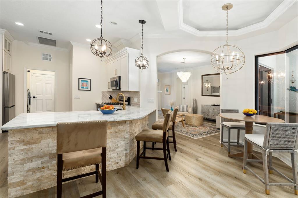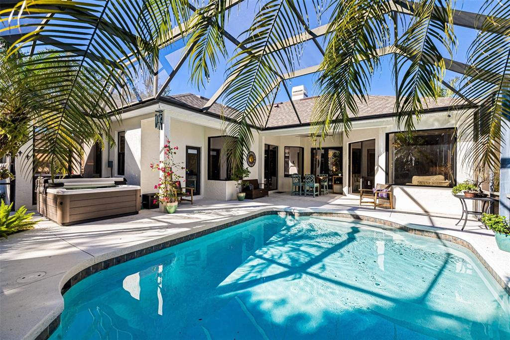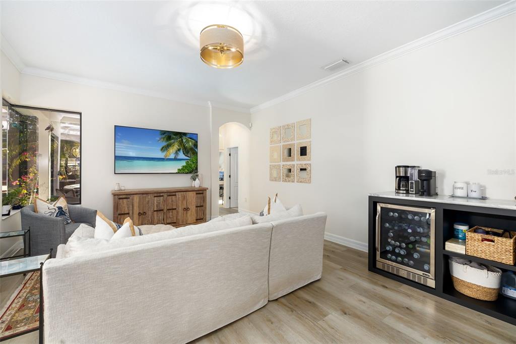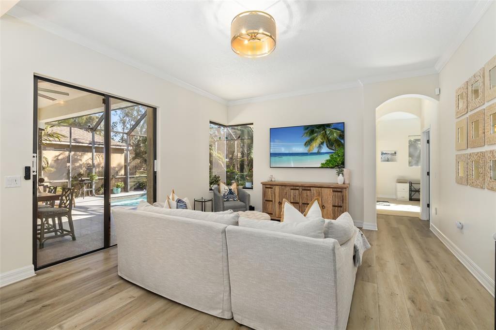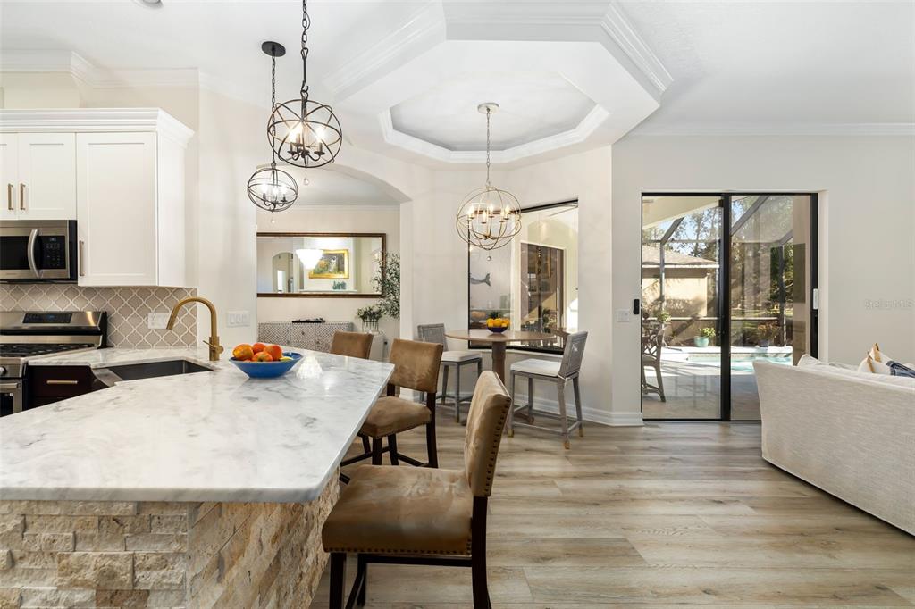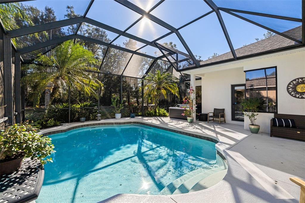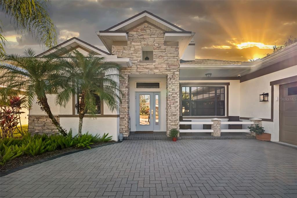 This impeccably maintained greenbrook home features a side-entry oversized garage, a paver driveway, a charming front porch, and a stacked stone façade. the property also boasts a 2-year-old roof with full-house gutters and a new 6-camera adt security system with alert 360. the peaceful rear lanai is home to a heated saltwater pool with a new filter, a freestanding therapy spa, and a southern rear exposure. inside, you'll find luxury vinyl plank flooring throughout the living areas, custom light fixtures, an electric wall fireplace in the living room, 5 ¼” baseboards, and an abundance of crown molding and architectural details. the kitchen is a chef’s dream with white and cherry cabinetry, granite countertops, 42” upper cabinets with additional stacked glass-front lit cabinets reaching the ceiling, pull-out drawers in the base cabinets, a stainless steel gas stove and appliances, a farmhouse sink, and a built-in wine and coffee bar. the home also includes a whole-house water filter and softener. all four bedrooms feature built-in closet systems, along with a spacious home office. double-pane bronze windows add energy efficiency, while the garage offers extra storage above the car space and built-ins. the garage door opener comes with a transferable 3-year warranty. the laundry room is fully equipped with ample cabinets and storage space. the exterior showcases genuine curb appeal with upgraded landscaping and lighting. greenbrook is a fantastic community within walking distance to a-rated mcneal and nolan elementary & middle schools. the greenbrook adventure park offers ball fields, inline skating, dog parks, walking trails, playgrounds, pickleball/tennis courts, and a pavilion. the neighborhood has incredibly low hoa fees—less than $10 per month—and is conveniently located within lakewood ranch, close to lakewood ranch main street, waterside, restaurants, shopping, and just a short drive to sarasota’s crystal-clear beaches, including siesta key, bradenton, and anna maria island. some furniture may be available for purchase via a separate bill of sale.6305 ROYAL TERN, LAKEWOOD RANCH, FL 34202