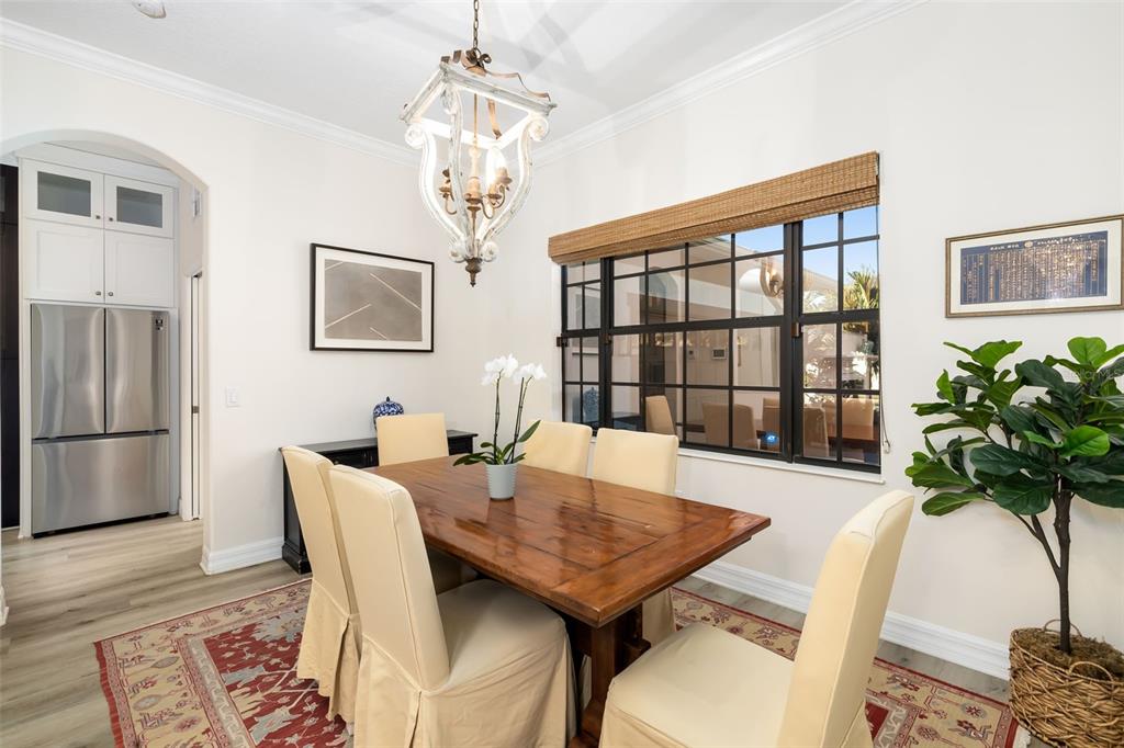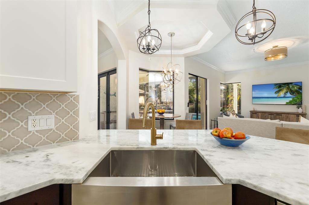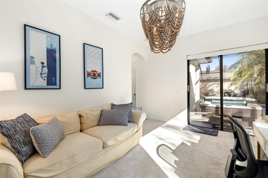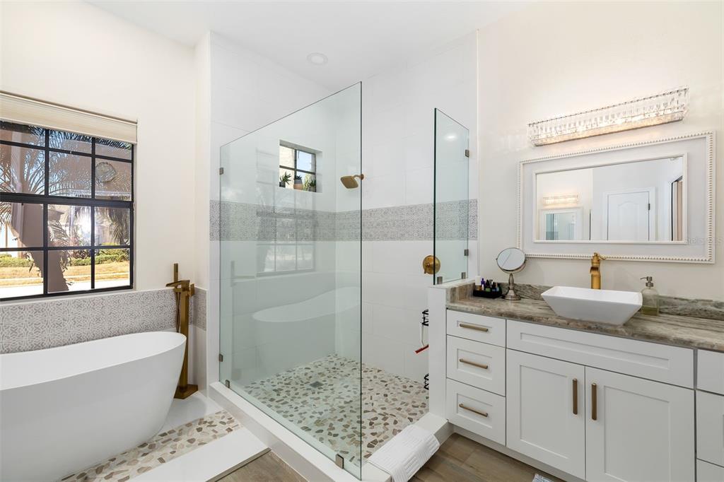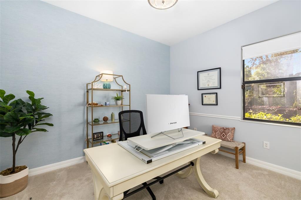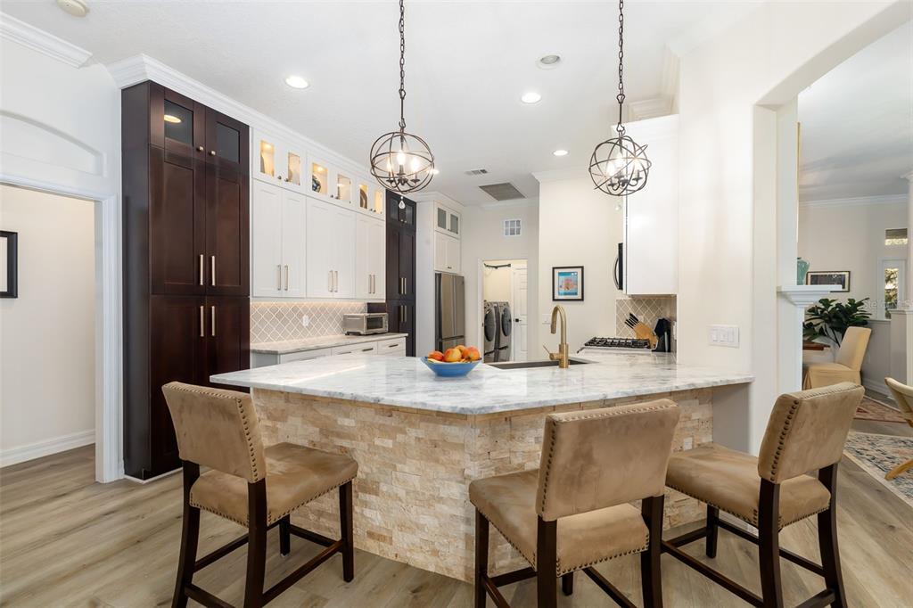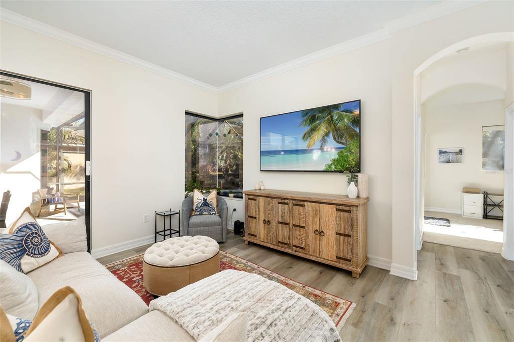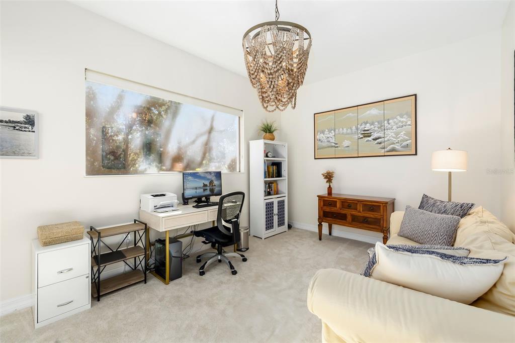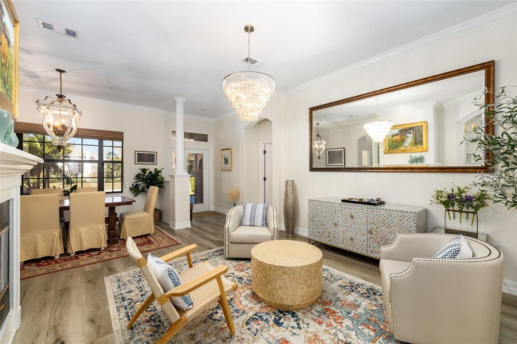This impeccably maintained greenbrook home features a side-entry oversized garage, a paver driveway, a charming front porch, and a stacked stone façade. the property also boasts a 2-year-old roof with full-house gutters and a new 6-camera adt security system with alert 360. the peaceful rear lanai is home to a heated saltwater pool with a new filter, a freestanding therapy spa, and a southern rear exposure. inside, you'll find luxury vinyl plank flooring throughout the living areas, custom light fixtures, an electric wall fireplace in the living room, 5 ¼” baseboards, and an abundance of crown molding and architectural details. the kitchen is a chef’s dream with white and cherry cabinetry, granite countertops, 42” upper cabinets with additional stacked glass-front lit cabinets reaching the ceiling, pull-out drawers in the base cabinets, a stainless steel gas stove and appliances, a farmhouse sink, and a built-in wine and coffee bar. the home also includes a whole-house water filter and softener. all four bedrooms feature built-in closet systems, along with a spacious home office. double-pane bronze windows add energy efficiency, while the garage offers extra storage above the car space and built-ins. the garage door opener comes with a transferable 3-year warranty. the laundry room is fully equipped with ample cabinets and storage space. the exterior showcases genuine curb appeal with upgraded landscaping and lighting. greenbrook is a fantastic community within walking distance to a-rated mcneal and nolan elementary & middle schools. the greenbrook adventure park offers ball fields, inline skating, dog parks, walking trails, playgrounds, pickleball/tennis courts, and a pavilion. the neighborhood has incredibly low hoa fees—less than $10 per month—and is conveniently located within lakewood ranch, close to lakewood ranch main street, waterside, restaurants, shopping, and just a short drive to sarasota’s crystal-clear beaches, including siesta key, bradenton, and anna maria island. some furniture may be available for purchase via a separate bill of sale.6305 ROYAL TERN, LAKEWOOD RANCH, FL 34202