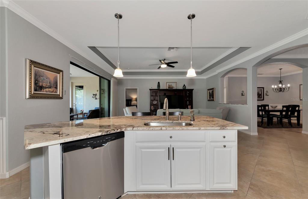 Split Bedroom Walk-In Closet(s)Ceiling Fan(s) Eating Space In Kitchen High Ceilings Thermostat Open Floorplan Window Treatments Solid Surface Counters Solid Wood CabinetsCrown Molding Primary Bedroom Main Floor Kitchen/Family Room ComboExterior Features: