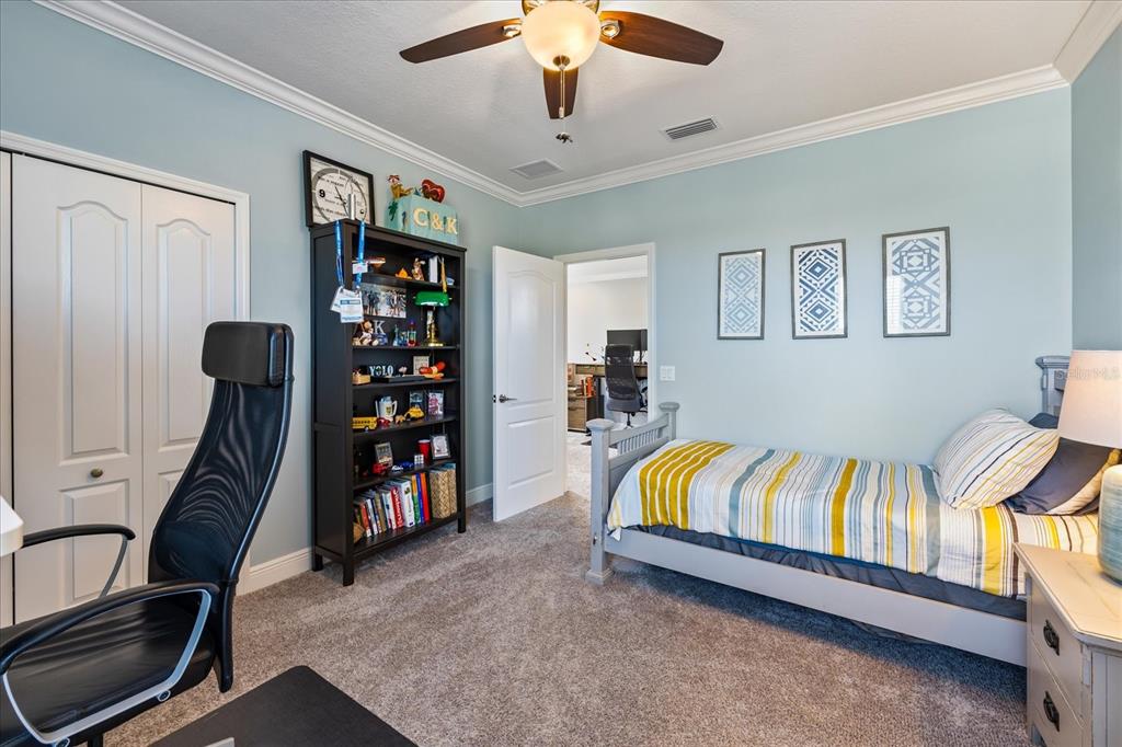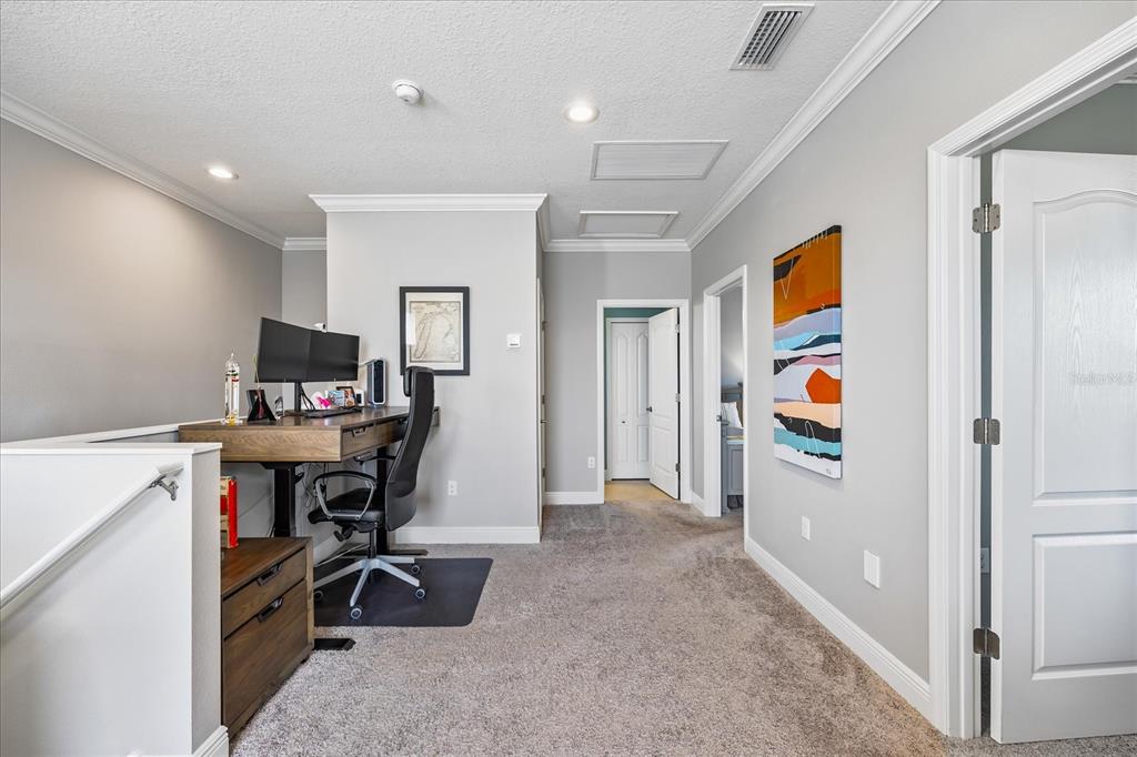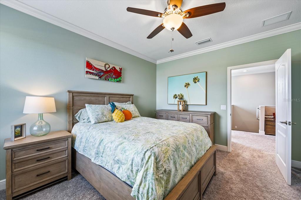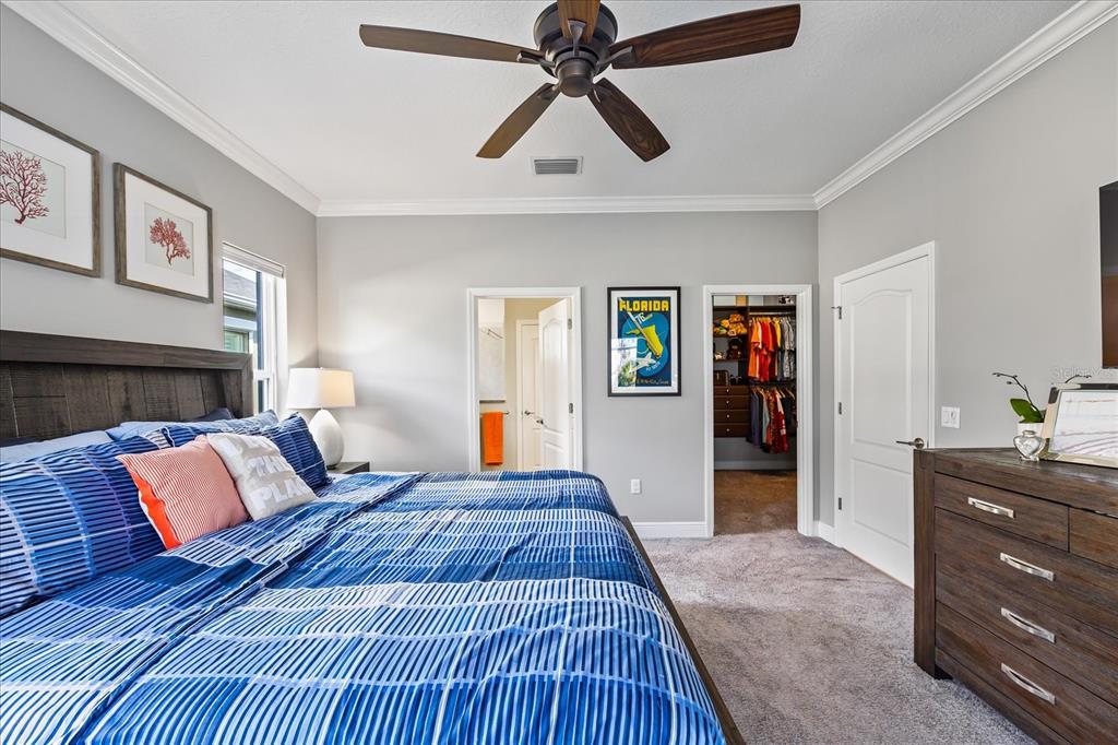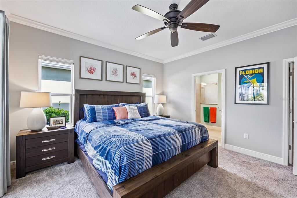Walk-In Closet(s)Ceiling Fan(s) Eating Space In Kitchen High Ceilings Living Room/Dining Room Combo Thermostat Open Floorplan Window Treatments Solid Surface CountersCrown Molding Primary Bedroom Main Floor Central VacuumExterior Features: