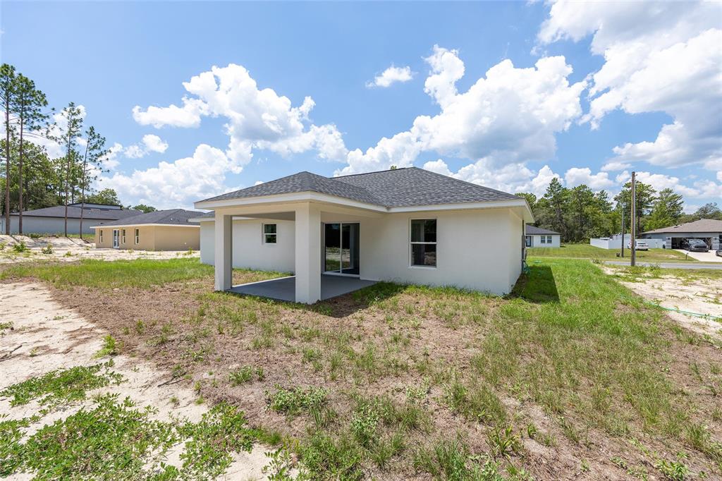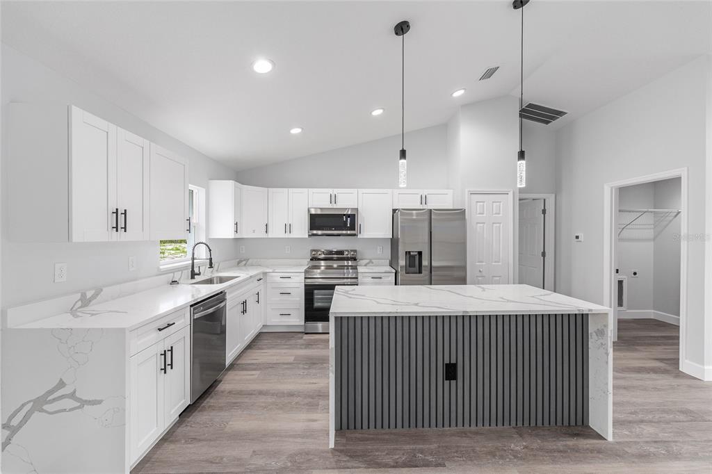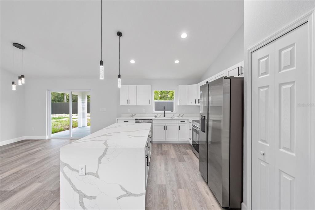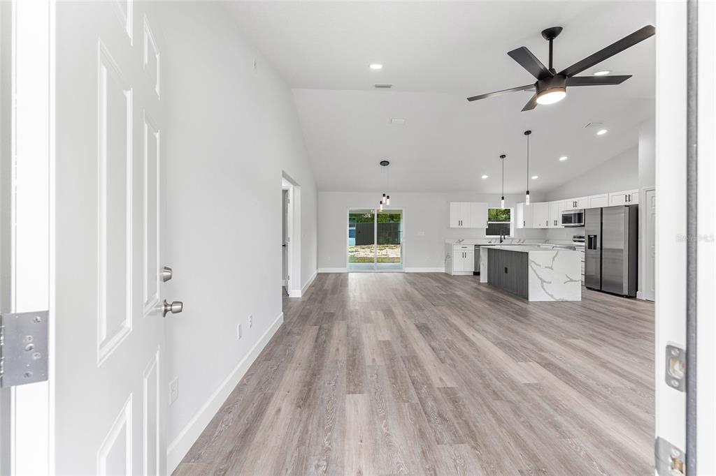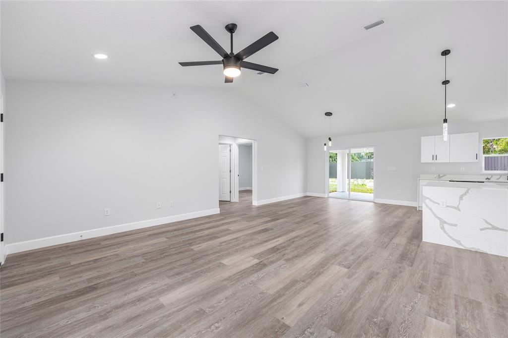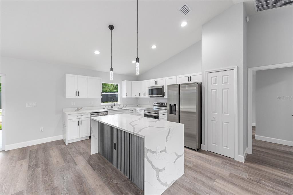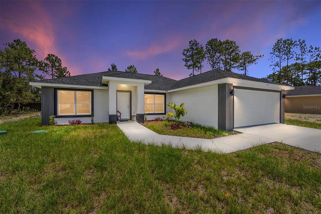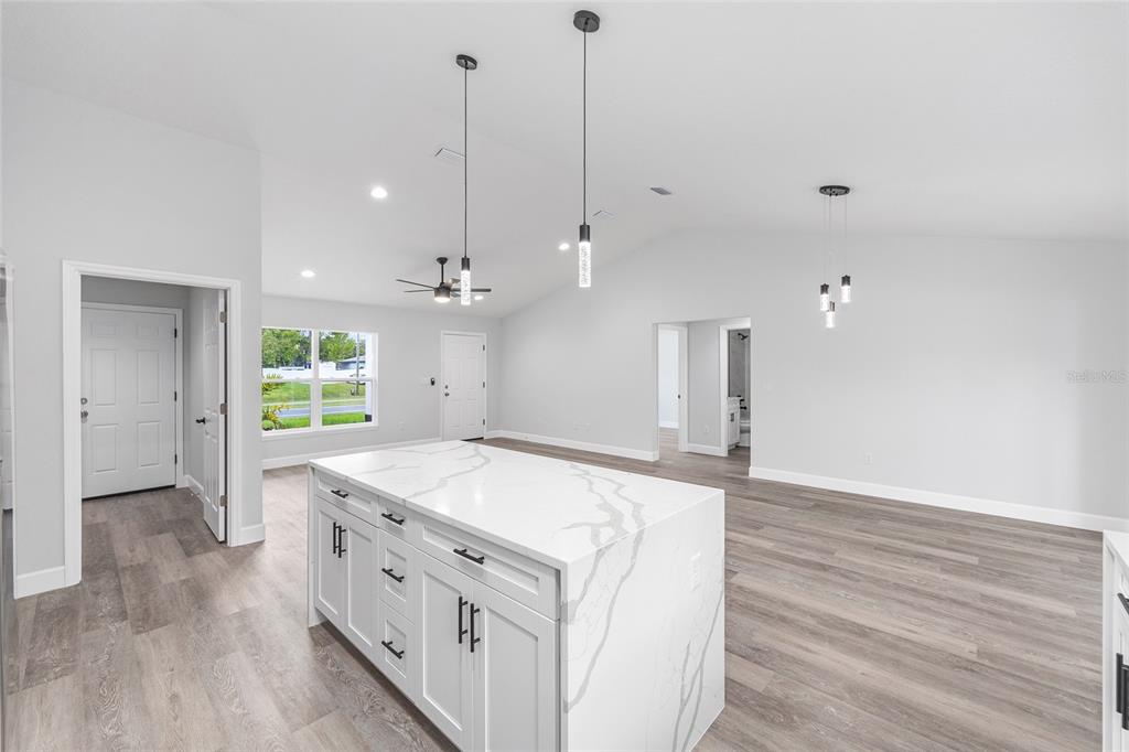 Welcome to this stunning new construction home nestled between hwy 484 in marion oaks and marion oaks manor. offering 1,380 square feet of living space and a total footprint of 1,972 square feet, this thoughtfully designed residence sits on an oversized .29-acre corner lot, providing plenty of outdoor potential and privacy. step inside to find vaulted ceilings in the social areas that enhance the home's open and airy feel. the kitchen is a showstopper with striking calacatta marble quartz countertops, a dramatic waterfall island, and sleek black fixtures throughout. the cohesive modern design continues into the bathrooms, featuring matching quartz vanities and a spa-inspired rainfall shower in the primary suite. additional features include...luxury waterproof vinyl plank flooring throughout, contemporary led light fixtures and ceiling fan in the living room, and a 12x12 covered lanai perfect for relaxing or entertaining. this home offers the perfect blend of style, functionality, and value. don’t miss your opportunity to own a beautiful new build in a growing area of ocala! your investment is protected with a full 1-year builder warranty. pictures are of actual home.717 MARION OAKS, OCALA, FL 34473