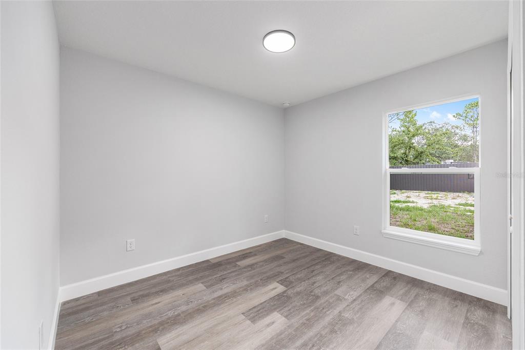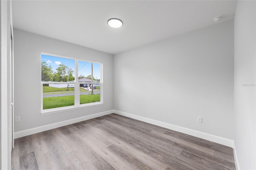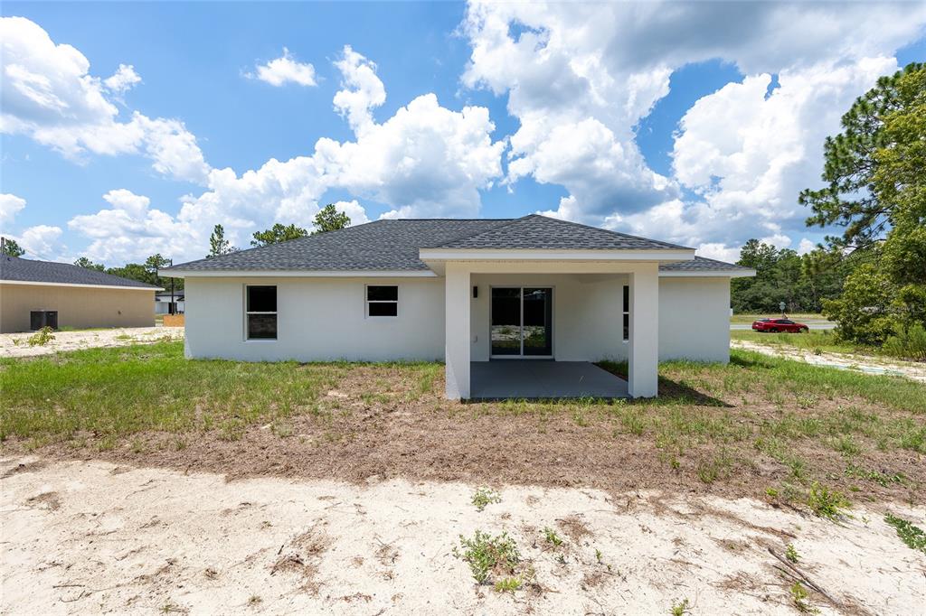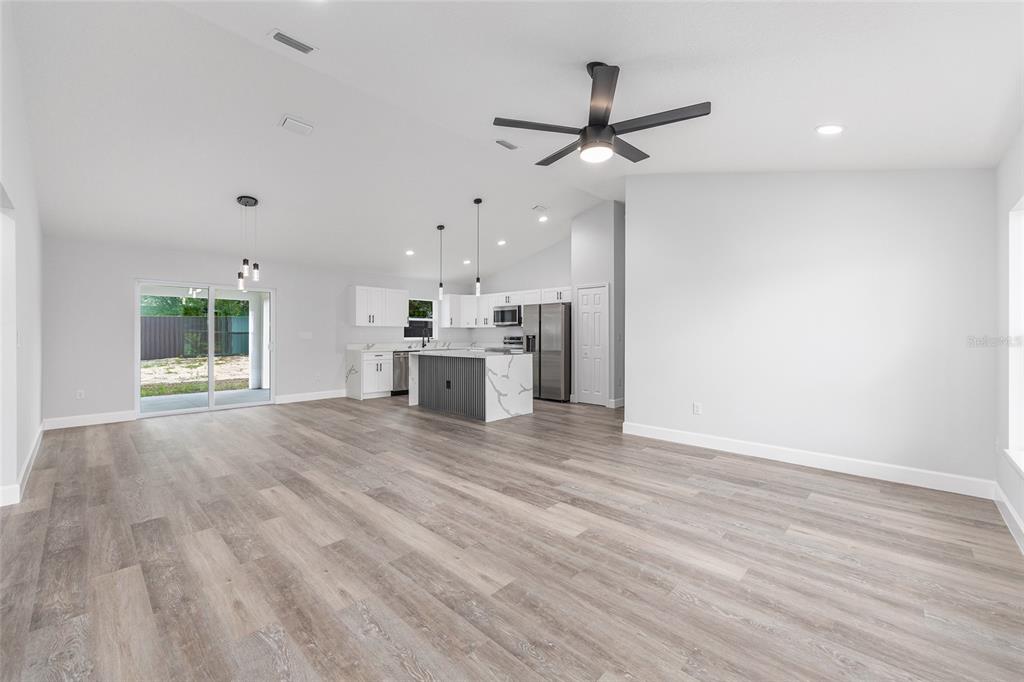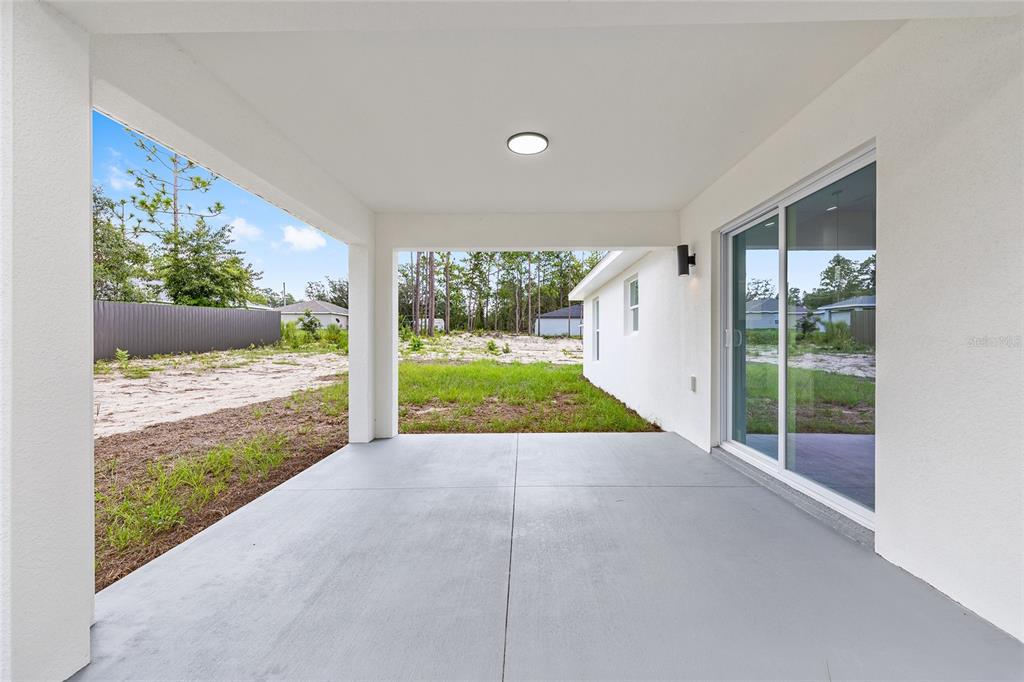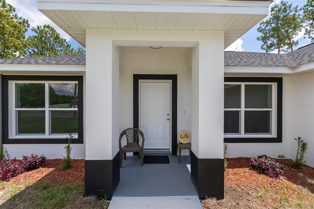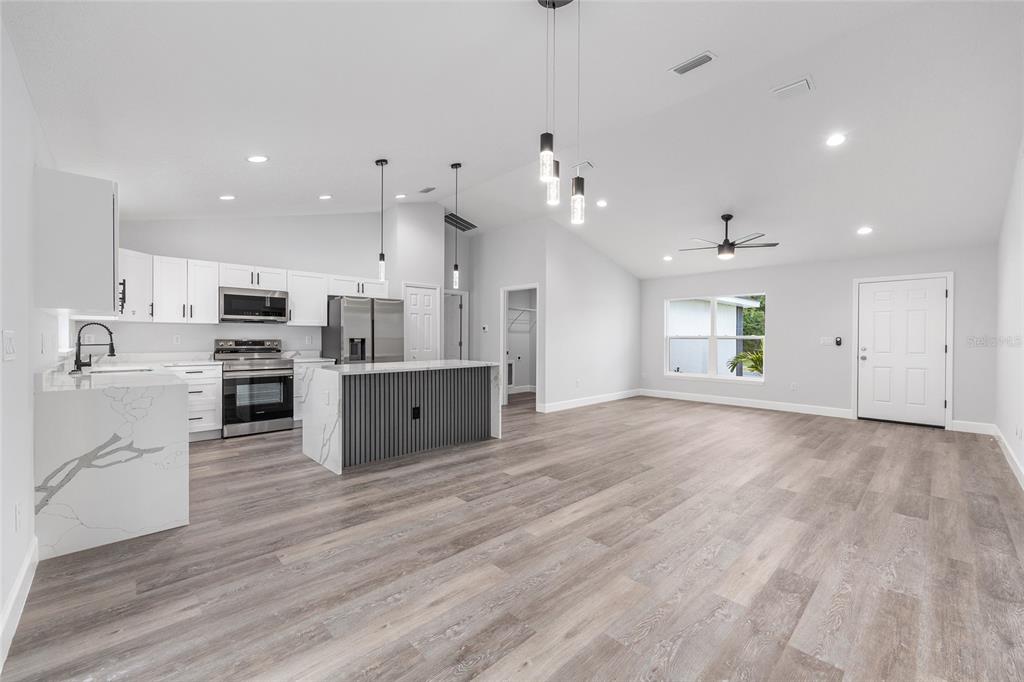 Welcome to this stunning new construction home nestled between hwy 484 in marion oaks and marion oaks manor. offering 1,380 square feet of living space and a total footprint of 1,972 square feet, this thoughtfully designed residence sits on an oversized .29-acre corner lot, providing plenty of outdoor potential and privacy. step inside to find vaulted ceilings in the social areas that enhance the home's open and airy feel. the kitchen is a showstopper with striking calacatta marble quartz countertops, a dramatic waterfall island, and sleek black fixtures throughout. the cohesive modern design continues into the bathrooms, featuring matching quartz vanities and a spa-inspired rainfall shower in the primary suite. additional features include...luxury waterproof vinyl plank flooring throughout, contemporary led light fixtures and ceiling fan in the living room, and a 12x12 covered lanai perfect for relaxing or entertaining. this home offers the perfect blend of style, functionality, and value. don’t miss your opportunity to own a beautiful new build in a growing area of ocala! your investment is protected with a full 1-year builder warranty. pictures are of actual home.717 MARION OAKS, OCALA, FL 34473