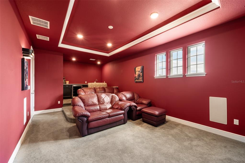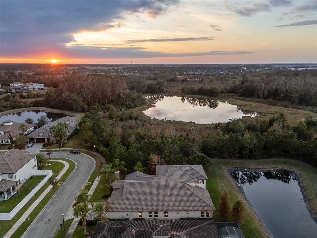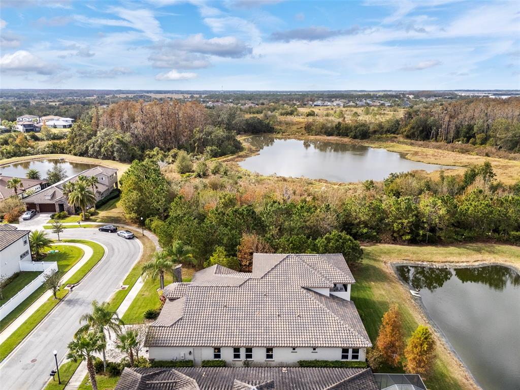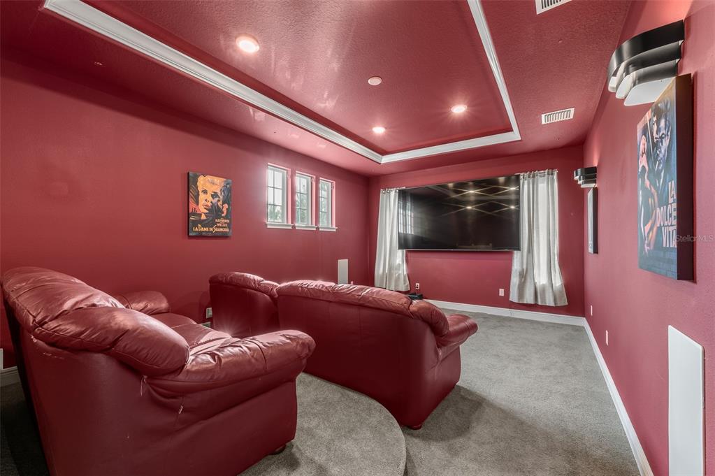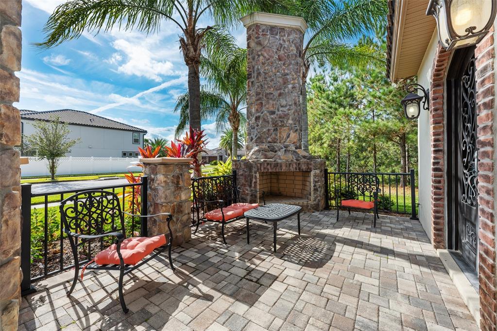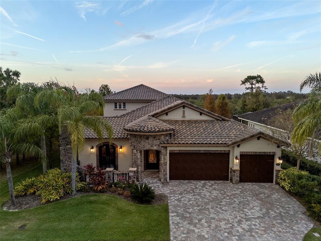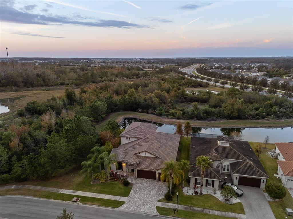 In the prestigious gated community of the gardens in watergrass, this exquisite five-bedroom, 4.5-bath, three-car garage residence by the luxury home builder bakerfield offers an unparalleled blend of luxury, sophistication, modern convenience, and a heightened sense of privacy courtesy of the oversized corner lot with pond and conservation views and no rear neighbors. the spacious front lanai, complete with a grand stone woodburning fireplace and a private entrance to a guest bedroom bar area, provides an ideal space for welcoming guests. the expansive kitchen is equipped with high-end appliances, including dual built-in ovens, an in-counter drawer microwave, a kitchenaid refrigerator with dual beverage drawers, all encompassed by solid wood cabinetry. the sprawling layout is further enhanced by a large, angled center island with abundant storage, paired with a stylish white subway tile backsplash that extends to the adjacent dry bar. glass display cabinetry extends to the ceiling, and a sleek walk-in pantry completes this culinary haven. the elegant primary suite serves as a tranquil oasis, featuring a spa-like bath with a luxurious pass-through walk-in shower boasting dual shower heads and a rainfall feature. a deep soaking tub invites relaxation, while the split dual vanity with a dedicated makeup counter adds a touch of glamour complemented by the dual walk-in closets with custom built-ins. crafted for entertainment, the dedicated theater room is complete with custom-tiered seating, a built-in wet bar with a beverage refrigerator, pre-wiring for motorized shades and an immersive 11.2 surround sound system. beyond its impressive interior, this residence boasts a multitude of desirable features, including an open upstairs loft, a covered balcony patio with picturesque views, a formal dining room, an oversized three-car garage, zoned dual air-conditioning systems for optimal climate control, and striking stone feature walls that grace the foyer and living room. enjoy picturesque pond views from the covered rear patio, which is thoughtfully equipped with a convenient half bath and is pre-plumbed for an outdoor kitchen and electronics. further enhancing this exceptional property are meticulously designed california closets, a child safety pool alarm for peace of mind and built-in surround sound speakers in the living room, patios and primary bath. impact windows offer security and energy efficiency, while hardwood flooring, recessed led lighting, and 12-foot ceilings with tray ceilings and crown molding create an ambiance of refined elegance. a well-appointed laundry room connects to the primary bath for added convenience. not in a flood zone. in the planned community of watergrass, offering community amenities in the form of multiple community pools and playgrounds, watergrass elementary and fire department, along with a new publix and starbucks. with nearby interstate access, this growing area has the sought-after innovation preparatory academy and the kirkland ranch academy of innovation schools while close to hospitals, dining, shopping, the tampa premium outlets, krate at the grove of wesley chapel and shops at wiregrass.7183 HEATHER SOUND, WESLEY CHAPEL, FL 33545