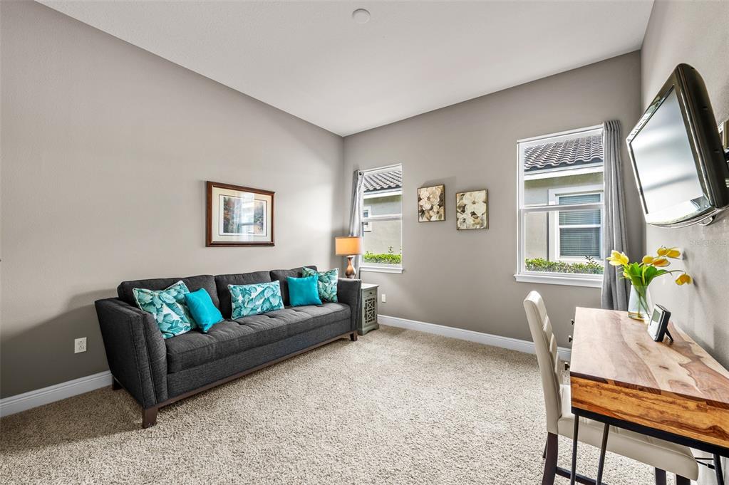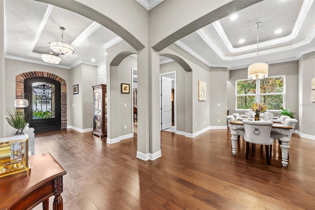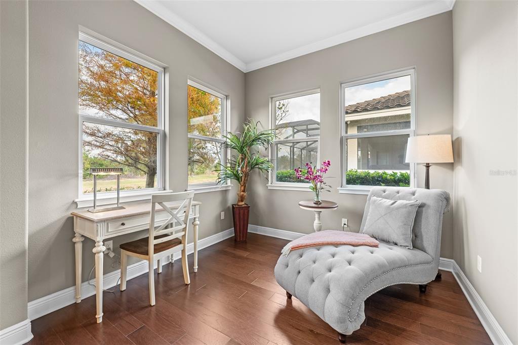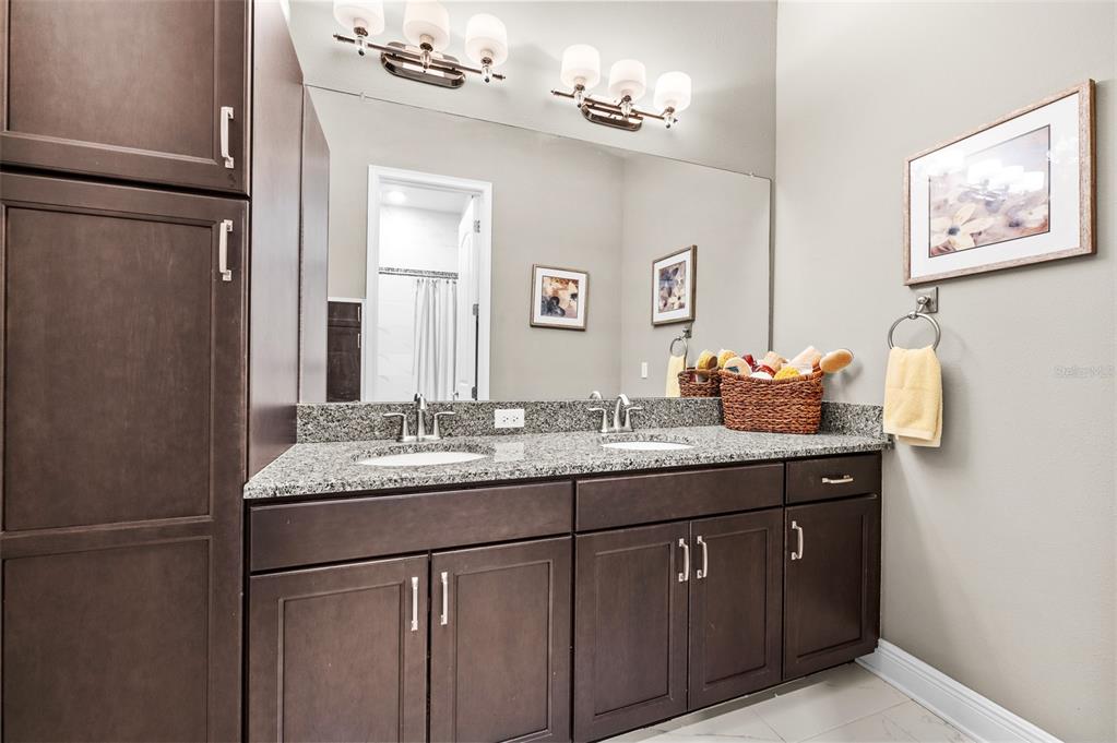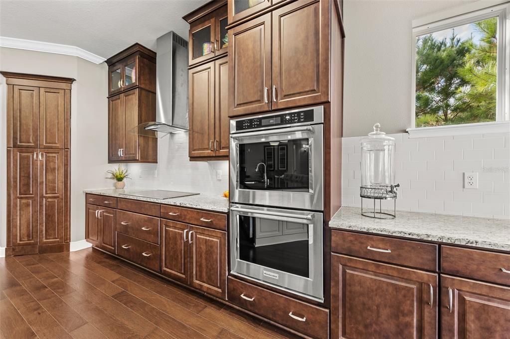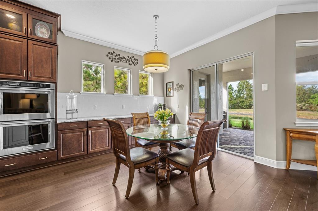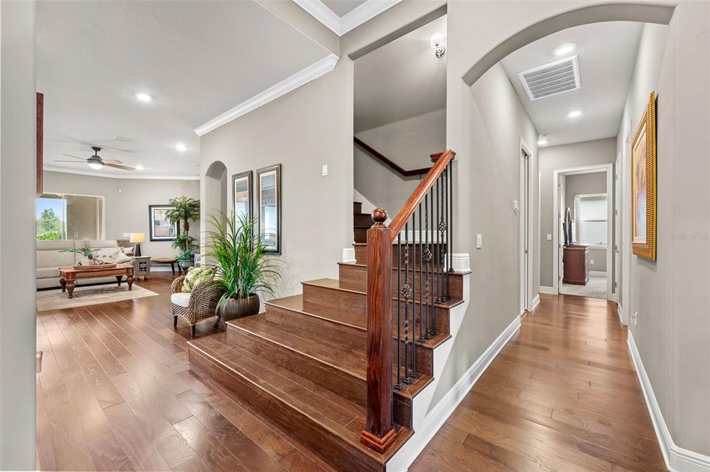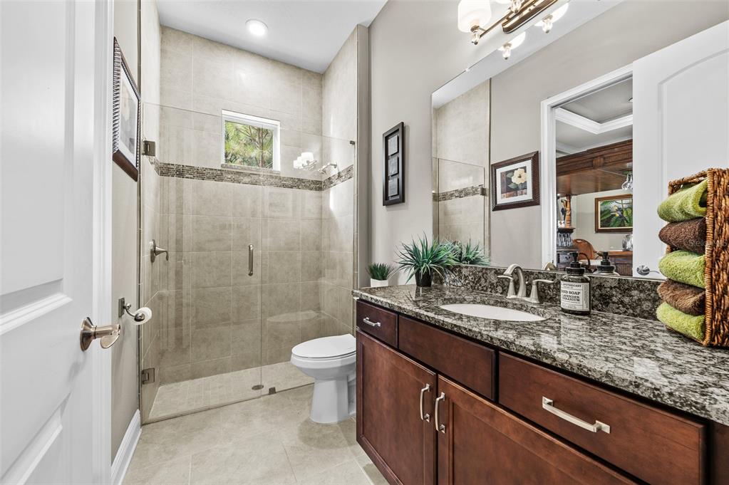 In the prestigious gated community of the gardens in watergrass, this exquisite five-bedroom, 4.5-bath, three-car garage residence by the luxury home builder bakerfield offers an unparalleled blend of luxury, sophistication, modern convenience, and a heightened sense of privacy courtesy of the oversized corner lot with pond and conservation views and no rear neighbors. the spacious front lanai, complete with a grand stone woodburning fireplace and a private entrance to a guest bedroom bar area, provides an ideal space for welcoming guests. the expansive kitchen is equipped with high-end appliances, including dual built-in ovens, an in-counter drawer microwave, a kitchenaid refrigerator with dual beverage drawers, all encompassed by solid wood cabinetry. the sprawling layout is further enhanced by a large, angled center island with abundant storage, paired with a stylish white subway tile backsplash that extends to the adjacent dry bar. glass display cabinetry extends to the ceiling, and a sleek walk-in pantry completes this culinary haven. the elegant primary suite serves as a tranquil oasis, featuring a spa-like bath with a luxurious pass-through walk-in shower boasting dual shower heads and a rainfall feature. a deep soaking tub invites relaxation, while the split dual vanity with a dedicated makeup counter adds a touch of glamour complemented by the dual walk-in closets with custom built-ins. crafted for entertainment, the dedicated theater room is complete with custom-tiered seating, a built-in wet bar with a beverage refrigerator, pre-wiring for motorized shades and an immersive 11.2 surround sound system. beyond its impressive interior, this residence boasts a multitude of desirable features, including an open upstairs loft, a covered balcony patio with picturesque views, a formal dining room, an oversized three-car garage, zoned dual air-conditioning systems for optimal climate control, and striking stone feature walls that grace the foyer and living room. enjoy picturesque pond views from the covered rear patio, which is thoughtfully equipped with a convenient half bath and is pre-plumbed for an outdoor kitchen and electronics. further enhancing this exceptional property are meticulously designed california closets, a child safety pool alarm for peace of mind and built-in surround sound speakers in the living room, patios and primary bath. impact windows offer security and energy efficiency, while hardwood flooring, recessed led lighting, and 12-foot ceilings with tray ceilings and crown molding create an ambiance of refined elegance. a well-appointed laundry room connects to the primary bath for added convenience. not in a flood zone. in the planned community of watergrass, offering community amenities in the form of multiple community pools and playgrounds, watergrass elementary and fire department, along with a new publix and starbucks. with nearby interstate access, this growing area has the sought-after innovation preparatory academy and the kirkland ranch academy of innovation schools while close to hospitals, dining, shopping, the tampa premium outlets, krate at the grove of wesley chapel and shops at wiregrass.7183 HEATHER SOUND, WESLEY CHAPEL, FL 33545