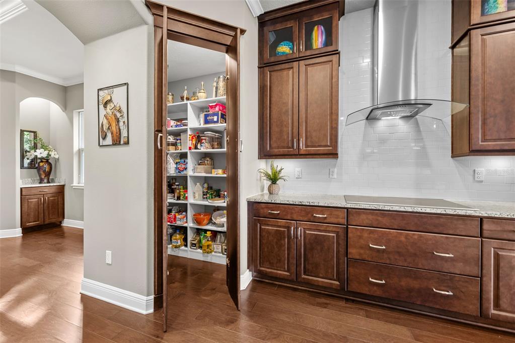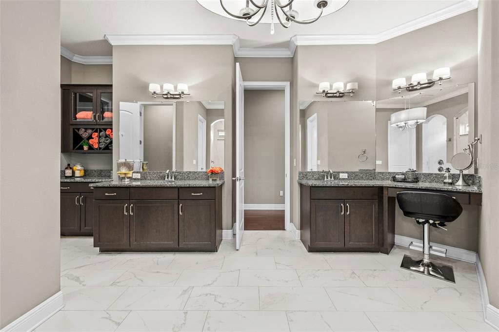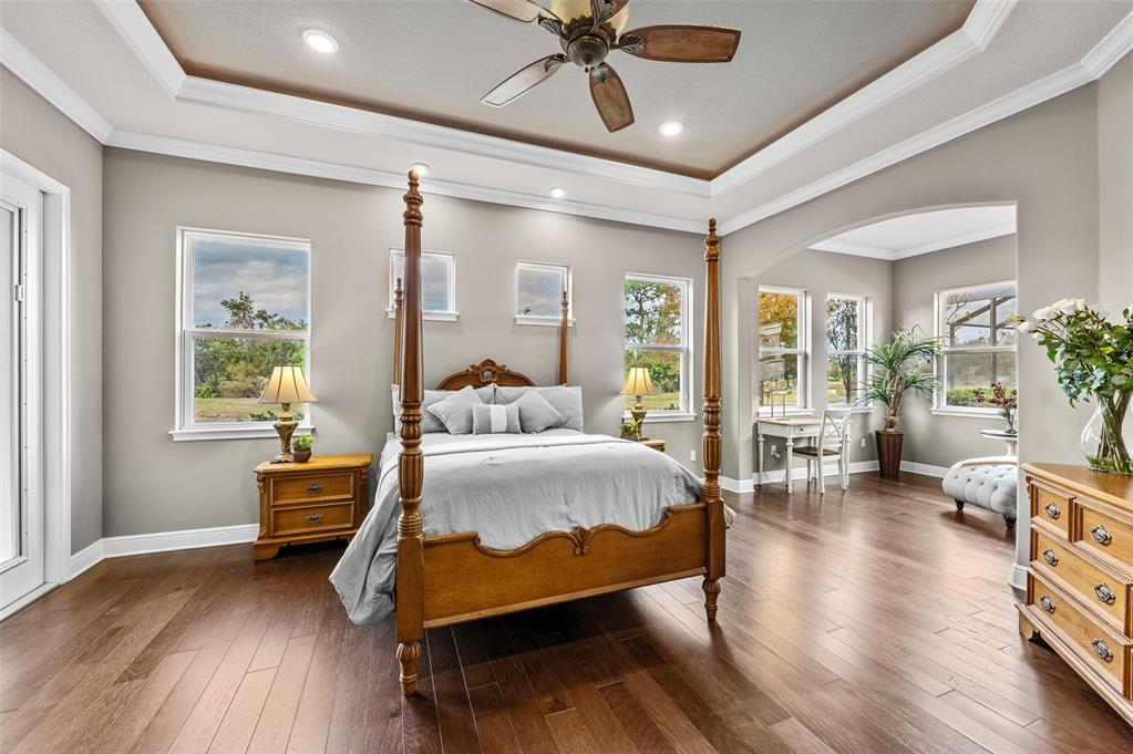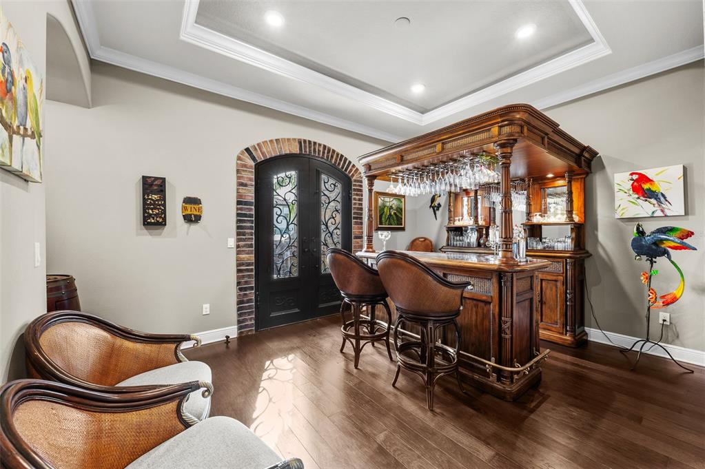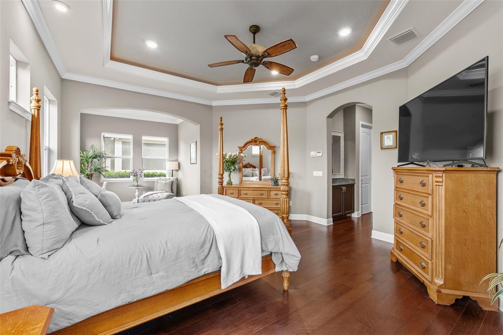Wet BarBuilt-in Features Walk-In Closet(s)Ceiling Fan(s) High Ceilings Stone Counters Thermostat Open Floorplan Solid Wood CabinetsCrown Molding Primary Bedroom Main Floor Tray Ceiling(s) Dry BarExterior Features: