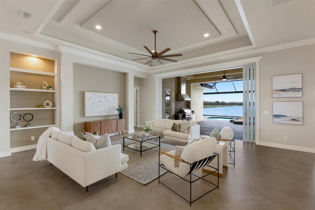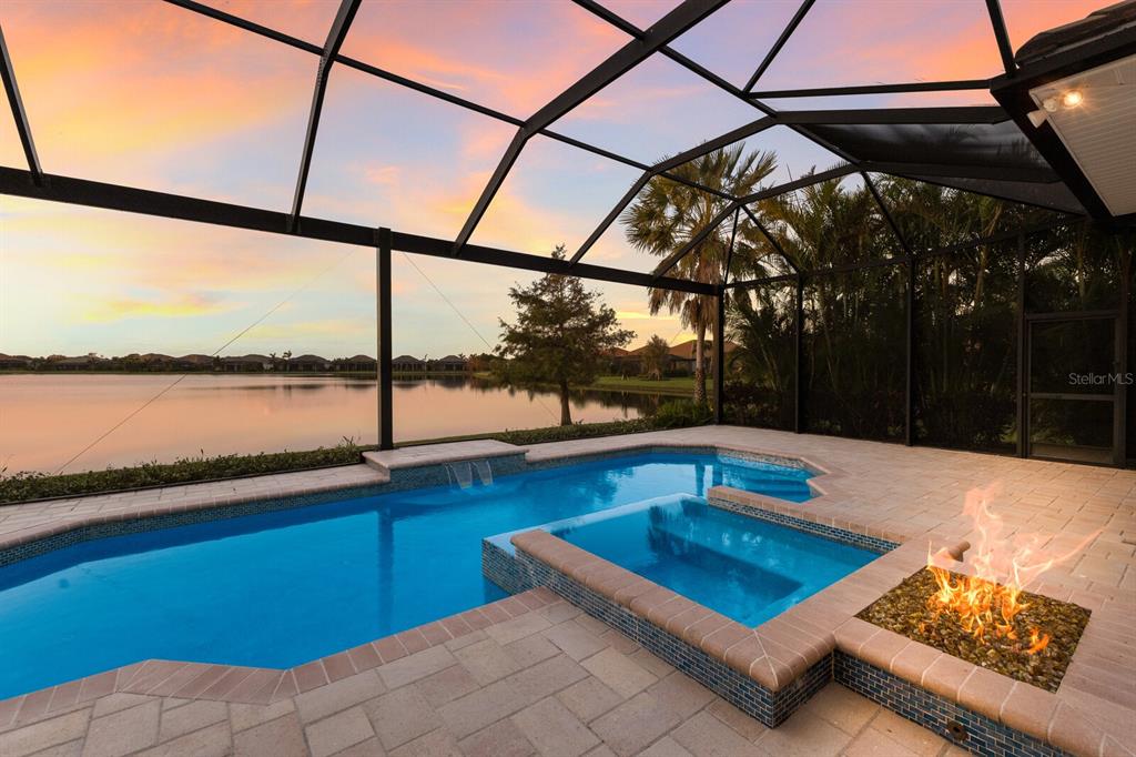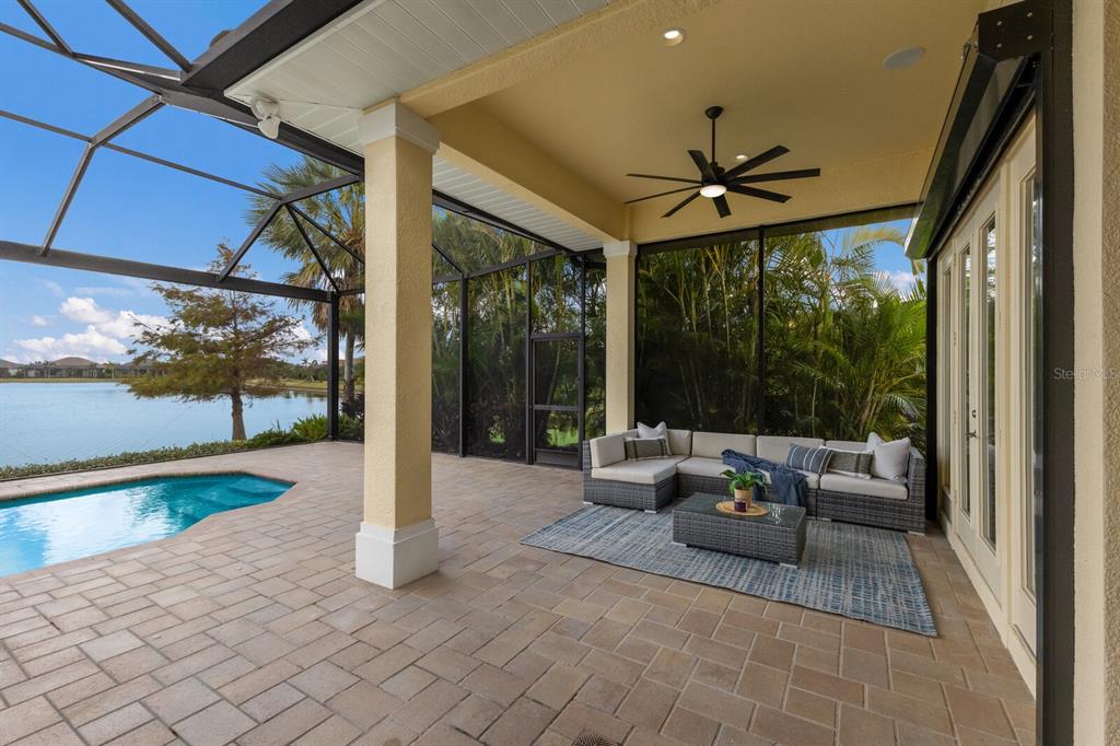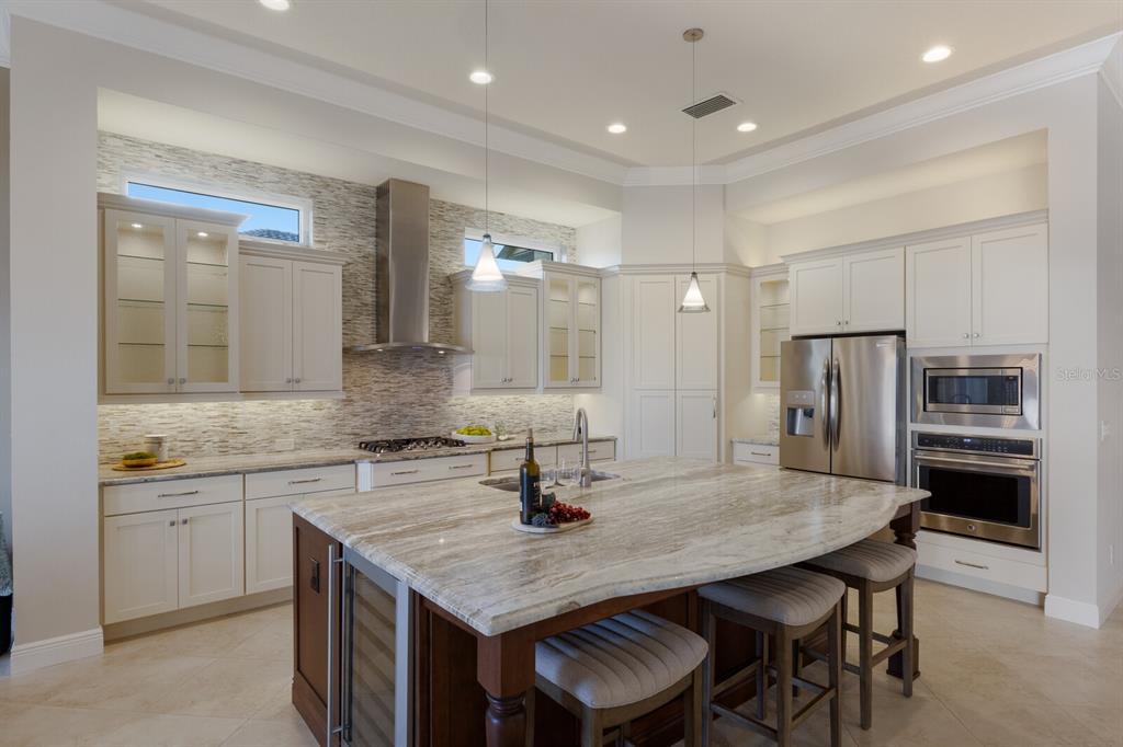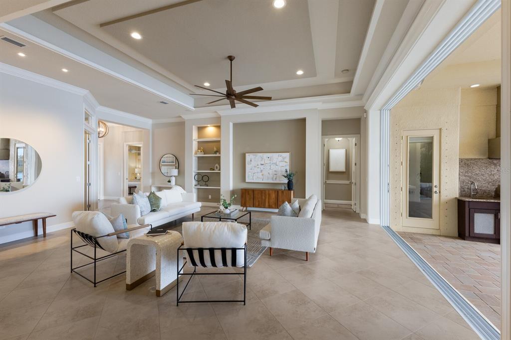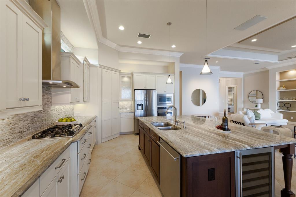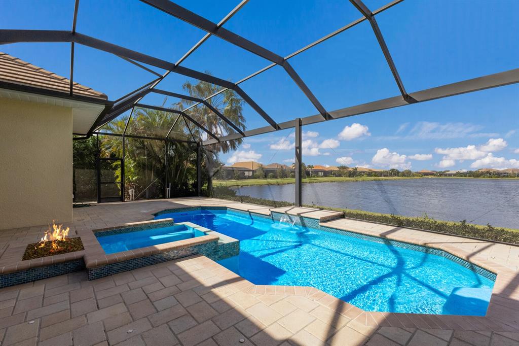 Long lake views take center stage from this three bedroom, three and a half bath residence built by the custom builder lee wetherington in the gated lakewood ranch community of country club east, encompassing 2,803 square feet of one-story open concept living with the added benefit of a generator and new impact windows. an inviting outdoors boasts stellar vistas, abundant under cover spaces, full summer kitchen, pebbletec heated pool/spa with fire feature, hurricane screens, and a panoramic clear view lanai screen. ten foot impact glass walls seamlessly disappear connecting the outdoor living space to the great room, kitchen and dining area adorned with porcelain tile flooring, volume tray ceilings, and custom built-in shelving. the open and inviting kitchen is a culinary haven, showcasing granite counters, light cabinetry, pull-out drawers, stylish backsplash, over and under cabinet accent lighting, stainless steel appliances, hidden walk-in pantry, and a generous island with a temperature controlled wine fridge. relax and unwind in the owner’s quarters positioned on a private wing, offering stunning views overlooking the long lake, tray ceiling, two customized walk-in closets, and a luxuriously appointed bath with two separate vanity stations, make up area, granite counters, a walk-in frameless shower and soaking tub. two additional guest rooms, each on separate wings of the home are generous in size, one is ensuite with a private full bath, while the other has access to the home’s third full bath. the residence also offers an ideal office behind double-entry doors just off the great room with built-in cabinetry, desk and shelving. other notable highlights of this 4,001 total square foot residence includes a smartly positioned half bath off the lanai, an optimal laundry room with cabinetry, sink, and larger walk-in closet, whole-home generator, impact windows and sliders, hurricane shutters, tankless water heater, sizable crown molder, closets and storage spaces throughout, landscape lighting, icenyne insulation, and a courtyard side load 3-car garage with abundant built-in cabinetry. country club east provides its residents with the privacy of gated-community living, three community pools, and fitness center, all within a renowned community infamous for its vibrant lakewood ranch lifestyle near dining, shopping, polo, golf, tennis, community events and still close to the utc area, the beaches of sarasota, and, of course, in an a-rated school district near out-of-door academy and just a few miles from img. residents also have the non-mandatory option to become members of the lakewood ranch golf and country club, which offers four championship golf courses, two clubhouses, tennis, pickelball, fitness center, heated pools, full social calendar and so much more..7216 PRESTBURY, LAKEWOOD RANCH, FL 34202