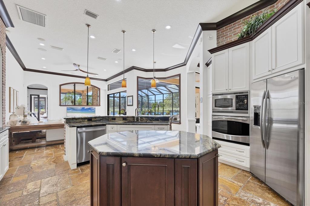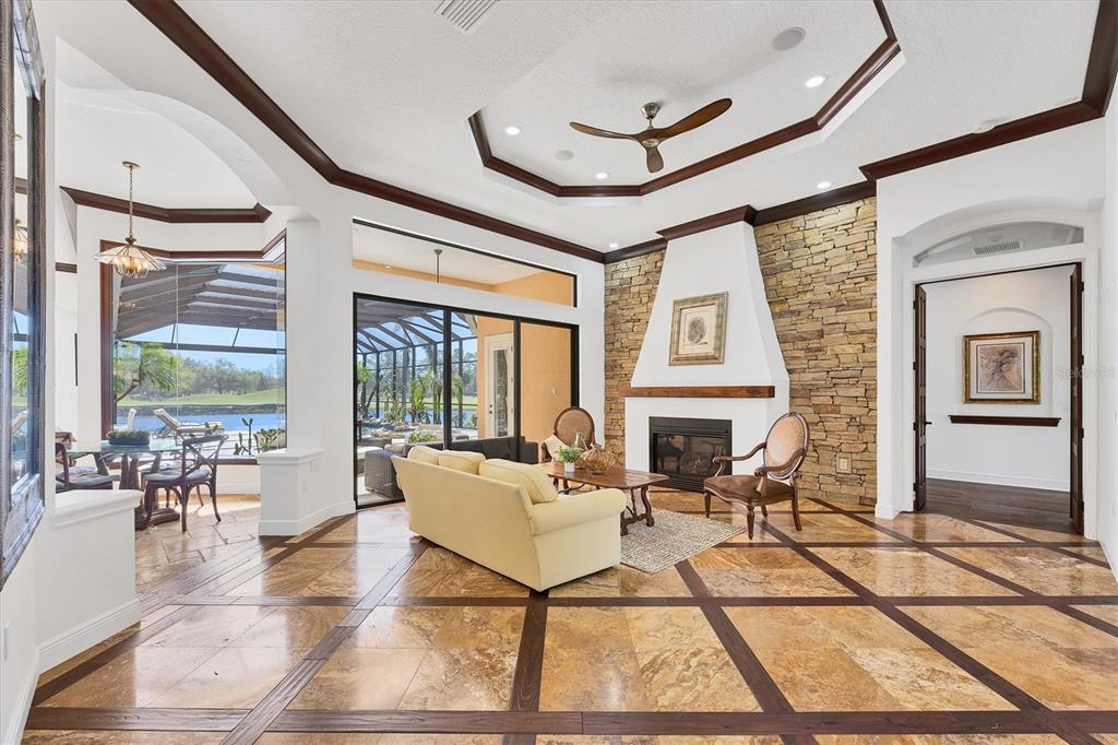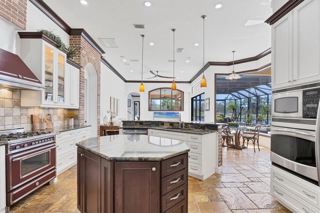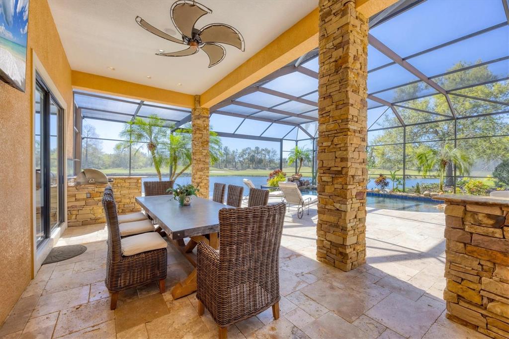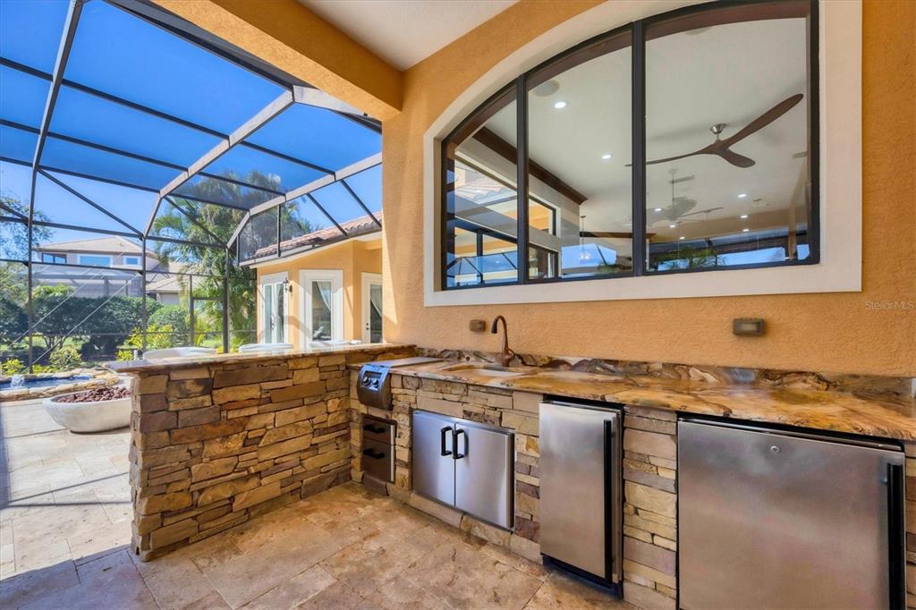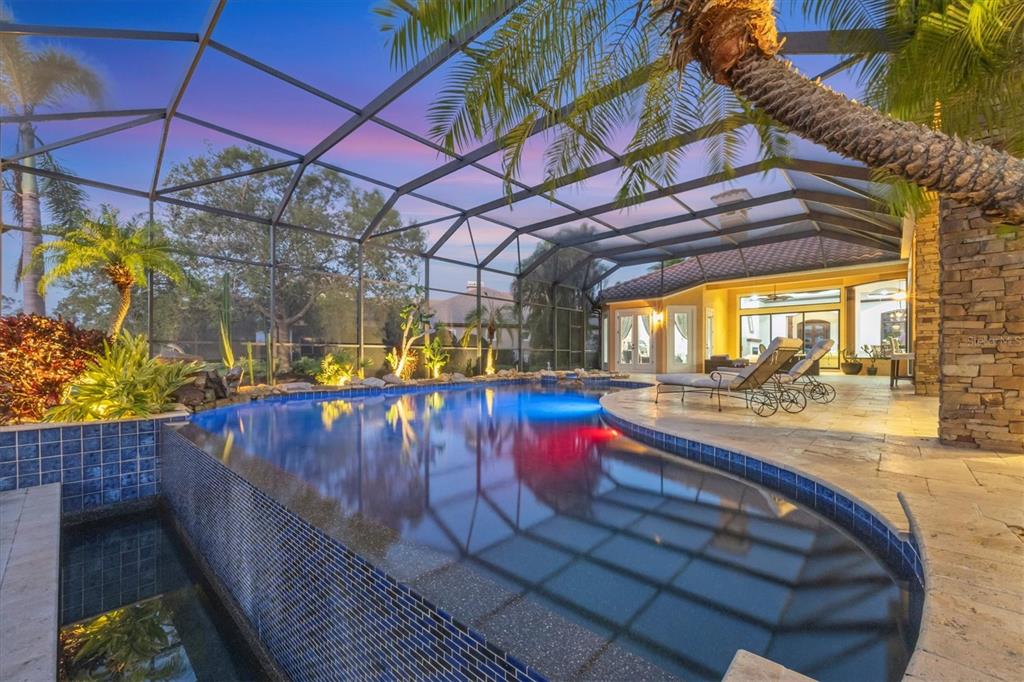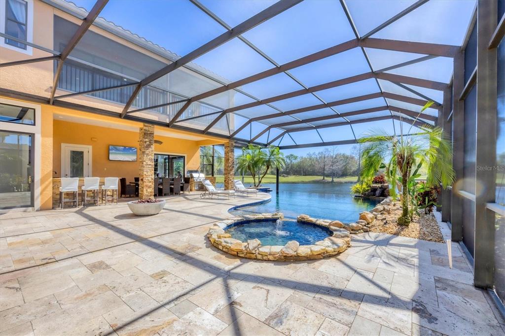 The opportunity to own a unique, custom home in greystone, a coveted enclave within lakewood ranch country club, does not come on the market often. and even more rare is finding this spectacular location enjoying wrapping majestic lake and golf course views. situated on one of the largest lots in greystone, this residence enjoys prime views of the 2nd hole of the king’s dune course designed by arnold palmer. arrive from oak-lined streets to your spacious pie-shaped lot with a quiet cul-de-sac location and expanded paver driveway. inside, the story of this home unfolds with hand-selected custom elements from the 100-year-old mahogany crown molding salvaged from sarasota yacht club, travertine and wood flooring imported from turkey, and expanded floor plan with enhanced room sizes. architectural columns and archways grace the front entry and set the stage for the impressive views. the formal living room has a cozy fireplace with stacked stone and a vintage 1895 pine mantle. the natural elements continue into the kitchen with brick walls and granite counters, plus a central prep and storage island, and perimeter island with bar-height seating. the chef is sure to appreciate the state-of-the-art italian bertazzoni gas range, plus upgraded stainless steel appliances, and plentiful cabinetry. enjoy your meals in the formal dining room, or from the dinette with large aquarium window overlooking the lake and golf course. the family room offers a convenient place to gather with large windows and sliding glass doors to the lanai. inspired by the golf course, the owners envisioned an outdoor oasis on the lanai with natural elements and smart selections that complement the beautiful views including panoramic screen enclosure to highlight the views, infinity edge pool that creates a seamless water view to the lake, and rock elements that mirror the golf course. the travertine lanai also includes a built-in restoration hardware firepit, and large outdoor kitchen with stone counters, bar fridge, ice maker, burners, and gas grill. the owner’s suite features a spacious bedroom with french doors to the lanai, dual walk-in closets, and a spa-like bathroom with handcrafted flooring by a turkish artist, large jetted tub with custom surround, and a walk-in shower with kohler rain shower and body sprayers, frameless glass enclosure, and travertine surround. guests can select from 3 enlarged bedrooms and 3 guest bathrooms. this functional floor plan also features a study with turkish wood floors and custom built-in shelving on the first level, plus a loft, bonus room, media room, and balcony on the second level. the bonus room is also pre-plumbed for a future kitchenette and the entire second level can be easily turned into a private in-law suite. don’t forget about the expanded 3-car garage that is large enough to fit 5 cars or can be used as extra storage. peace of mind is secured with impact windows and sliders throughout, surge protector, upgraded pool equipment, 2 ac units in 2023 and 1 in 2018, two tankless water heaters, central vacuum system, and more! appreciate a state-of-the-art fitness center, clubhouses, junior olympic-sized pool, four 18-hole championship golf courses, tennis and pickleball, and more by becoming a member of the lakewood ranch country club. lakewood ranch is the top multi-generational community in the country for 7 years in a row with award-winning shopping, dining, a-rated schools, parks, and nearby beaches.7327 GREYSTONE, LAKEWOOD RANCH, FL 34202