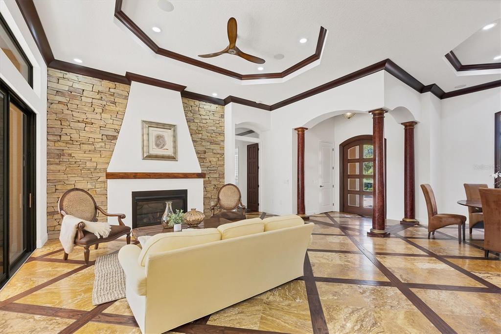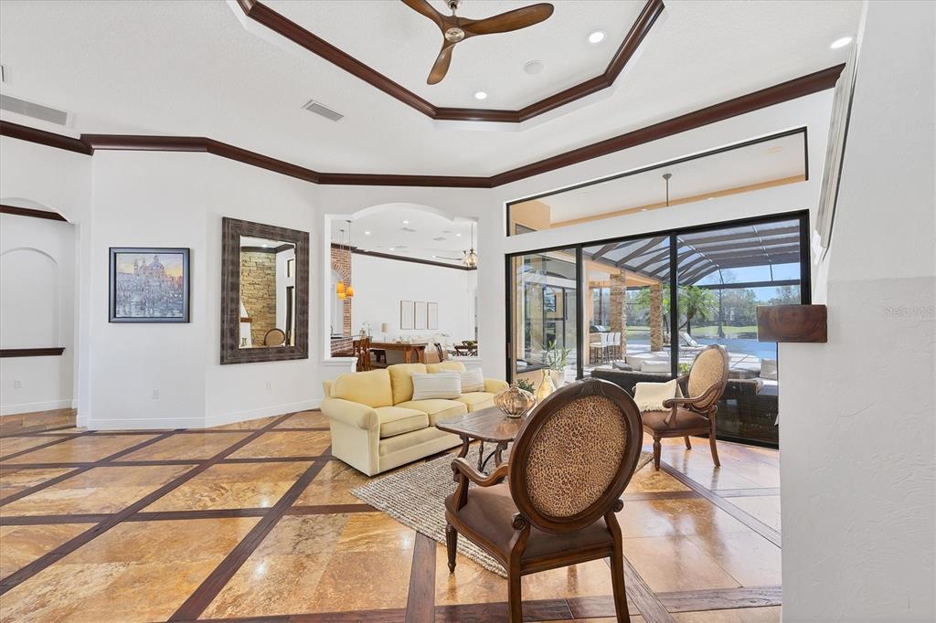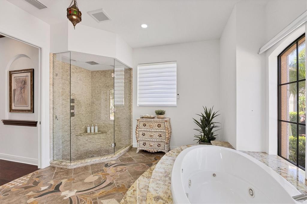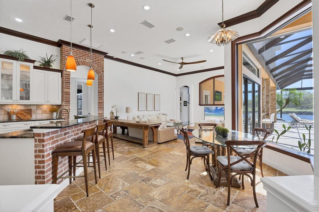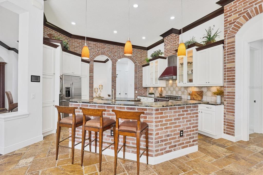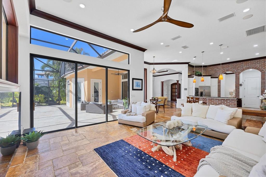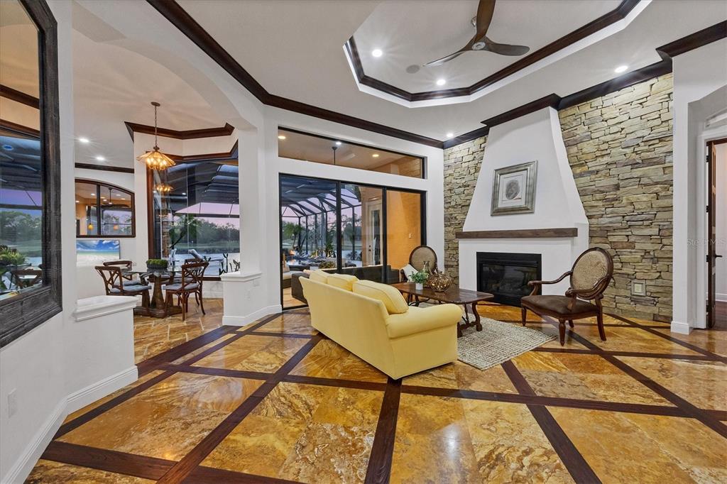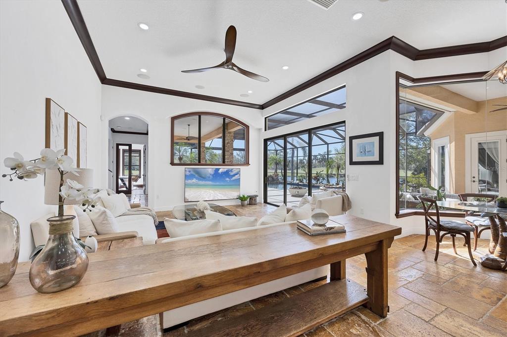 The opportunity to own a unique, custom home in greystone, a coveted enclave within lakewood ranch country club, does not come on the market often. and even more rare is finding this spectacular location enjoying wrapping majestic lake and golf course views. situated on one of the largest lots in greystone, this residence enjoys prime views of the 2nd hole of the king’s dune course designed by arnold palmer. arrive from oak-lined streets to your spacious pie-shaped lot with a quiet cul-de-sac location and expanded paver driveway. inside, the story of this home unfolds with hand-selected custom elements from the 100-year-old mahogany crown molding salvaged from sarasota yacht club, travertine and wood flooring imported from turkey, and expanded floor plan with enhanced room sizes. architectural columns and archways grace the front entry and set the stage for the impressive views. the formal living room has a cozy fireplace with stacked stone and a vintage 1895 pine mantle. the natural elements continue into the kitchen with brick walls and granite counters, plus a central prep and storage island, and perimeter island with bar-height seating. the chef is sure to appreciate the state-of-the-art italian bertazzoni gas range, plus upgraded stainless steel appliances, and plentiful cabinetry. enjoy your meals in the formal dining room, or from the dinette with large aquarium window overlooking the lake and golf course. the family room offers a convenient place to gather with large windows and sliding glass doors to the lanai. inspired by the golf course, the owners envisioned an outdoor oasis on the lanai with natural elements and smart selections that complement the beautiful views including panoramic screen enclosure to highlight the views, infinity edge pool that creates a seamless water view to the lake, and rock elements that mirror the golf course. the travertine lanai also includes a built-in restoration hardware firepit, and large outdoor kitchen with stone counters, bar fridge, ice maker, burners, and gas grill. the owner’s suite features a spacious bedroom with french doors to the lanai, dual walk-in closets, and a spa-like bathroom with handcrafted flooring by a turkish artist, large jetted tub with custom surround, and a walk-in shower with kohler rain shower and body sprayers, frameless glass enclosure, and travertine surround. guests can select from 3 enlarged bedrooms and 3 guest bathrooms. this functional floor plan also features a study with turkish wood floors and custom built-in shelving on the first level, plus a loft, bonus room, media room, and balcony on the second level. the bonus room is also pre-plumbed for a future kitchenette and the entire second level can be easily turned into a private in-law suite. don’t forget about the expanded 3-car garage that is large enough to fit 5 cars or can be used as extra storage. peace of mind is secured with impact windows and sliders throughout, surge protector, upgraded pool equipment, 2 ac units in 2023 and 1 in 2018, two tankless water heaters, central vacuum system, and more! appreciate a state-of-the-art fitness center, clubhouses, junior olympic-sized pool, four 18-hole championship golf courses, tennis and pickleball, and more by becoming a member of the lakewood ranch country club. lakewood ranch is the top multi-generational community in the country for 7 years in a row with award-winning shopping, dining, a-rated schools, parks, and nearby beaches.7327 GREYSTONE, LAKEWOOD RANCH, FL 34202
