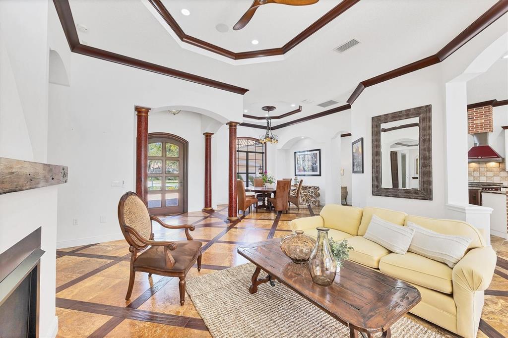 Split BedroomBuilt-in Features Walk-In Closet(s)Ceiling Fan(s) Eating Space In Kitchen High Ceilings Stone Counters Window Treatments Solid Wood CabinetsCrown Molding Primary Bedroom Main Floor Kitchen/Family Room Combo Tray Ceiling(s) In Wall Pest System Central VacuumExterior Features: