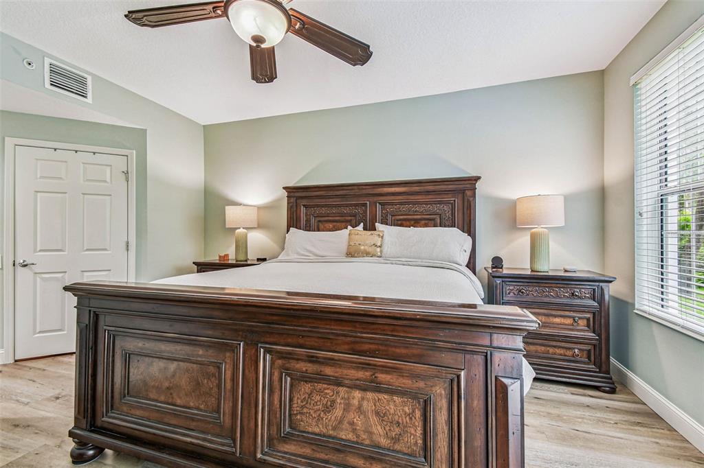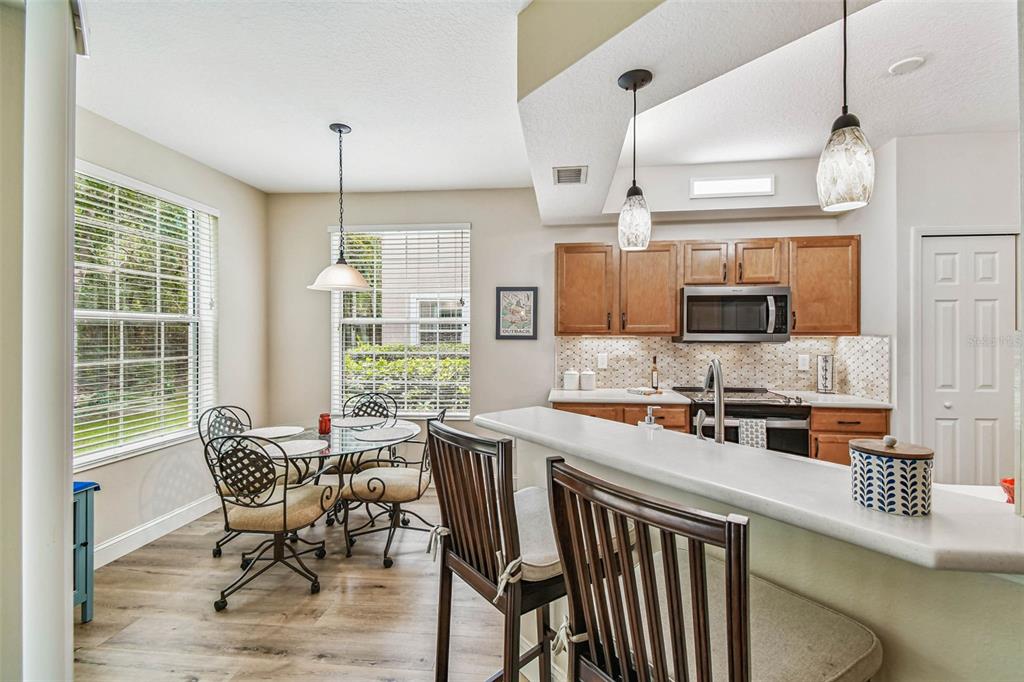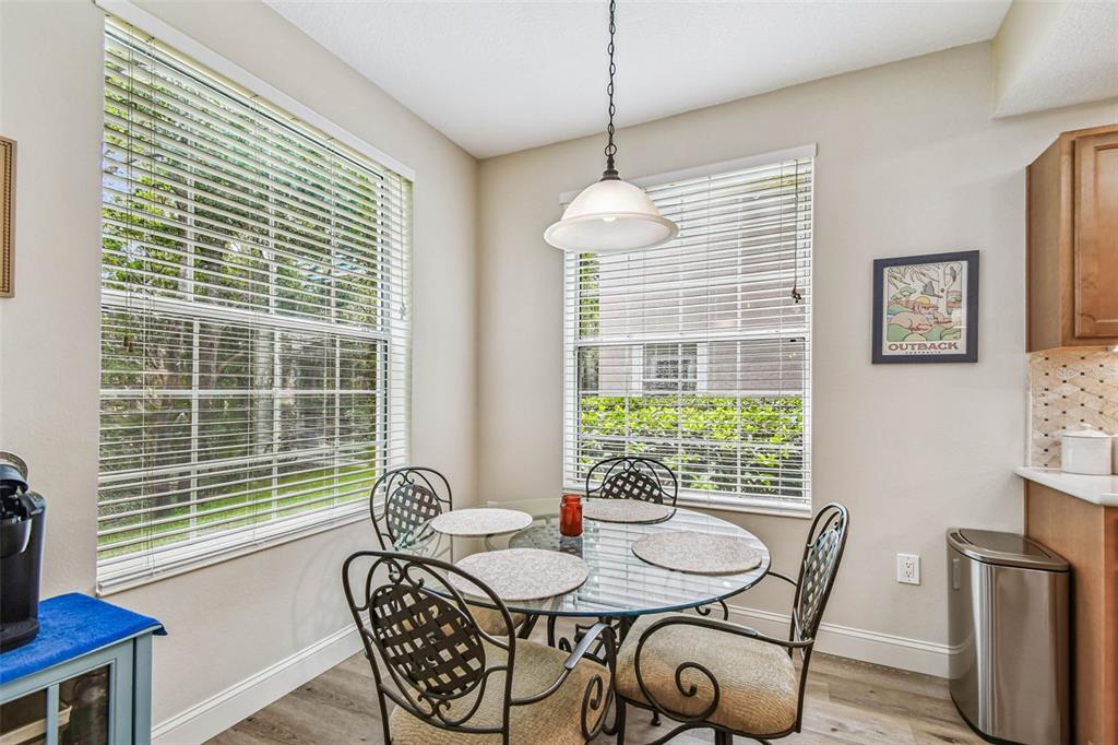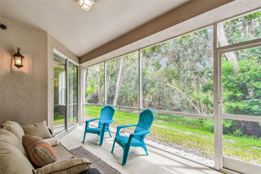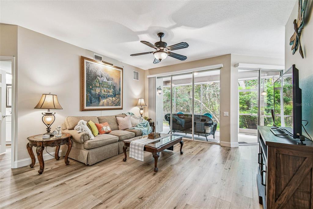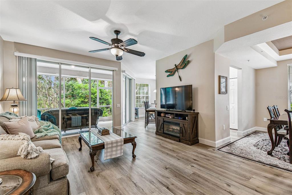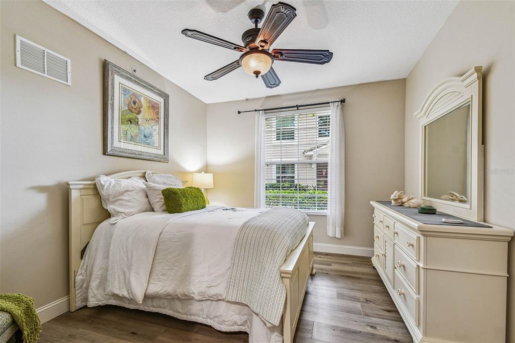 Serene and elegant ground floor condo steps from the open-air heated pool, in a quiet gated park-like pet friendly community. no flood/no evacuation zone, elevation 70'. most popular model sandpiper, a ground floor corner condo located on the reserve, a protected natural wetland. gated courtyard entry, covered front door. condo is rear-facing, spacious light & airy living room with 9’ceilings bordered by sliding glass doors overlooking lanai. foyer and dining room have trayed ceilings. kitchen has whirlpool appliances (2024), tiled back splash, under-cabinet and enhanced ceiling lighting. eat-in breakfast nook with breakfast bar overlooking lanai and landscaped grounds and reserve. lanai is private with large sliding glass doors (8'tall) leading from the breakfast nook, primary bedrm and living rm. primary bedroom has 2 walk-in closets, small linen closet, en-suite bath. en-suite bath has garden tub, separate walk-in glass & tile shower, double-sink vanity with storage, commode closet. double-doored entry to spacious third bedroom/library/office/den without closet overlooking gated front courtyard. second bedroom is large with front-facing window. laundry room with storage can accommodate side by side appliances. oversized one-car garage with storage and attic access. includes original custom hurricane shutters, hurricane rated garage door with opener, fire sprinkler system, individual vendor security system. a/c replaced 2023. private double gated loop road, mature landscaping with oak & magnolia trees. the community center houses mailboxes, well-equipped fitness center, and heated open-air community pool. waste-water lift-station generator (2019) in case of power outages. roof is included in condo monthly fee. minutes to world-class honeymoon island, clearwater beach. close-by shopping includes several publix’s, whole foods, trader joe's, sprouts, barnes and noble, clearwater mall, and countryside mall. close to tampa international, clearwater-st. petersburg airport, city of clearwater municipal airport. easy access to tampa rd, courtney campbell causeway, i-275. condo assoc approval is required for purchase or lease. verify with condo assoc for specific questions. room measurements are based on publicly published pulte floorplan.826 LANTERN #103, CLEARWATER, FL 33765