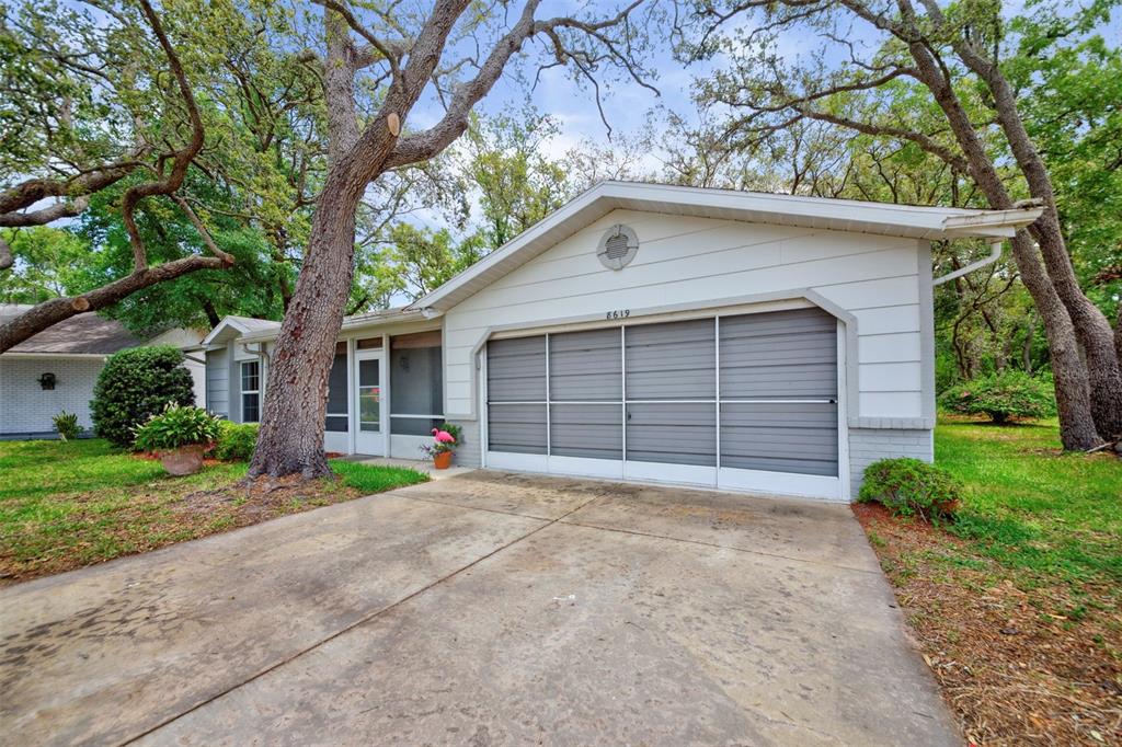 Lowered the price for labor day weekend viewing! don't miss this darling, well maintained home in a cul de sac in timber oaks, 55+ community! it sits on a unique lot, with magnificent trees, and a large back patio to enjoy nature, or to entertain a group barbeque! this block, 2 bedroom, 2 bath, home is true open concept, with exceptional living space, and beautiful view to the shaded back yard. the eat-in kitchen and back bedroom can be closed off by glass french doors, which are a designer touch. the kitchen features newer lg appliances, a large pantry, and plenty of counter seating. the front entry has an enclosed tile porch, as well as ceiling fans - another perfect spot to enjoy the outdoors. the 2 car garage has washer/dryer hook-up, and screened for ventilation. the garage holds hurricane measured plywood and non-invasive attachments for all windows. they are marked. the hvac system was totally reworked in june,'25- unit is 2013. the hoa is $55/month. the clubhouse, pool, shuffleboard and "sociability" are available to you! this is a true value today!8619 GOLD PNE, PORT RICHEY, FL 34668