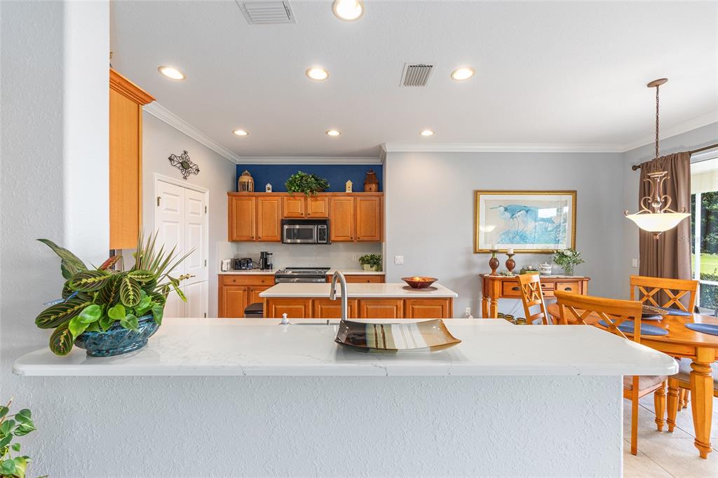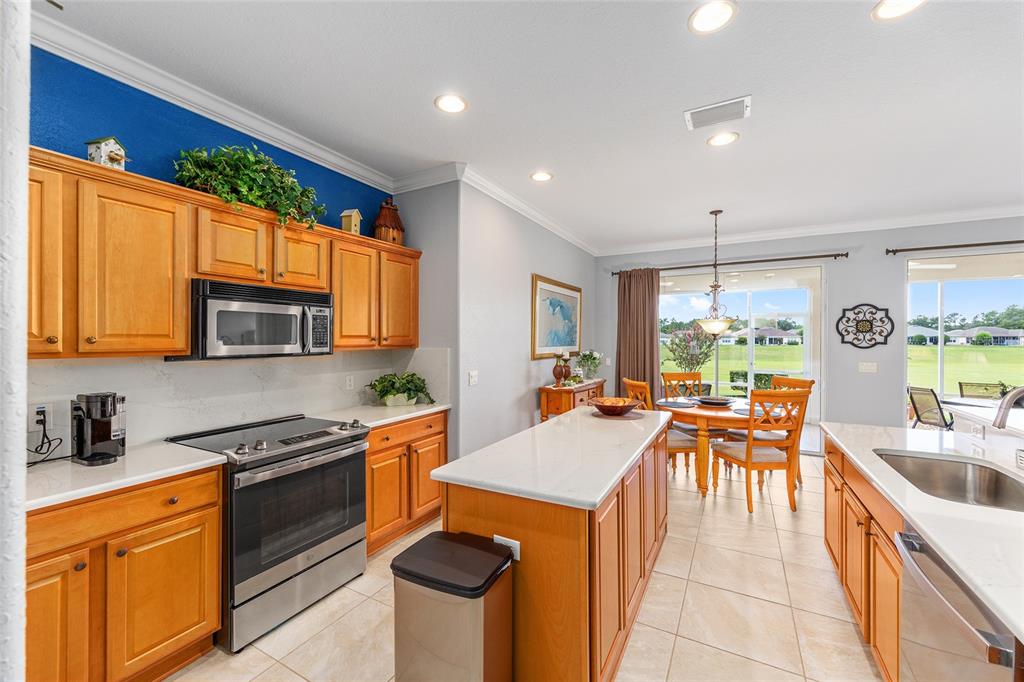 How about a 10-acre backyard that is maintenance free, you do not have to care for?? this beautiful johnstown model has been freshly painted interior and exterior, and boasts many added improvements, including crown molding throughout, easy-care luxury vinyl plank wood look flooring in bedrooms and den, 20-inch stone-look ceramic tile in main living area (no carpet in this home) and, wow!, plantation shutters throughout the home. beautiful leaded glass double entry doors open to 2,120 square feet featuring 3 spacious bedrooms and a den, the home sits on a lot that overlooks a dry retention area which is beautifully maintained and groomed, providing you with a gorgeous view from the main living area. a split-bedroom layout provides comfort for guests, with secondary bedrooms located opposite the private primary suite. the kitchen has an island and features and a dining area, and quartz countertops and backsplash. upgraded maple cabinets and newer ge stainless steel appliances. laundry room features new maytag washer/dryer and lots of counter and cabinet space! there's a laundry sink in the garage. new shark epoxy coating applied to driveway, walkway, and garage floor. the air handler, which was originally located in an inside closet next to the kitchen, has been moved to the garage, creating an extra storage space and eliminating the sound of a running a/c. hvac 2014. roof 2017. see the community website for more details and updates. the hoa fee is only $211/ month, making it a excellent value for access to such a wide range of recreational activities and services within a gated, golf- cart friendly community, conveniently located within 4 miles of the villages. this home has been meticulously maintained and tastefully updated. it looks like a brand new home! award-winning del webb spruce creek golf & country club is a gated, 3,250 home, +55 community with over 70 clubs, 3 pools, 3 spas, a clubhouse, a fitness center, bocce ball, shuffleboard, 12 pickle ball courts, 7 tennis courts, sand volleyball, water volleyball, lake vista gazebo, pavilions, walking paths and so much more! come see this beautiful community with a gorgeous tree canopy on the boulevard and its restaurant, liberty grille. come, enjoy the four (4) 9-hole golf courses today and begin living your best life! don't wait to see this beautiful home8924 SE 118TH, SUMMERFIELD, FL 34491