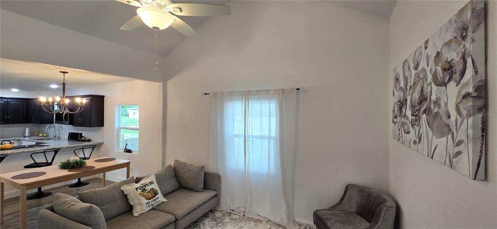 Walk-In Closet(s) Vaulted Ceiling(s)Ceiling Fan(s) Eating Space In Kitchen High Ceilings Living Room/Dining Room Combo Stone Counters Thermostat Open Floorplan Window Treatments Solid Surface Counters Solid Wood Cabinets Primary Bedroom Main Floor Kitchen/Family Room ComboCathedral Ceiling(s)Exterior Features:
