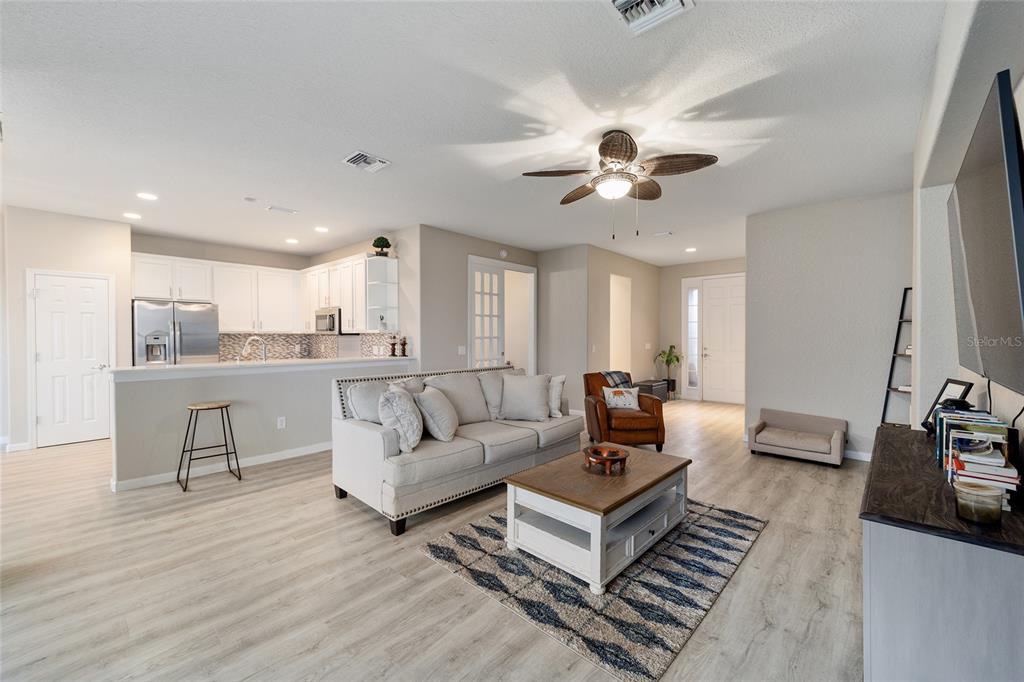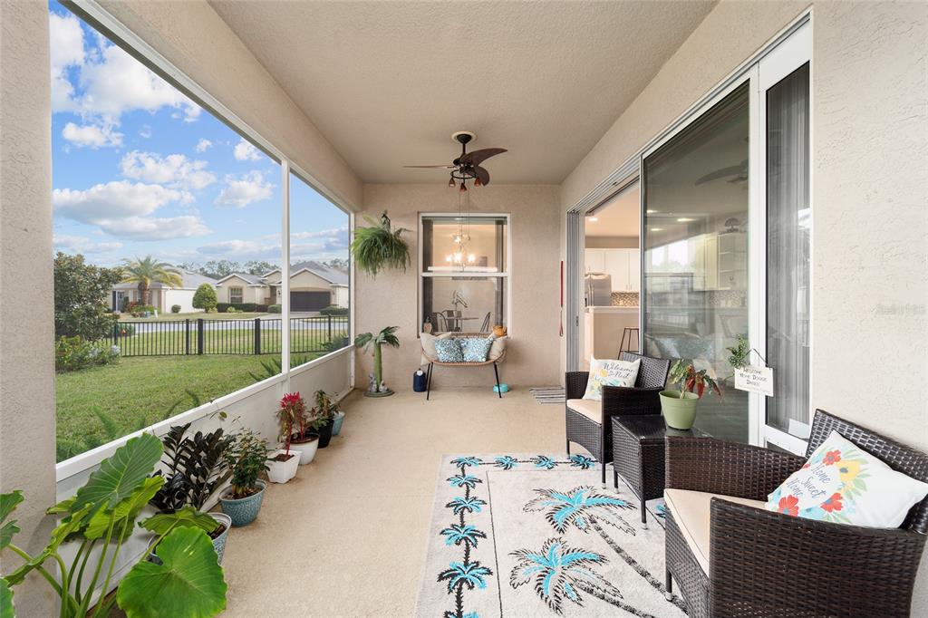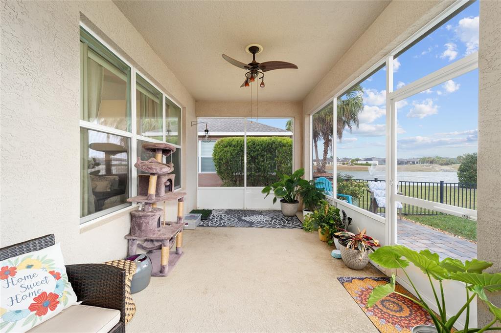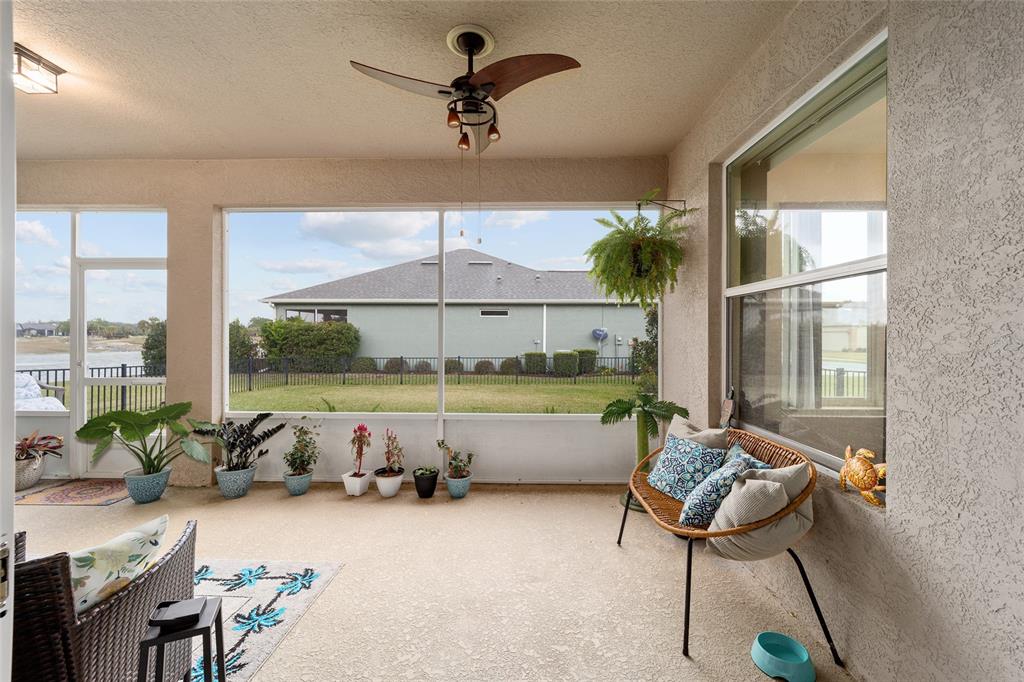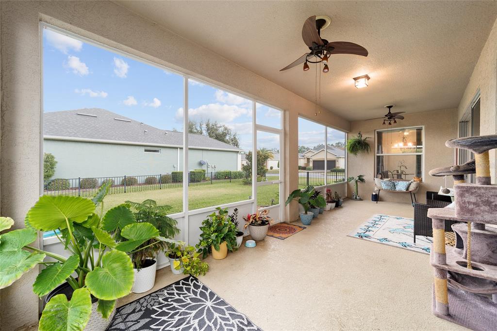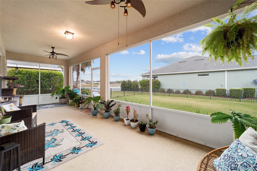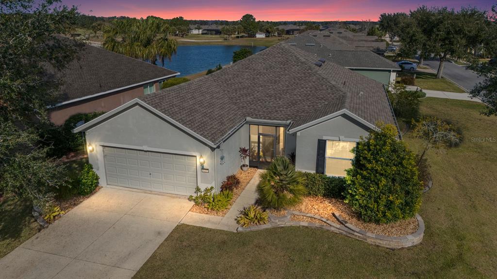Stetson model in stone creek by del webb with stunning views of the sebastian lake with its beautiful fountain and the golf course located just across the lake. this charming residence boasts 2 bedrooms, 2 bathrooms, a flex room/den, and a 2-car garage. inside, you'll find luxury vinyl flooring throughout the main living areas, primary bedroom, and bathroom, as well as elegant curved drywall corners and ceiling fans. the kitchen is fully upgraded with quartz countertops, a stylish backsplash, and stainless steel appliances. the owners' suite is filled with natural light and includes an en suite featuring an upgraded shower with a frameless glass door, granite countertop, and a spacious walk-in closet. the laundry room has upper cabinets, making it convenient for storing cleaning supplies. plus, the fenced yard is an ideal space for pet owners, while the screened lanai offers a tranquil retreat. the lanai has also been upgraded with a new screen. other notable features include a hideaway screen door, glass french doors in the den, a water softener, a new roof in 2022, a new ac system in 2021 and custom interior paint. don't miss the opportunity to visit this delightful house!9211 SW 66TH, OCALA, FL 34481