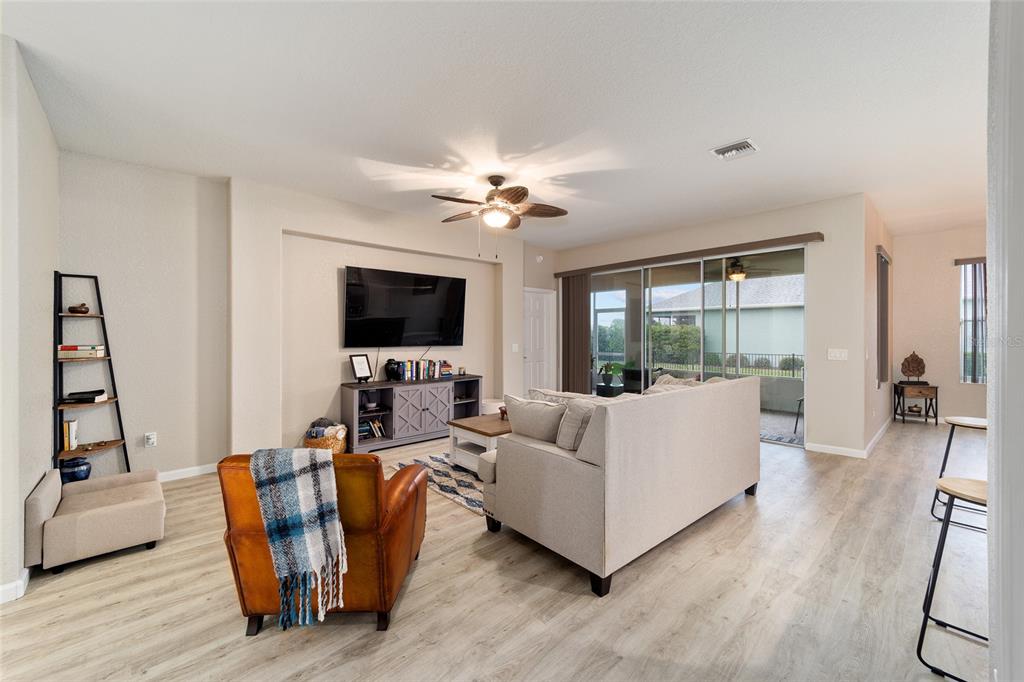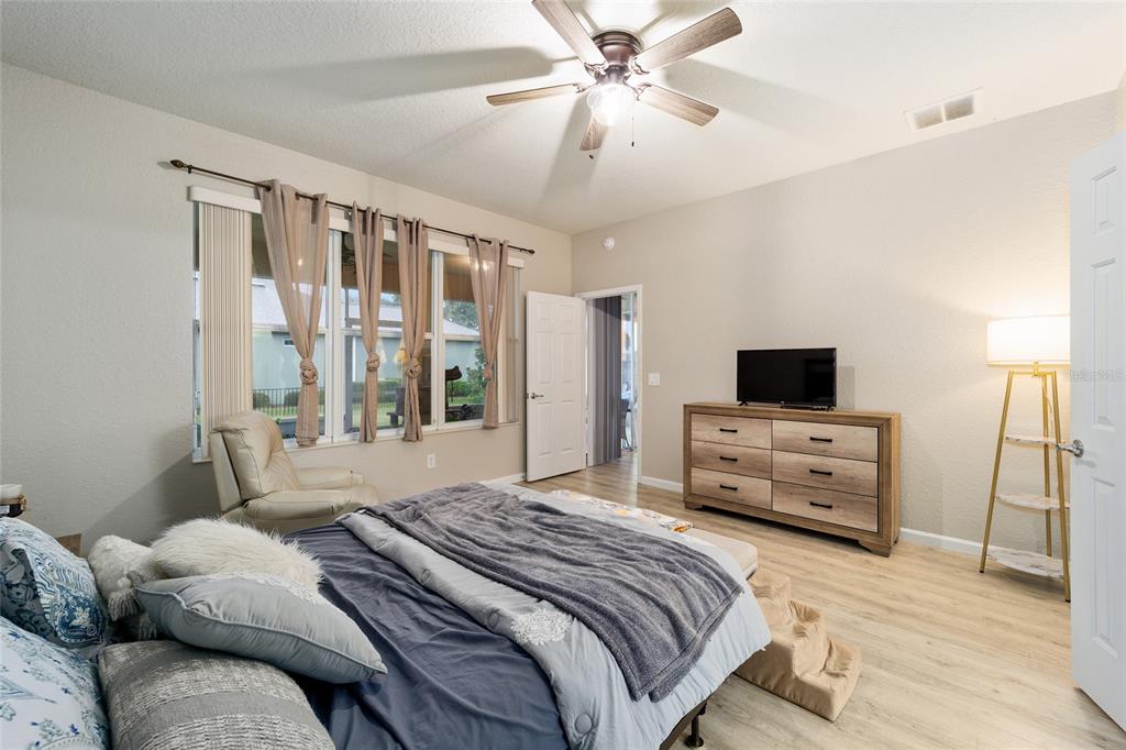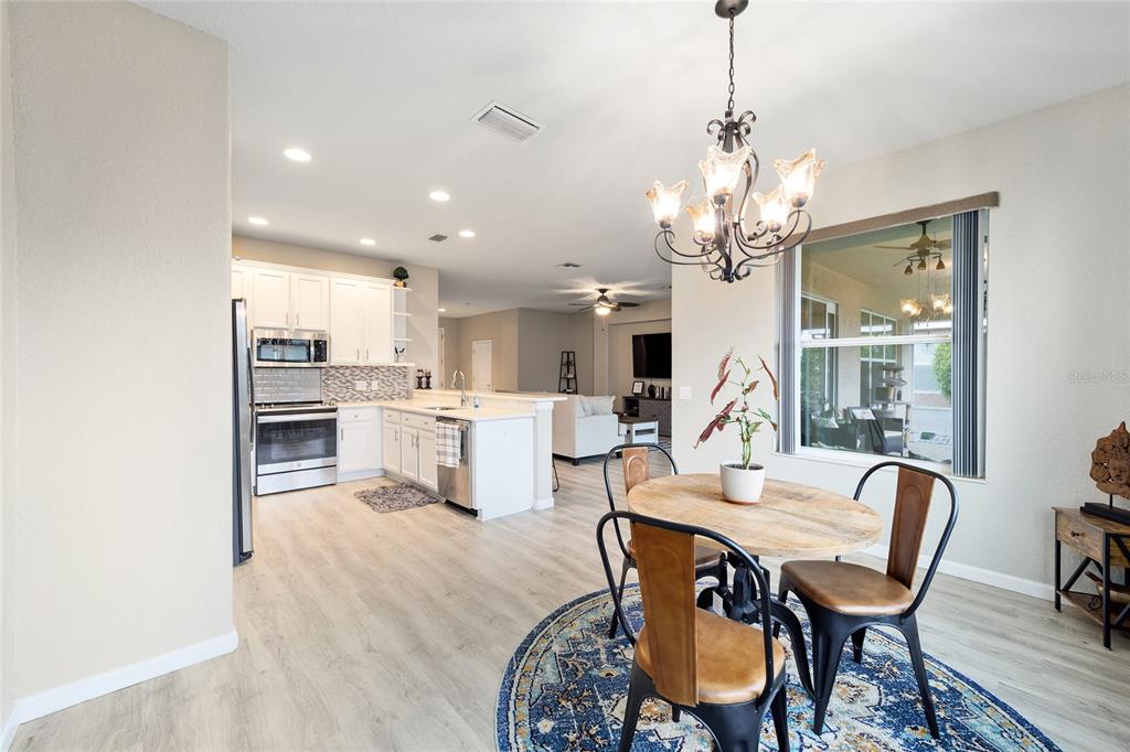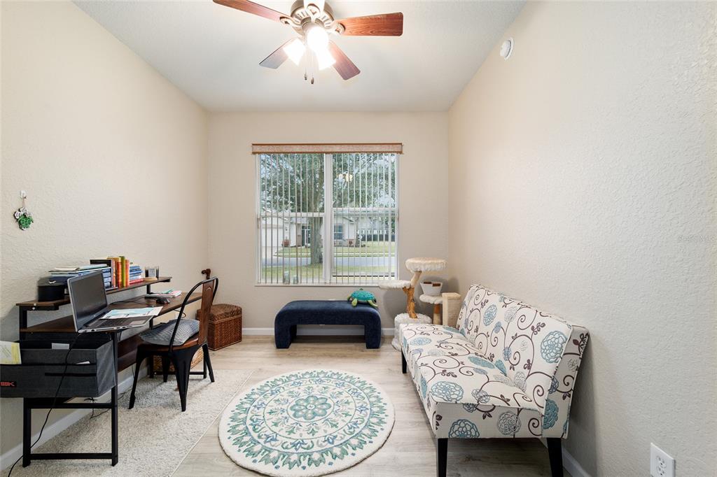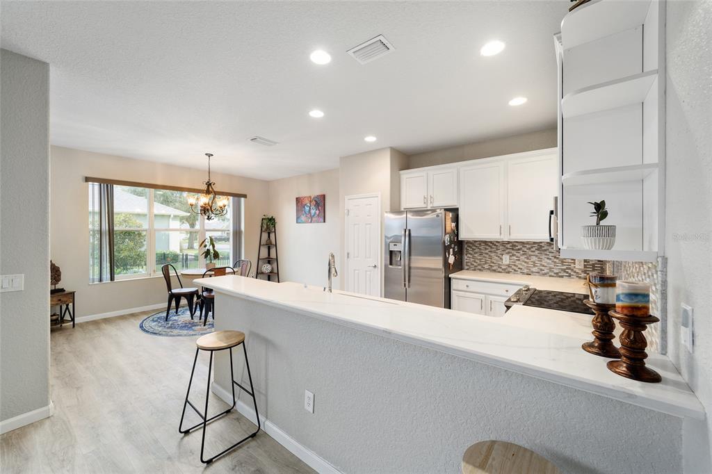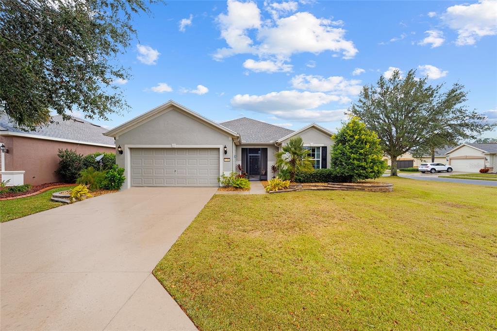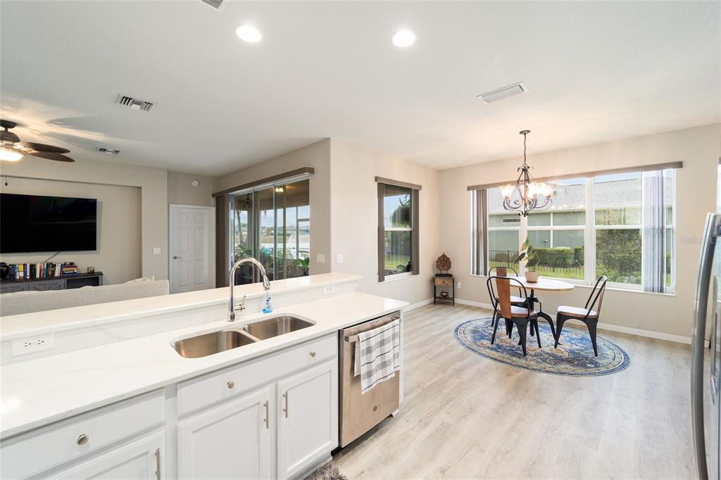 Stetson model in stone creek by del webb with stunning views of the sebastian lake with its beautiful fountain and the golf course located just across the lake. this charming residence boasts 2 bedrooms, 2 bathrooms, a flex room/den, and a 2-car garage. inside, you'll find luxury vinyl flooring throughout the main living areas, primary bedroom, and bathroom, as well as elegant curved drywall corners and ceiling fans. the kitchen is fully upgraded with quartz countertops, a stylish backsplash, and stainless steel appliances. the owners' suite is filled with natural light and includes an en suite featuring an upgraded shower with a frameless glass door, granite countertop, and a spacious walk-in closet. the laundry room has upper cabinets, making it convenient for storing cleaning supplies. plus, the fenced yard is an ideal space for pet owners, while the screened lanai offers a tranquil retreat. the lanai has also been upgraded with a new screen. other notable features include a hideaway screen door, glass french doors in the den, a water softener, a new roof in 2022, a new ac system in 2021 and custom interior paint. don't miss the opportunity to visit this delightful house!9211 SW 66TH, OCALA, FL 34481