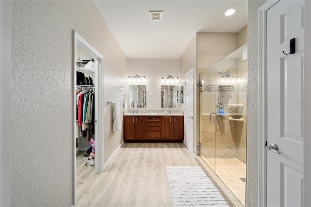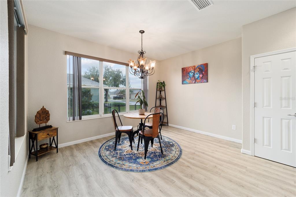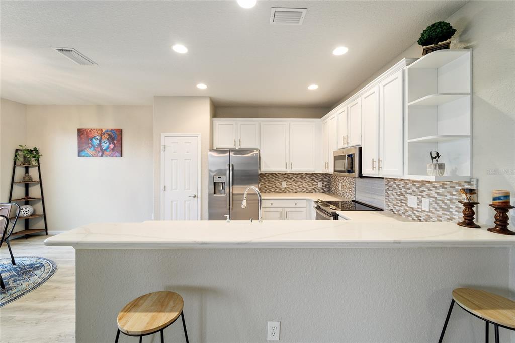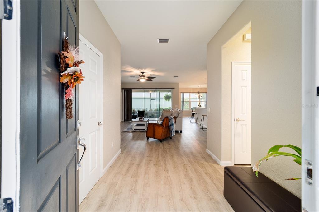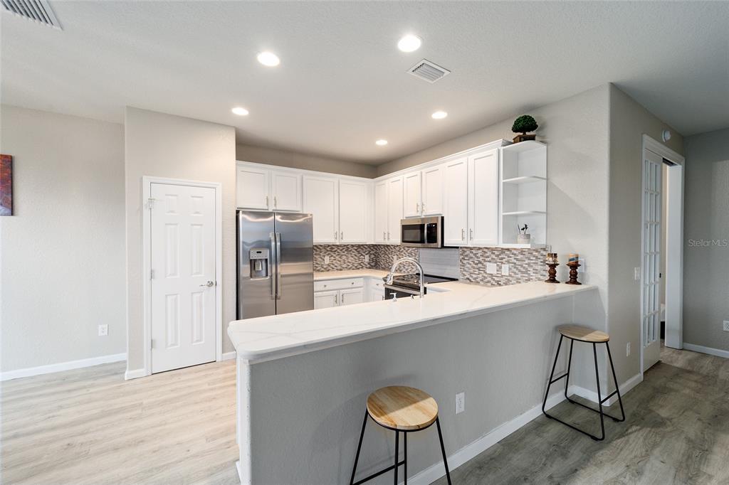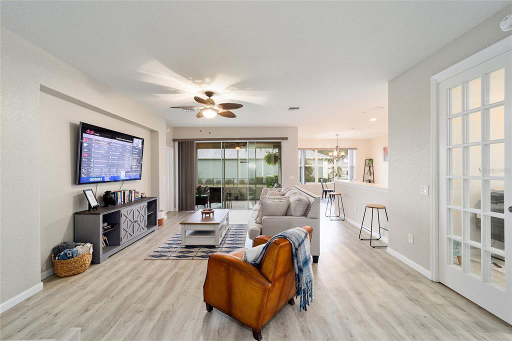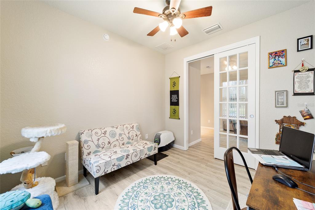 Stetson model in stone creek by del webb with stunning views of the sebastian lake with its beautiful fountain and the golf course located just across the lake. this charming residence boasts 2 bedrooms, 2 bathrooms, a flex room/den, and a 2-car garage. inside, you'll find luxury vinyl flooring throughout the main living areas, primary bedroom, and bathroom, as well as elegant curved drywall corners and ceiling fans. the kitchen is fully upgraded with quartz countertops, a stylish backsplash, and stainless steel appliances. the owners' suite is filled with natural light and includes an en suite featuring an upgraded shower with a frameless glass door, granite countertop, and a spacious walk-in closet. the laundry room has upper cabinets, making it convenient for storing cleaning supplies. plus, the fenced yard is an ideal space for pet owners, while the screened lanai offers a tranquil retreat. the lanai has also been upgraded with a new screen. other notable features include a hideaway screen door, glass french doors in the den, a water softener, a new roof in 2022, a new ac system in 2021 and custom interior paint. don't miss the opportunity to visit this delightful house!9211 SW 66TH, OCALA, FL 34481