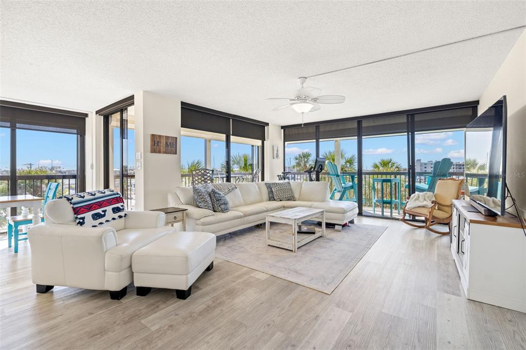 Waterfront corner unit in luxury gated yacht & tennis club of st pete beach. enjoy serene tropical views from your spacious wrap around balcony. tastefully updated 1430 square foot unit in coastal color scheme with solid wood white shaker cabinets, stone countertops, luxury vinyl plank floors, custom closets, open floor plan and 2 large bedrooms, each with its own walk-in closet. this building has a new roof and has passed the milestone structural study as well as the structural reserves requirements. amenities on the property include a marina, waterfront pool and spa, state-of-the-art fitness center with gorgeous water views, 7 hartru tennis courts with two lined for pickleball, an active and welcoming social calendar with many activities each month, saunas, shuffleboard, barbecue grills and onsite management and maintenance staff. a new seawall project will start towards april 2025 and will last for about 5 months - special assessment of $5293 will be paid in full by seller. this unit and most of the units in the community sustained no damage during the recent storms. the unit is protected by electric storm shutters. easy access to local beaches with a 5 minute stroll, restaurants and shops close by and under an hour to tampa international airport.9525 BLIND PASS #301, ST PETE BEACH, FL 33706