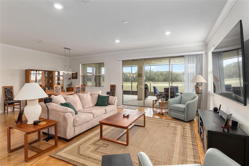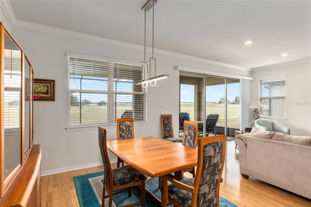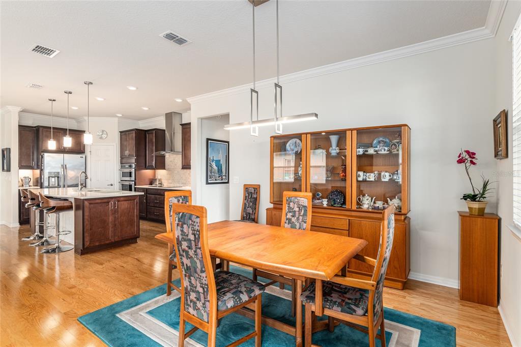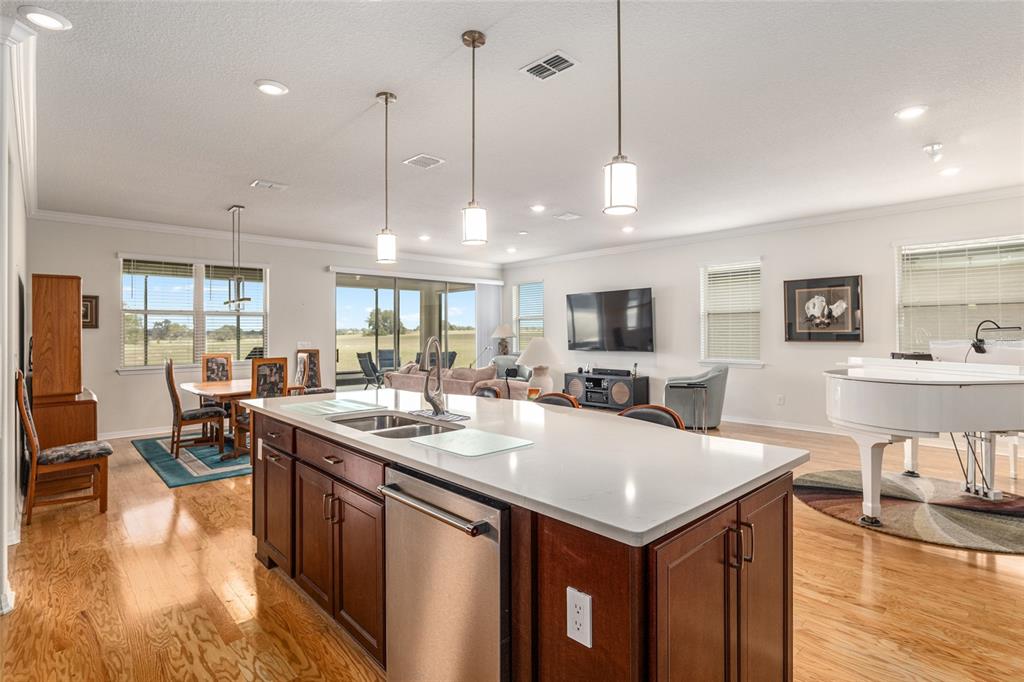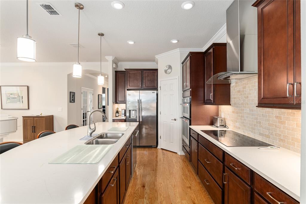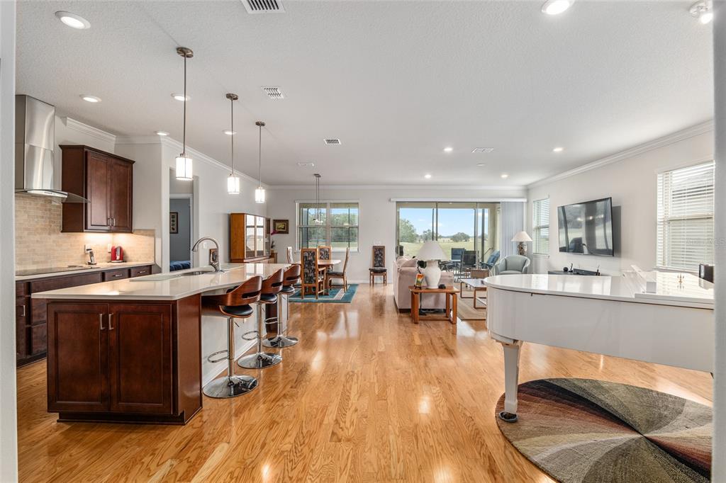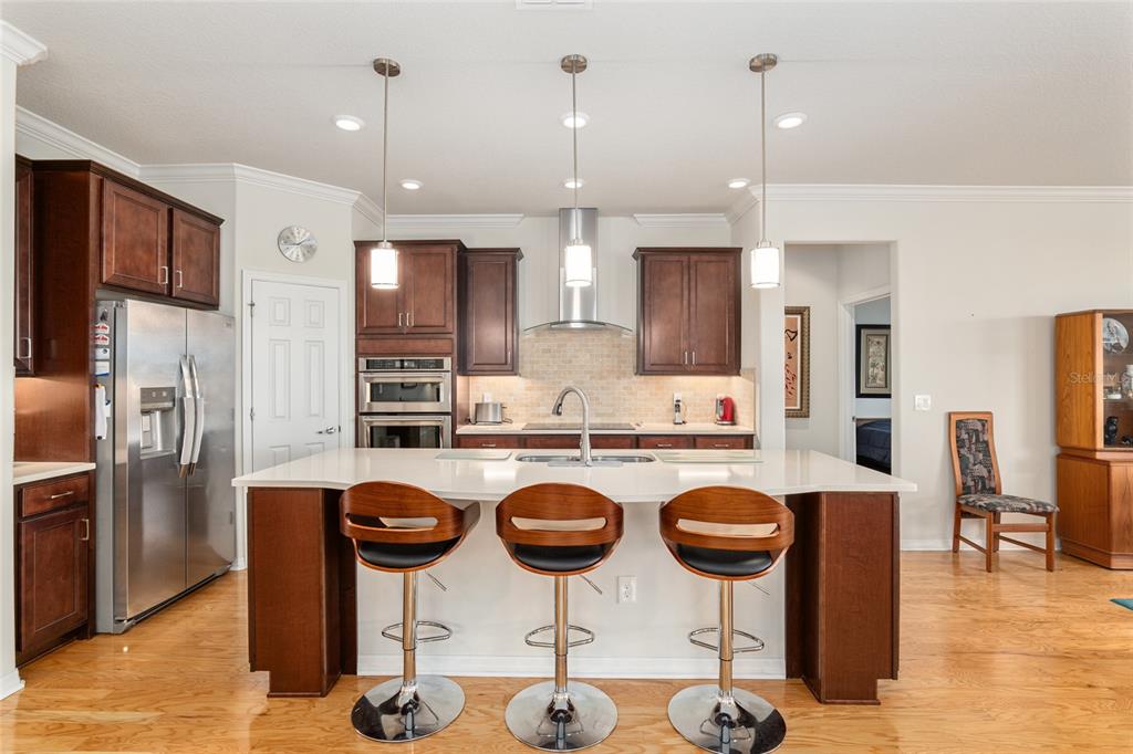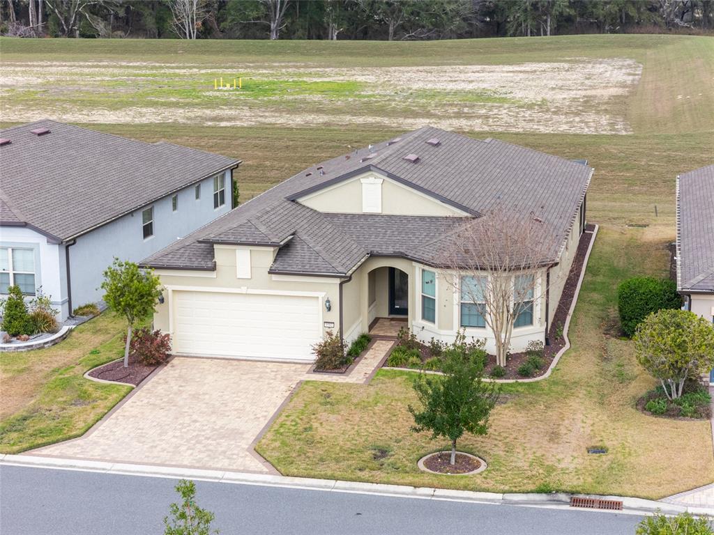 Welcome to stone creek, a popular senior community. this splendid two bedrooms, two bathrooms, and a flex room that could serve as a den or office. you will love this nearly new built home (2019) with gleaming hardwood floors throughout that enhances every room. custom paved driveway and walkway. expanded garage great for extra storage. enjoy a peaceful, and private evening in your outdoor living area in this expanded lanai. privacy is crucial for a serene backyard to relax in your outdoor space. this carefully planned kitchen has a convenient work area. you will love the look of this kitchen with mahogany cabinets, quartz counter tops, stainless appliances, contemporary backsplash and pantry. a large island with counter stools for small intimate dining. triple tea lighting over island. modern convertible wall mount stainless steel range hood. dimmer light switches. recess lighting. the foyer opens up to the kitchen and expanded great room with room for informal dining. crowned molding throughout. master bedroom with walk in shower and large walk-in closet. extra-long vanity in master bedroom with double sinks. a quiet separate bedroom wing for your guest. spacious laundry room with an abundance of wood mahogany cabinets. this lovely neighborhood pride is reflected in the well-kept homes of your future neighbors. stone creek, a secure gated del webb community that has outstanding activities. careful buyers, be sure to visit this one.9581 SW 63RD, OCALA, FL 34481