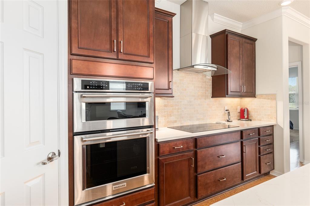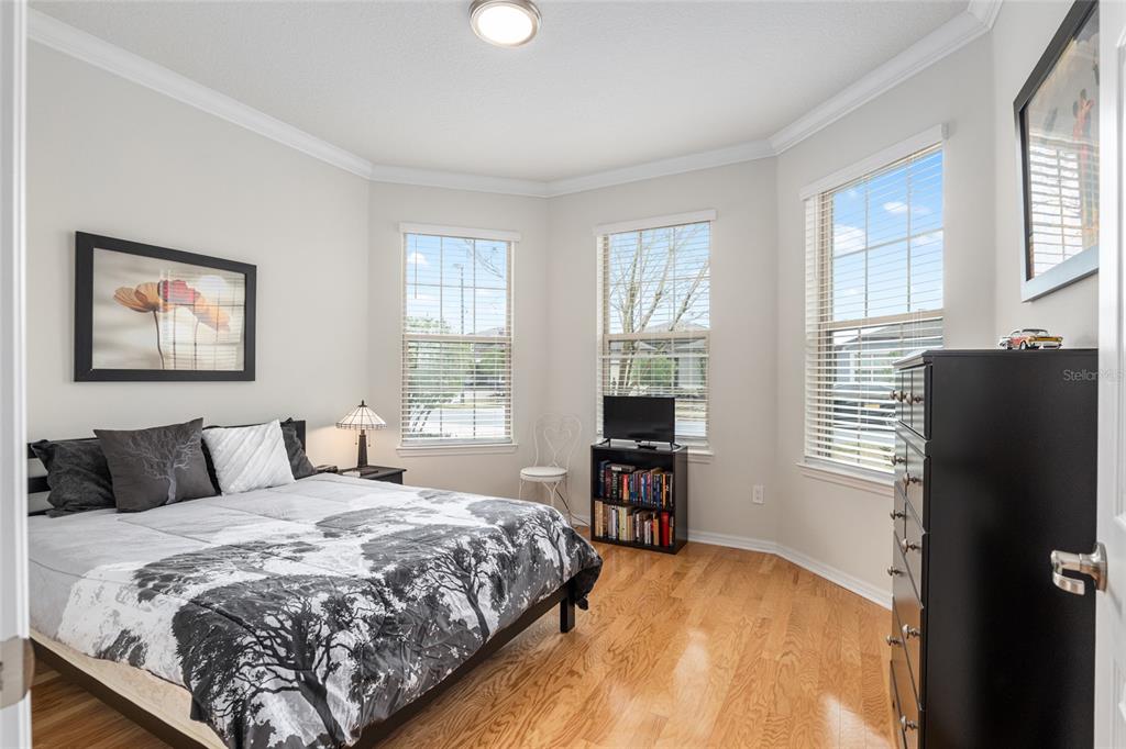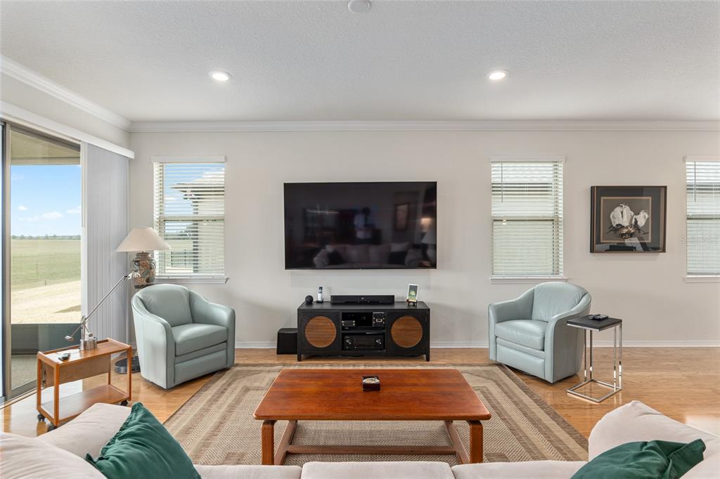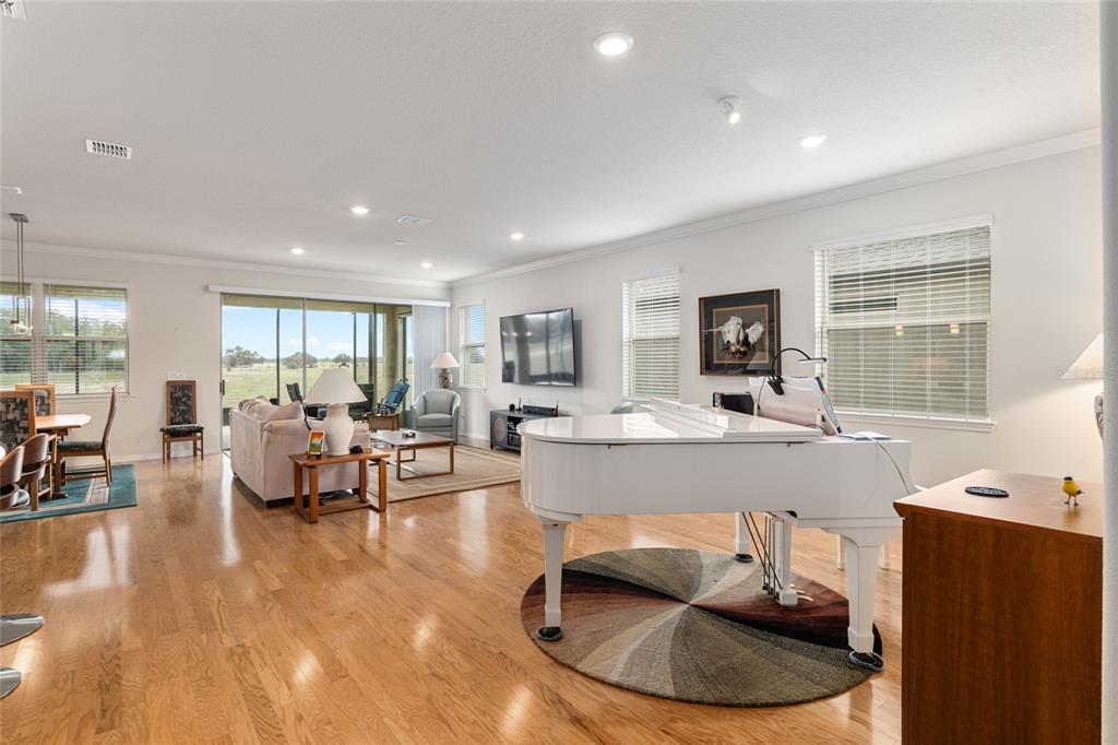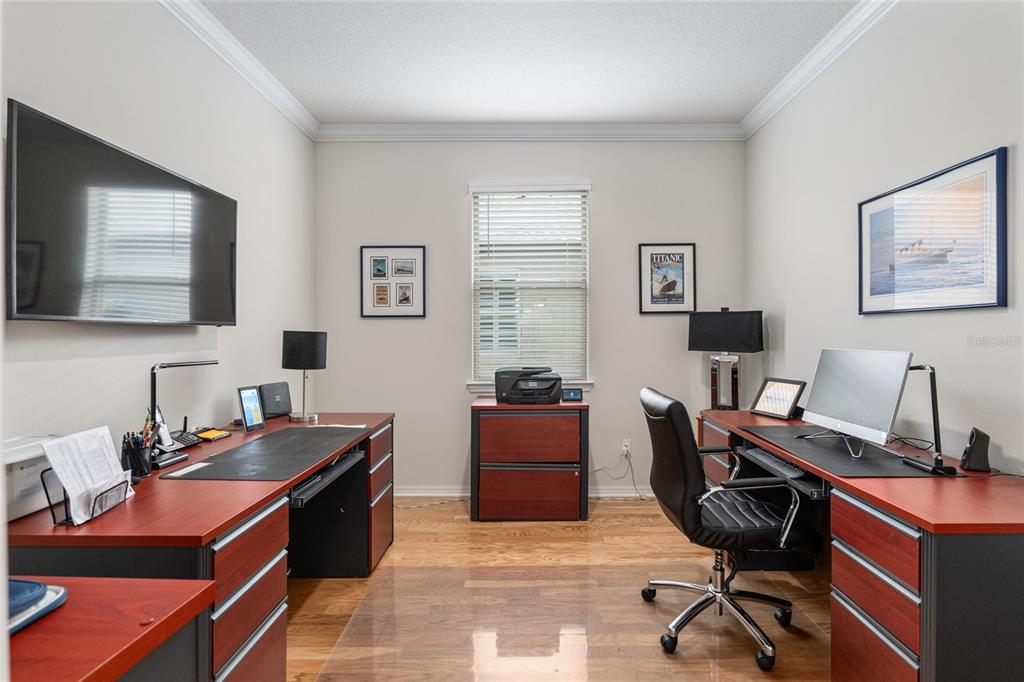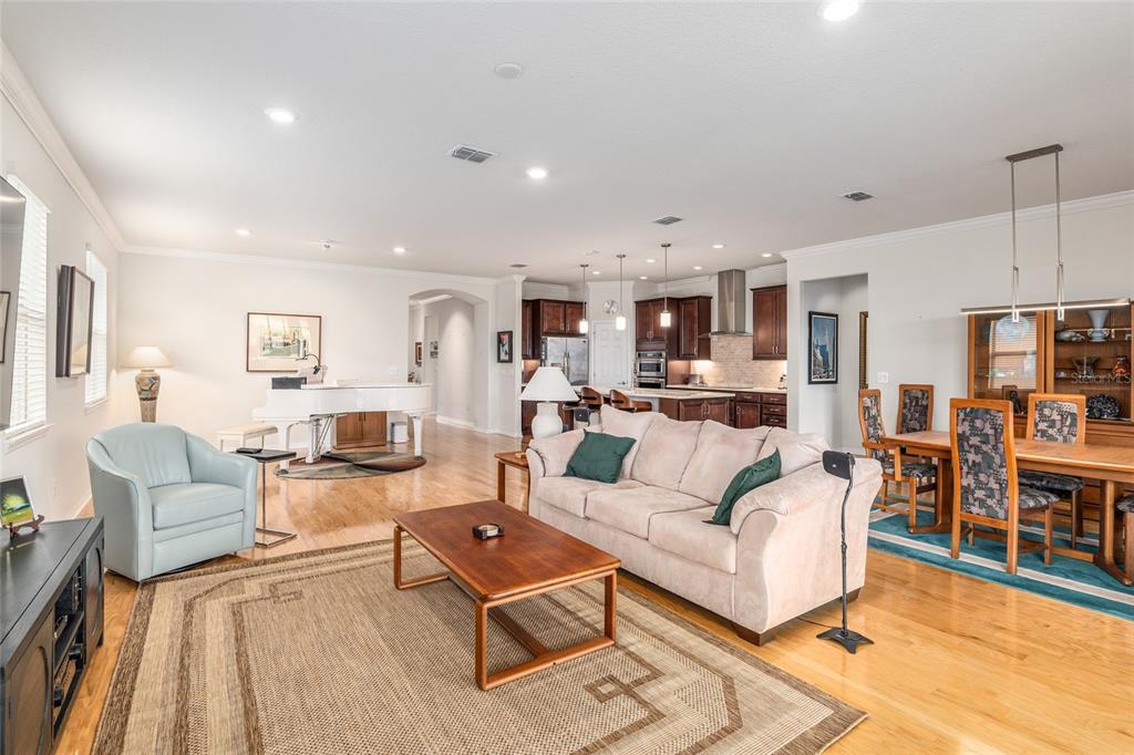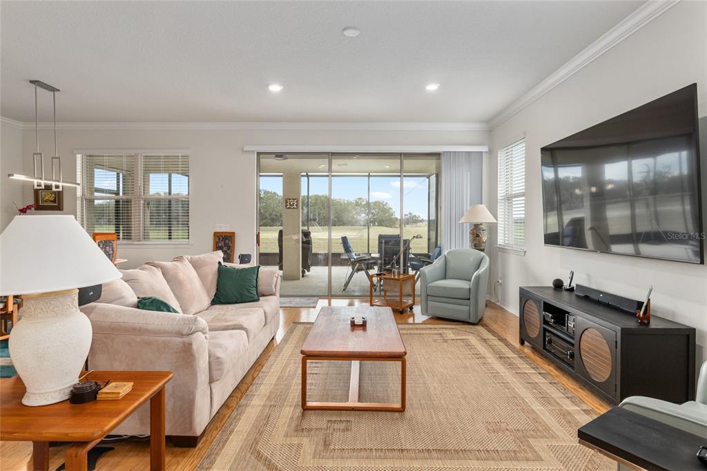 Welcome to stone creek, a popular senior community. this splendid two bedrooms, two bathrooms, and a flex room that could serve as a den or office. you will love this nearly new built home (2019) with gleaming hardwood floors throughout that enhances every room. custom paved driveway and walkway. expanded garage great for extra storage. enjoy a peaceful, and private evening in your outdoor living area in this expanded lanai. privacy is crucial for a serene backyard to relax in your outdoor space. this carefully planned kitchen has a convenient work area. you will love the look of this kitchen with mahogany cabinets, quartz counter tops, stainless appliances, contemporary backsplash and pantry. a large island with counter stools for small intimate dining. triple tea lighting over island. modern convertible wall mount stainless steel range hood. dimmer light switches. recess lighting. the foyer opens up to the kitchen and expanded great room with room for informal dining. crowned molding throughout. master bedroom with walk in shower and large walk-in closet. extra-long vanity in master bedroom with double sinks. a quiet separate bedroom wing for your guest. spacious laundry room with an abundance of wood mahogany cabinets. this lovely neighborhood pride is reflected in the well-kept homes of your future neighbors. stone creek, a secure gated del webb community that has outstanding activities. careful buyers, be sure to visit this one.9581 SW 63RD, OCALA, FL 34481