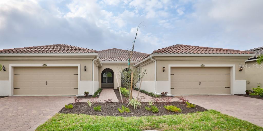 Ready now!!! enjoy your screened in lanai with paver floor and partial water view! this stylish spanish villa is just what you have been looking for. easy upkeep with staggered 12 x 24 tile flooring in all area's but bedrooms and your exterior maintenance it taken care of! nice open floor plan with two bedrooms, two full baths and a study. l shaped kitchen with breakfast bar on an island features upgraded graphite zodiaq quartz counter tops on linen recessed panel cabinets. cabinet features include double waste basket pull out, 42" upper cabinets. stainless steel appliances include range, microwave with vent hood, dishwasher and refrigerator. owner's suite is situated in the rear of the house and has a tray ceiling, owner's bath offers large shower with seat, dual sink raised height vanity, linen closet and water closet. large walk in closet off the bath features double hanging shelved on the largest wall. secondary bed and bath are located at the front of the house. baths feature same luxury cabinets with cloud white zodiaq quartz. study can function as an at home office, formal sitting room or craft room! lots of little extras like utility sink in the garage, 8' doors through out, blinds, ecobee4 smart thermostat, usb ports in the kitchen and owner's suite and more.Villa 2 bedrooms - RENAISSANCE AT WEST VILLAGE