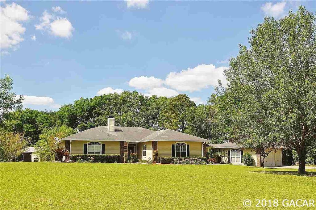 Shaw farms is where city living and country life converge for serenity. situated just outside of alachua and w/in a 20 minute commute to uf health, this pool home is situated on a picture perfect cul de sac 5.6 acre parcel with its own gate. built in 1995, this 3 way split floorplan home was expanded in 2001 to its current size: 5 bedrooms plus a study and 3 baths. mechanical updates include hvac and hwh ~2015, home replumbed ~2012, exterior paint 2016, new roof included prior to closing. main living area is connected by ceramic wide plank wood floors. the family room 2 sided wood burning fp adjoins the study, which is located in one of the 2 guest bedroom hallways. brand new carpet in each of these guest rooms and study. the kitchen features 2 pocket door entries for the family room and sep dining room, a pantry, a bosch dw and stainless appliances. the master suite and bath feature ceramic plank floors, a huge walk in closet, jacuzzi tub, and sep shower all coordinated with modern glass tile. past the laundry room and clutter hall are 2 guest rooms with jack n jill bath – a perfect in law suite. a breezeway connects the 3cg. rv garage with separate boat bay and closed door storage for your tractor and “stuff”.Single Family House 5 bedrooms - Shaw Farms