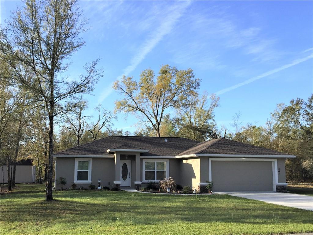 Why wait months for the builder to complete construction? this home is less than one year old, and has numerous extras & upgrades included - all at a great price! this 3-bedroom, 2-full bath, 2-car garage block & stucco home features cathedral ceilings throughout the core of the home, as well as a split-bedroom plan to give privacy. the kitchen is spacious with tons of wood cabinets, granite countertops, & french-door refrigerator/freezer, smooth-top range, built-in microwave, & dishwasher, plus a snack bar for those informal meals. the dining room is just off of the kitchen, with patio doors to the screen-enclosed back porch for easy access to outdoor dining or your grill. the view from the screened porch is tranquil, and the backyard also boasts a 12' x 16' shed that you can use as a workshop or for storage of outdoor equipment. other features include an architectural-shingle roof, gutters & downspouts, low-e windows for energy savings, and all placed on a corner lot with convenient access to us hwy. 41, without the traffic. citrus springs community offers parks, including the wesley jones park, featuring tennis courts, playground, basketball court, and more. deed restrictions keep the neighborhood looking like you would want it to, and yet there is only a voluntary $25 annual contribution to the association, and a $20 per year citrus springs msbu fee on your tax bill; what a bargain! grab this one before it's gone!Single Family House 3 bedrooms - CITRUS SPRINGS
