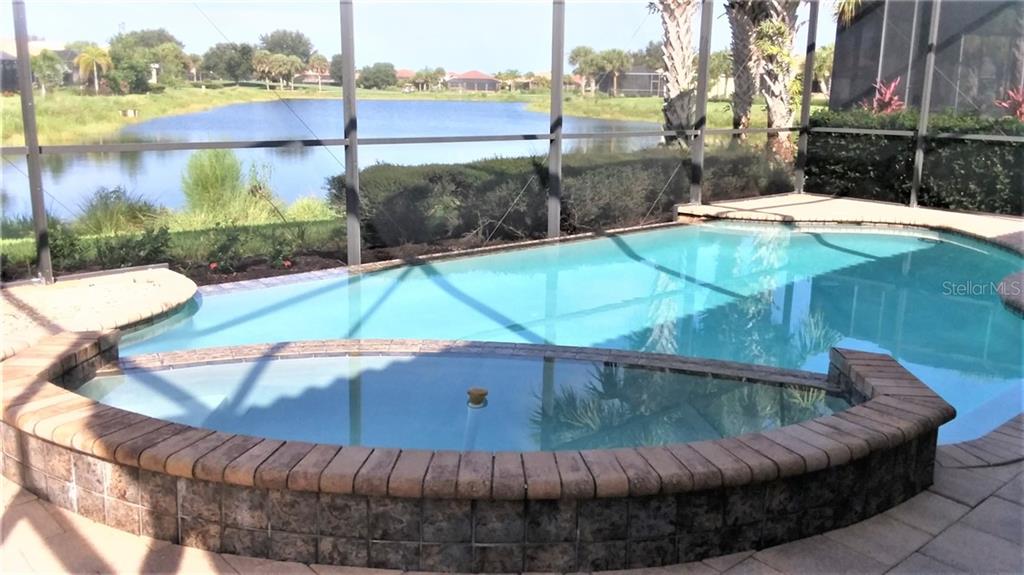 Lowest priced 3/2/2 with pool in this community and it has a great view! panoramic pond views from the spa from this spacious and open home is one of several things which makes this light and bright home a stand out. the salt system infinity pool/spa is heated and has a remote control. lots of shaded space under roof for all weather entertainment. quad sliding doors disappear when open. interior is a great room floor plan with tile in living areas and carpeting in the bedrooms. 3rd bedroom doubles a an office/den with french doors. kitchen has granite counters, wood cabinets, breakfast bar and island. laundry room has a sink. garage is extra wide with two single doors. home comes with hurricane shutters. all of that and its maintenance free so no lawn care:-) cable tv, tennis, community center all covered with hoa. the venetian golf and river club is a gated community and located in north venice just off rt 75 and 10 minutes from gulf beaches & shopping. the river club features exquisite dining with a scenic view of peaceful 70 acre nature park nestled along the myakka river. fitness center & aerobics studio, lap pool, resort style pool & cabana bar plus a tennis center. challenging 18 hole championship golf course.Single Family House 3 bedrooms - VENETIAN GOLF & RIVER CLUB