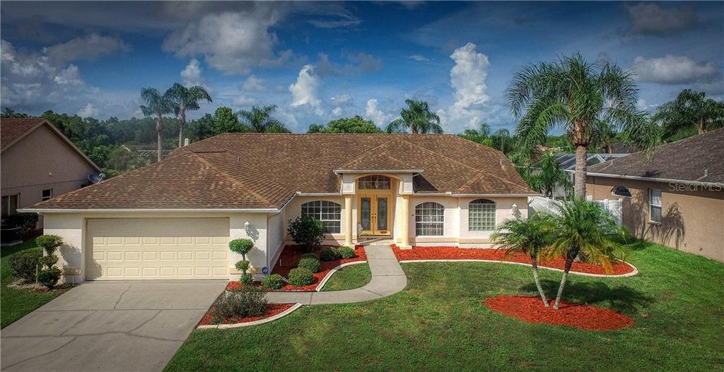 Take a look at this beautiful pool home with lots of natural lighting! this home features 3 bedrooms plus an office/den, 2 bathrooms and a 2.5 car garage. walking into this move-in ready home you immediately notice the large sliding doors that lead out to the inviting pool. this home has a newer a/c, newer garage door and newer water heater and a roof with lots of life. the kitchen features a breakfast bar, eat in dinette area and stainless steel refridgerator and dishwasher. the master suite has large sliders for a private entrance to the pool. the en suite master bathroom has dual sinks, an inviting soaker tub with a separate shower. the secondary bedrooms are generously sized with walk in closets. the pool patio has outdoor speakers to listen to the music while swimming, a large covered area as well as a screened enclosure to enjoy the florida sunsets without worrying about bugs. chelsea place neighborhood has a low hoa fee of $319.00 annually and is located in trinity right on the corridor to east lake and tarpon springs!Single Family House 3 bedrooms - CHELSEA PLACE