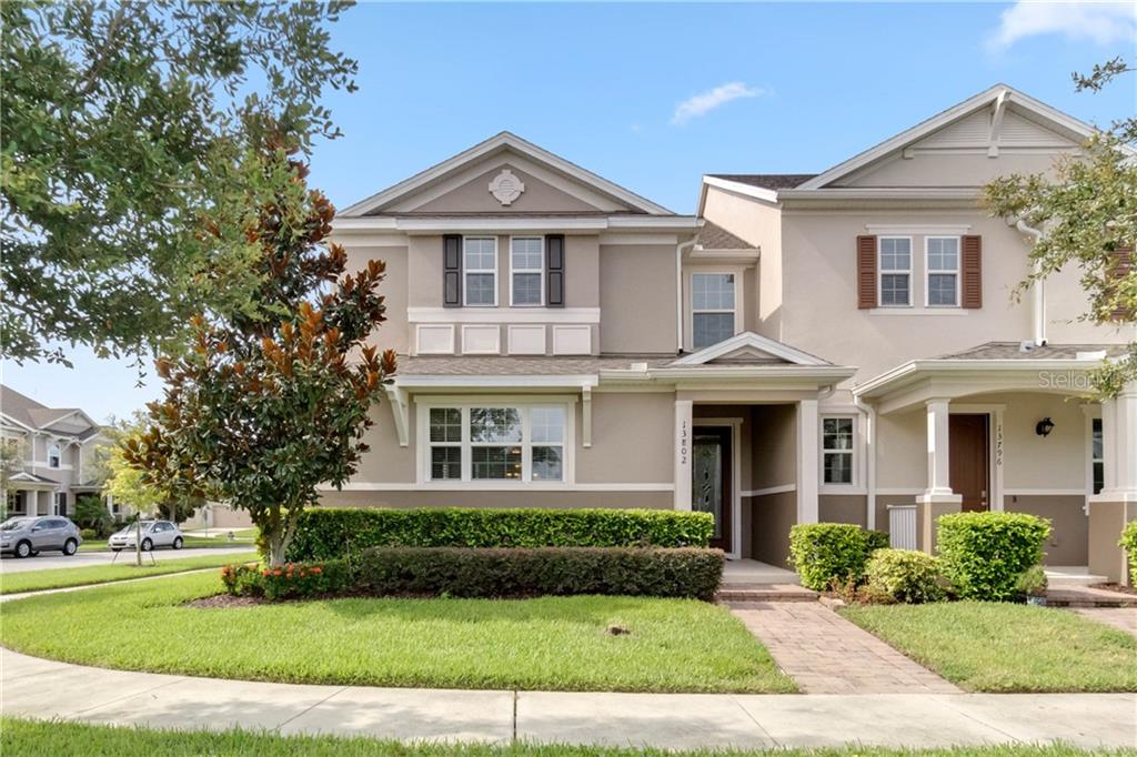 Expect to be amazed by this gorgeous 3bed/2.5bath townhome located in the heart of horizon west. perfectly situated on a true corner lot and walking distance from both community pools, two parks, dog park and horizon west's bike trail. this impeccable end unit boasts of natural light throughout from the moment you walk in. upgraded laminate flooring throughout downstairs, open concept with ample space to entertain friends and family. spacious kitchen features espresso 42" cabinets with crown molding, granite countertops, pull out cabinet shelves, and subtle yet elegant above-cabinet lighting. home includes stainless steel appliances including double oven, refrigerator, microwave and range. kitchen features a beautiful island/breakfast bar and is perfectly located next to formal dining area. upgraded hardware and light fixtures can be found throughout, including recessed lighting along with dimmable canned lights in loft upstairs. walk upstairs and you'll find an incredibly spacious loft, which can be used as an office space, family room, or play area. secondary bedrooms offer ample space along with their own private walk-in closets. master suite features a walk-in closet, ensuite bath with double sinks, standing shower and linen closet. laundry room is located downstairs, along with large screened-in lanai and 2-car garage with finished floors. energy-saving features include upgraded core-fill insulation along with energy efficient double pane windows. only minutes away from winter garden village, close proximity to disney and zoned for a-rated schools - this stunning home is truly a homeowner's dream!Townhouse 3 bedrooms - VINEYARDS/HORIZONS WEST PH 2A