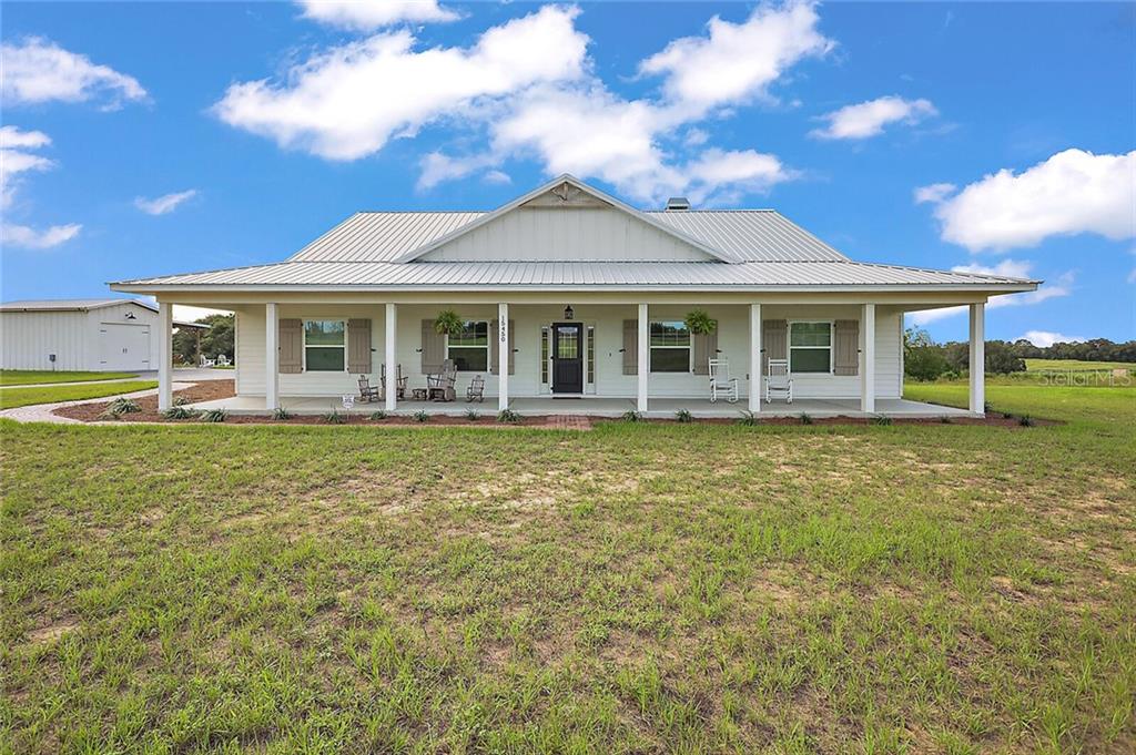 This captivating “farmhouse” style home boarders a private lake plus 3.03 acres of wide-open country. enjoy the peaceful setting with wild turkey, deer and sandhill cranes roaming the property including breathtaking evening sunsets. this 4 bedroom 2 and a half bath home will blow you away with the gorgeous design and flowing floorplan. the inviting front porch lined with rockers is the perfect place to unwind and relax. the interior of the home offers an open floorplan with custom built-ins, a fireplace, crown molding, receding sliding glass doors, high grade vinyl flooring and custom millwork. the kitchen boasts custom cabinets, granite counters, stainless steel sink and appliances, a closet pantry, breakfast bar, upgraded light fixtures and custom backsplash. the master suite features double walk in closets, a separate master retreat and an incredible en suite bathroom with separate double vanities, luxurious shower and a beautiful soaking tub. the spacious guest bedrooms have an abundance of closet storage including an additional bonus space that could serve as an bedroom, office or playroom. store your shoes and backpacks in the adorable mud room adjacent to the laundry room and garage. you have a choice of spending most evenings on your screened lanai or the amazing covered entertainment area right off the detached workshop gathered around the firepit. yes, that’s right…you have an attached two car garage plus an additional detached garage/workshop with attached entertaining area. why build when you could purchase this dream home move in ready?Single Family House 4 bedrooms - N/A
